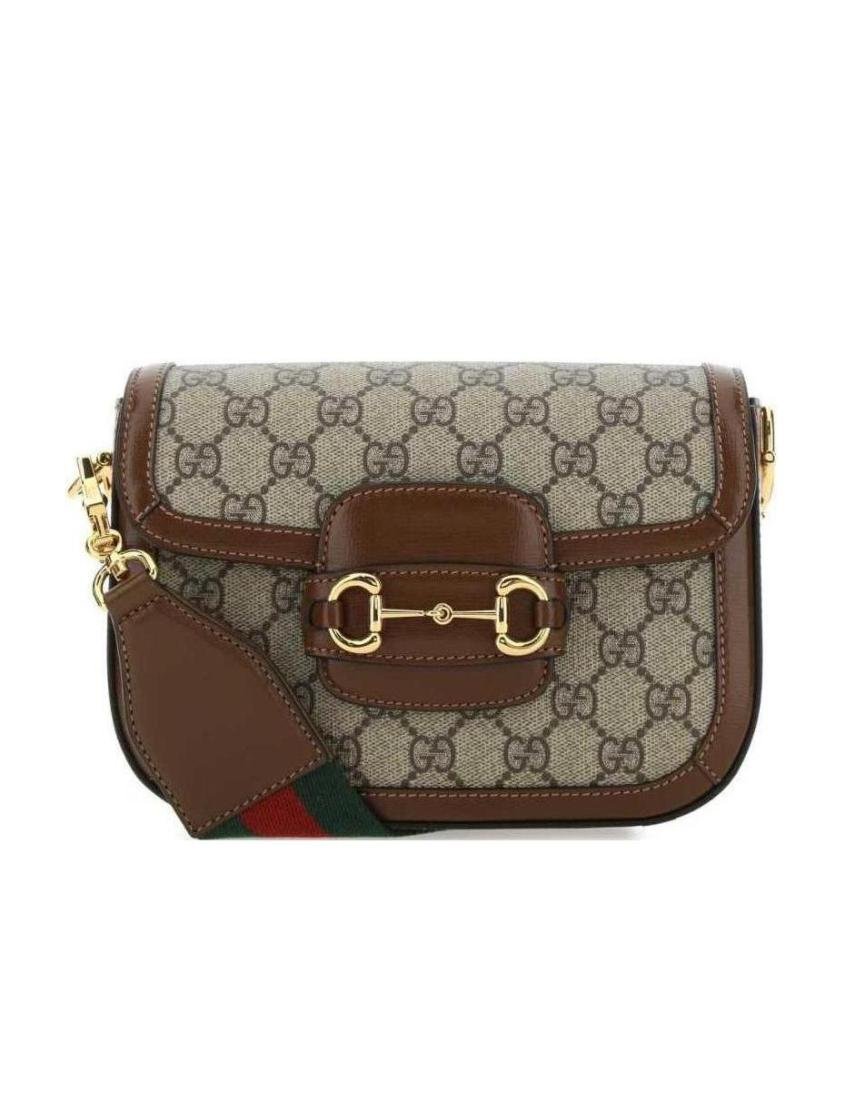 Beige and ebony Gucci Horsebit 1955 mini shoulder bag with logo print decoration, flap design and adjustable shoulder strap. Gold tone accessories red and green webbing horsebit buckle detail Maximum phone size: 167 mm (L) x 76 mm (W) x 9 mm (thick) Removable shoulder straps: nylon webbing shoulder strap (48 cm high), leather shoulder strap (55.5 cm high) (This item is packaged in a dust bag or box)