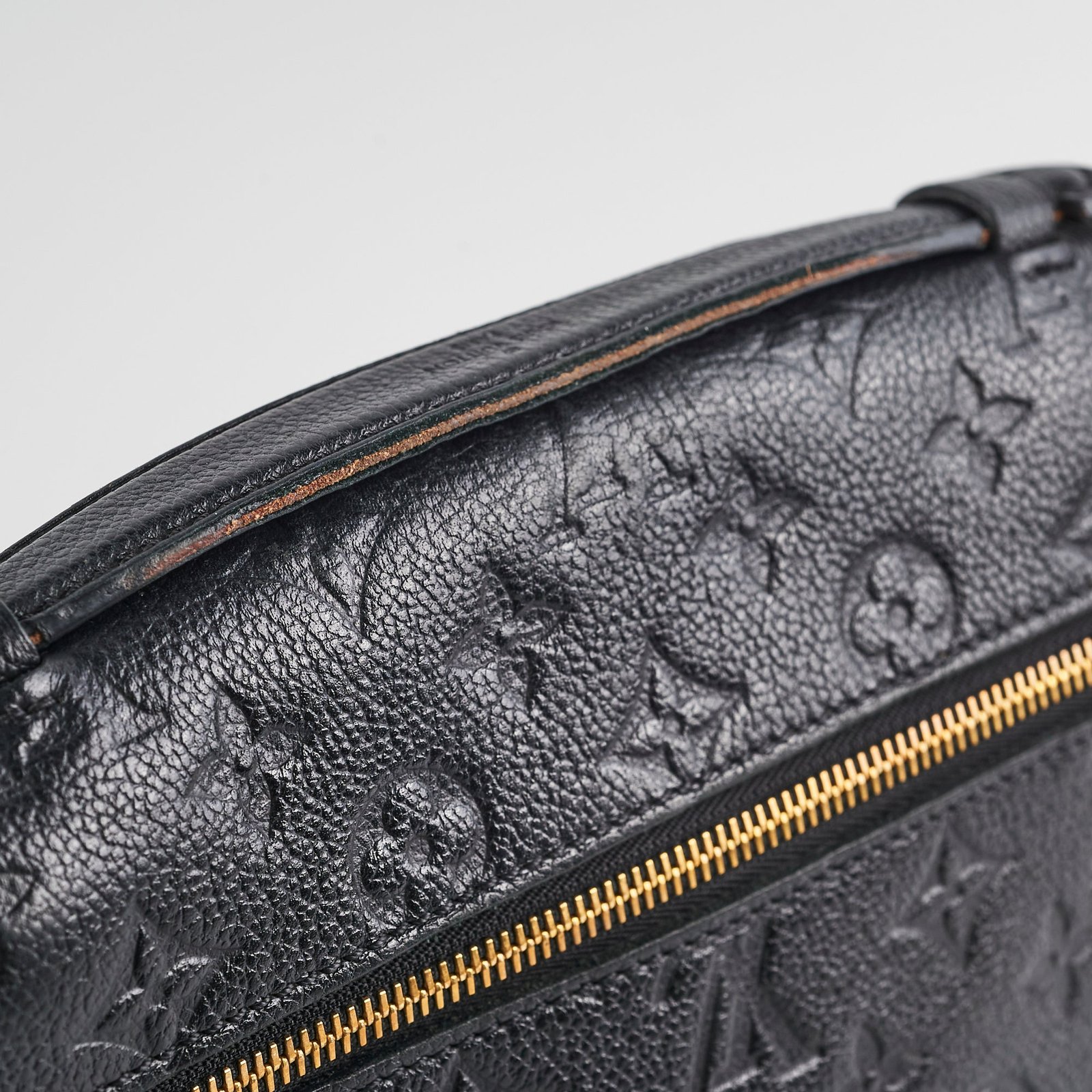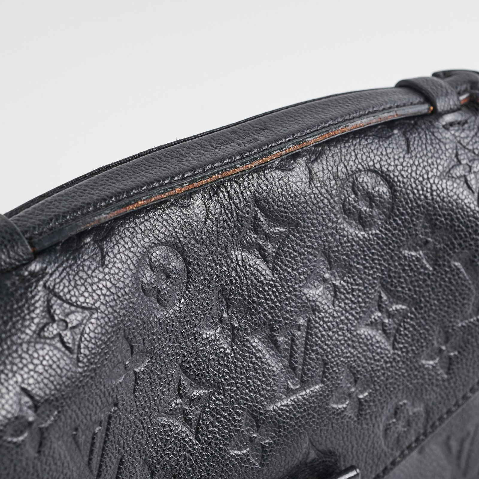 7.5/10 Fair Condition – rubbing on corners, tarnishing and hairline scratches on hardware, peeling on top handle