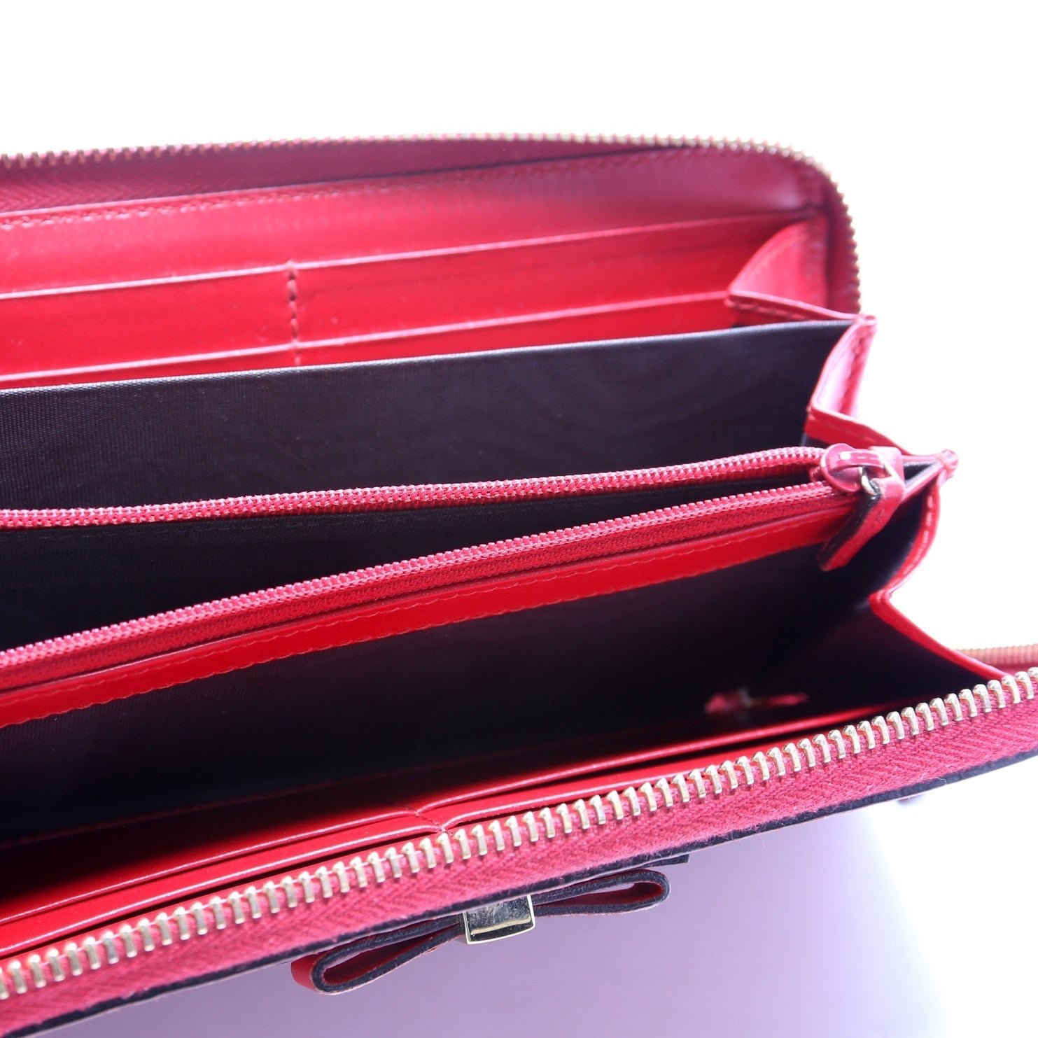 Interior: The interior is clean and free of rips or tears. The interior features one zip closure coin pouch, twelve card slots, and three bill slots.