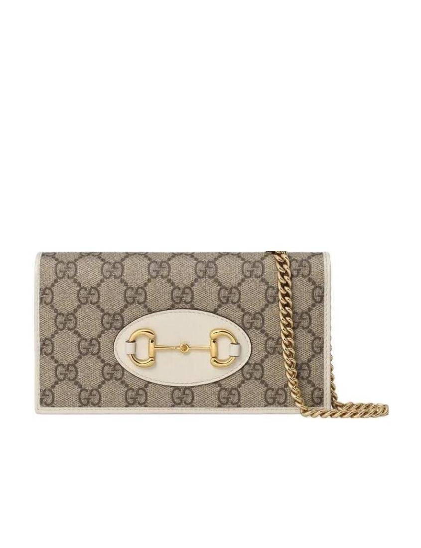 1955 Horsebit chain WOC with gold tone hardware, horsebit buckle detail, 6 credit card slots, 1 zippered pocket, 1 open pocket with chain shoulder strap. Gold tone hardware horsebit detail 6 card slots 1 zippered pocket 1 open pocket removable chain strap snap closure (this item is packaged in a dust bag or box)