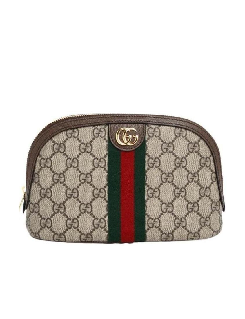 Beige and ebony Ophidia clutch bag with brown piping, red and green webbing, gold tone accessories. (This item is packaged in a dust bag or box)