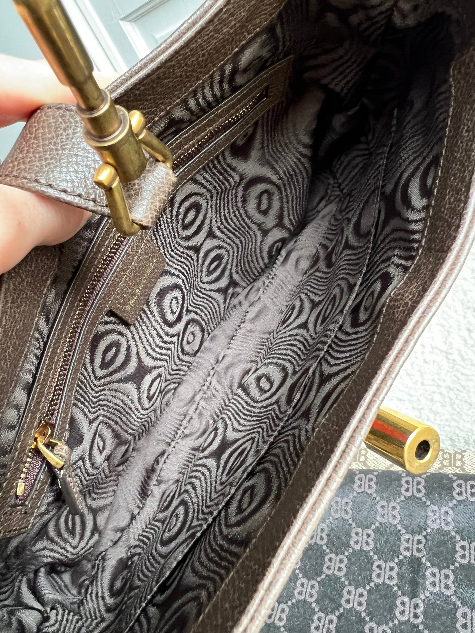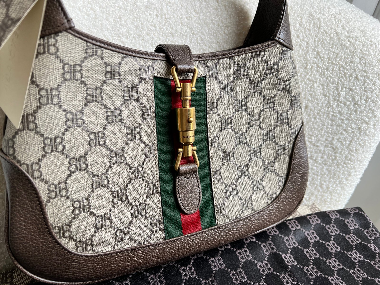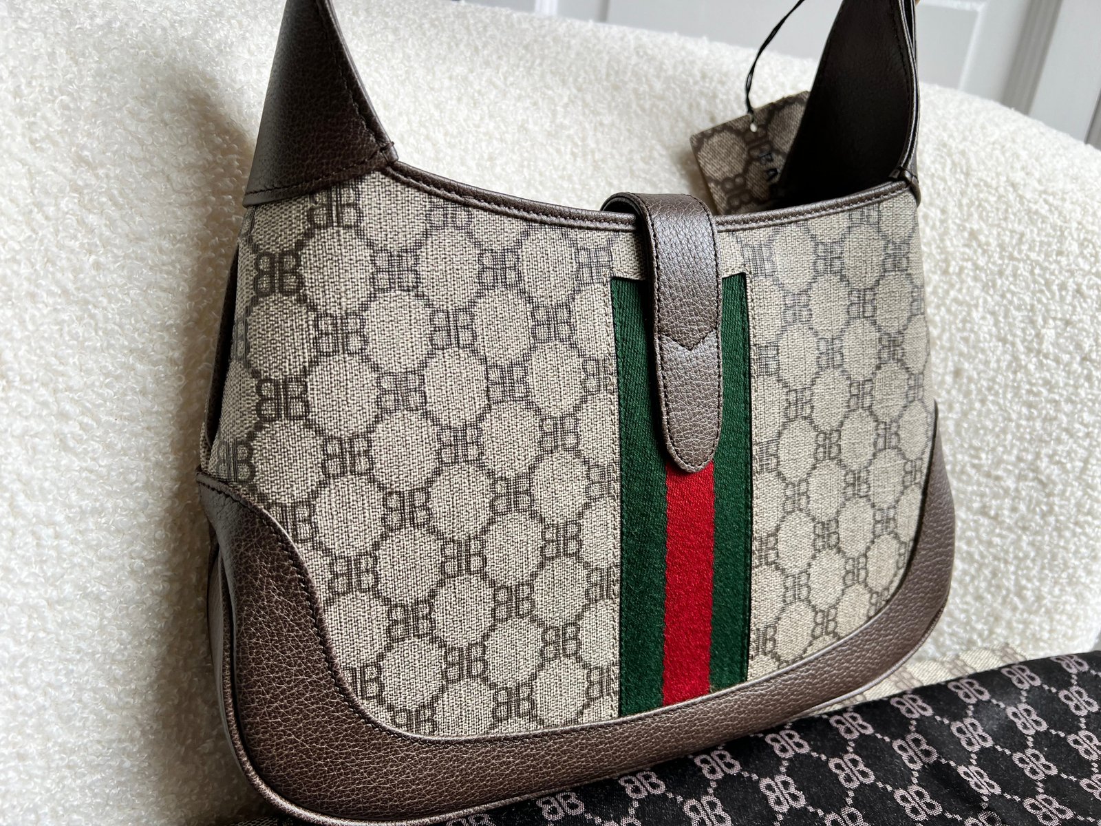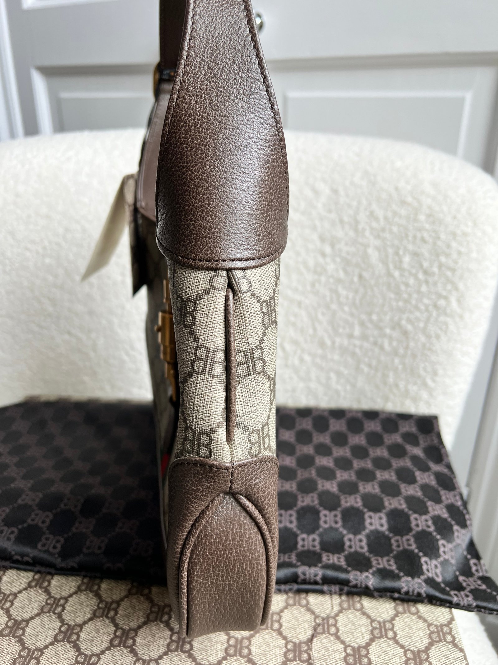 Balenciaga x Gucci Hacker Project Small Jackie Bag in Supreme Monogram Calfskin. This Gucci hobo is beautifully crafted of traditional brown on beige coated canvas with the Balenciaga BB monogram. The bag features a signature red and green web stripe down the center and brown textured calfskin leather trim including the adjustable looping shoulder strap, base, corners, and crossover strap. The crossover strap is secured with an aged, gold-tone piston lock and opens to a brown fabric interior with a patch pocket. This chic bag is part of The Hacker Project collaboration between Balenciaga and Gucci and is rare and highly sought after. Can be carried in hand, worn over shoulder or cross body.