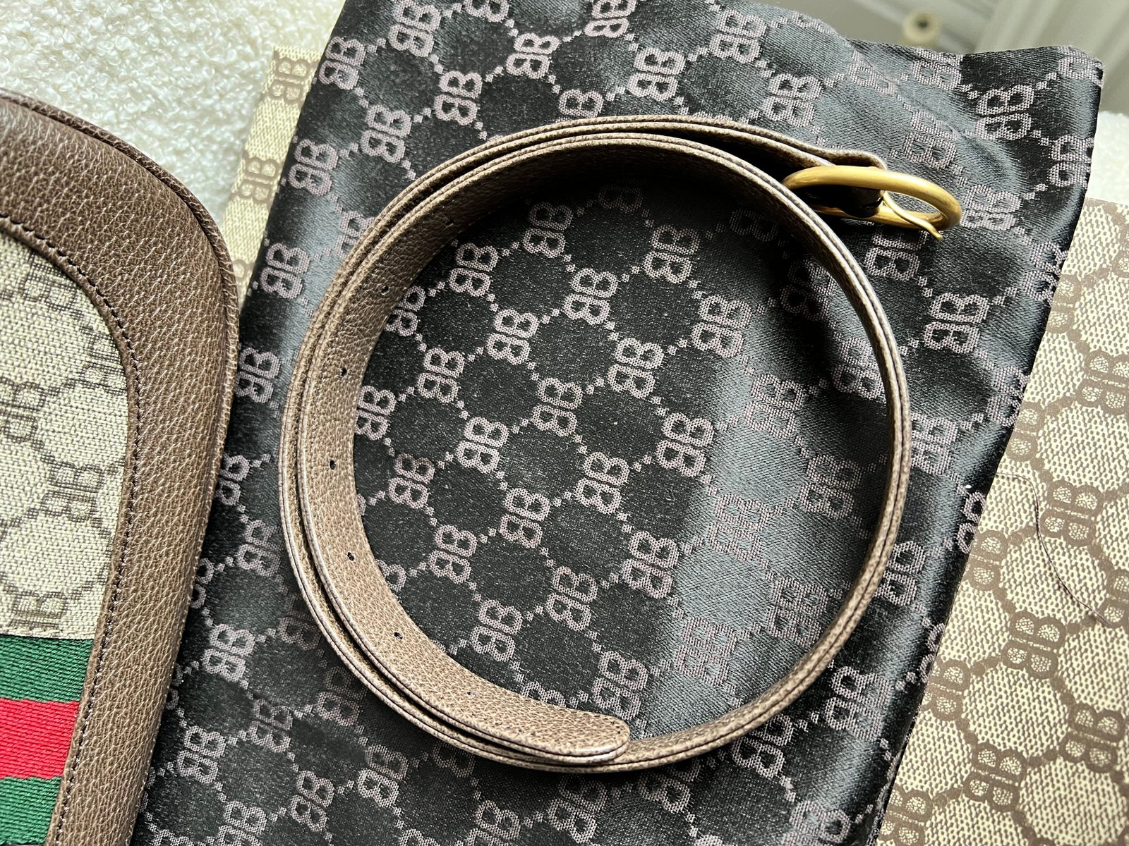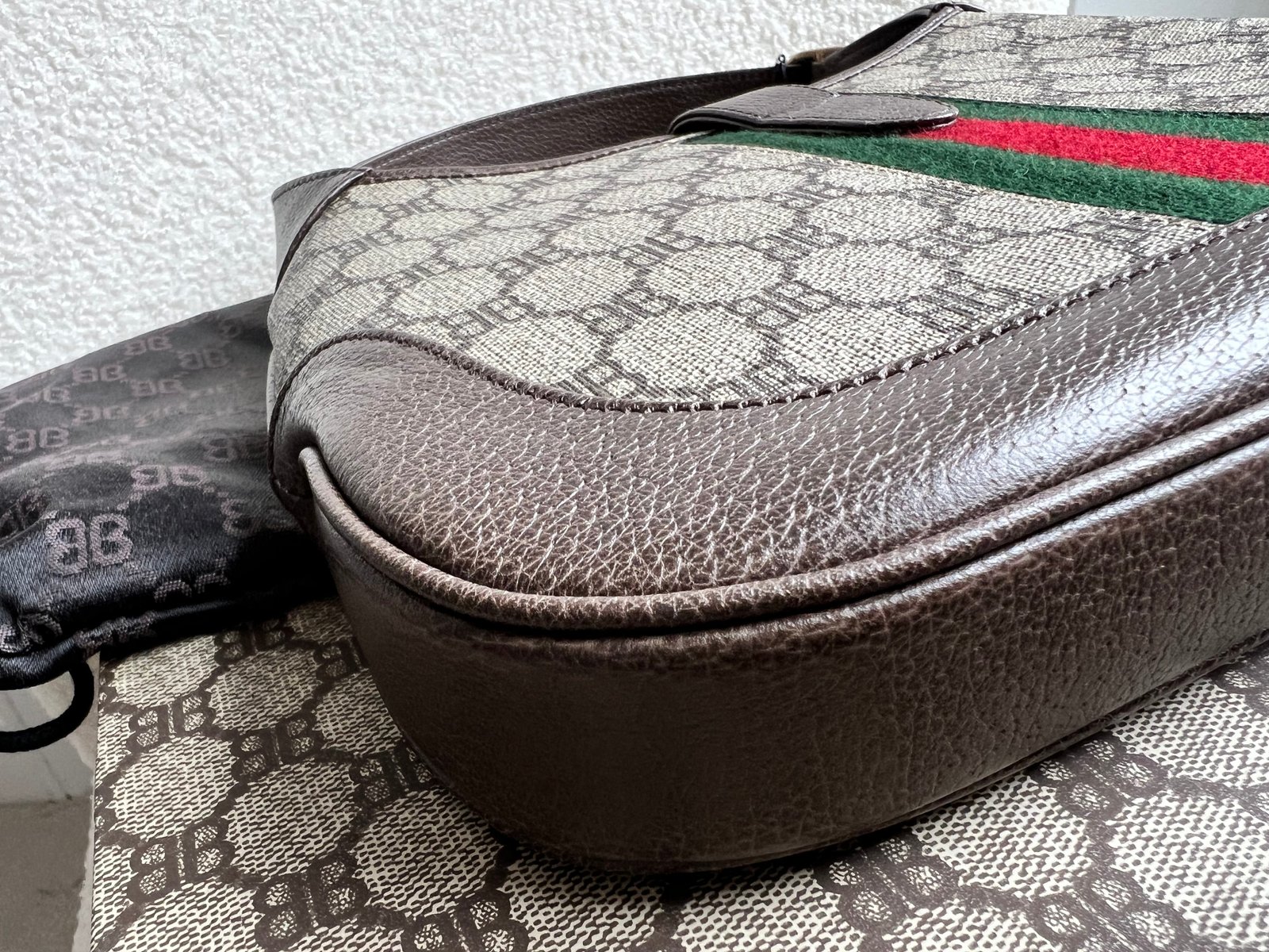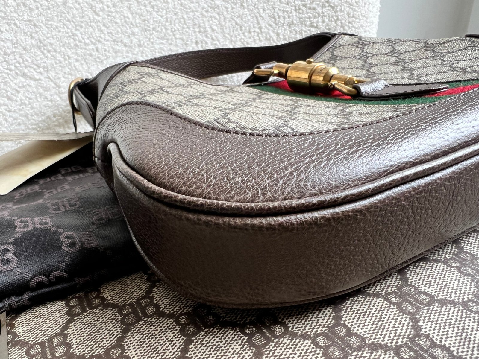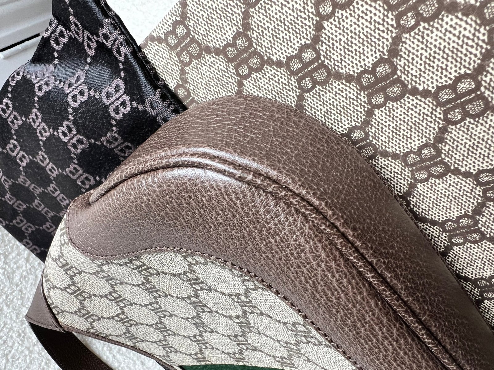 Balenciaga x Gucci Hacker Project Small Jackie Bag in Supreme Monogram Calfskin. This Gucci hobo is beautifully crafted of traditional brown on beige coated canvas with the Balenciaga BB monogram. The bag features a signature red and green web stripe down the center and brown textured calfskin leather trim including the adjustable looping shoulder strap, base, corners, and crossover strap. The crossover strap is secured with an aged, gold-tone piston lock and opens to a brown fabric interior with a patch pocket. This chic bag is part of The Hacker Project collaboration between Balenciaga and Gucci and is rare and highly sought after. Can be carried in hand, worn over shoulder or cross body.