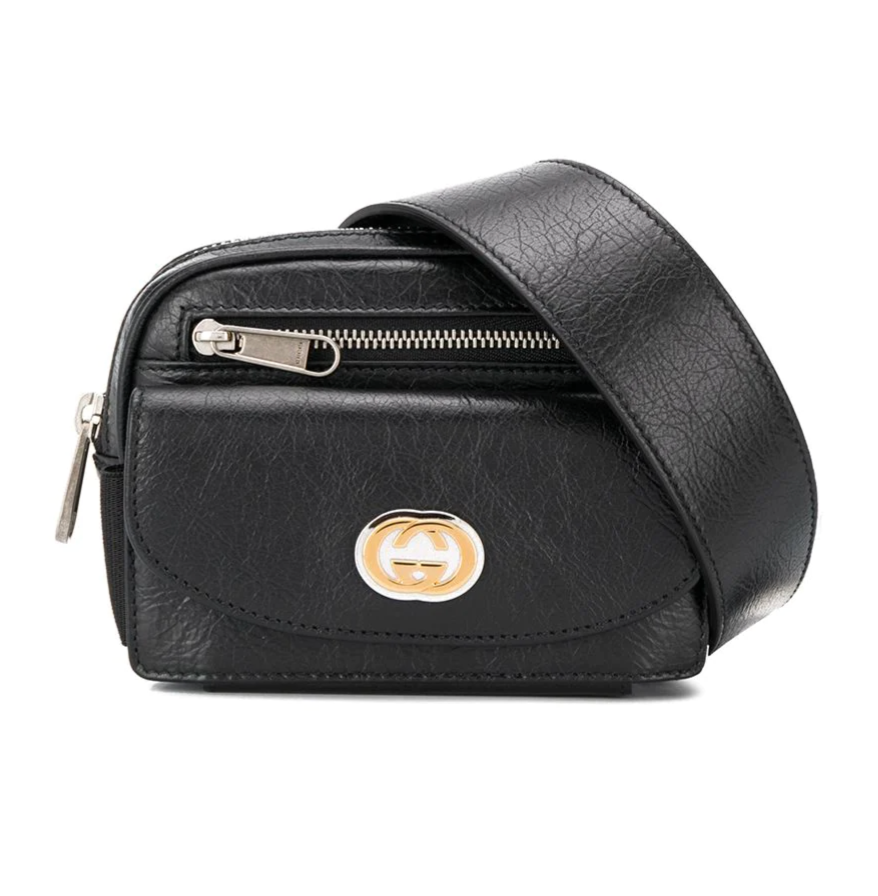 The Gucci Marina Morpheus Crackled Leather Belt Bag in Black is crafted in Italy from a calfskin leather with a cracked, pebbled pattern. This belt bag features a dual tone interlocking GG logo, removable belt, magnetic front pouch, exterior zip pocket, and top zip compartment.