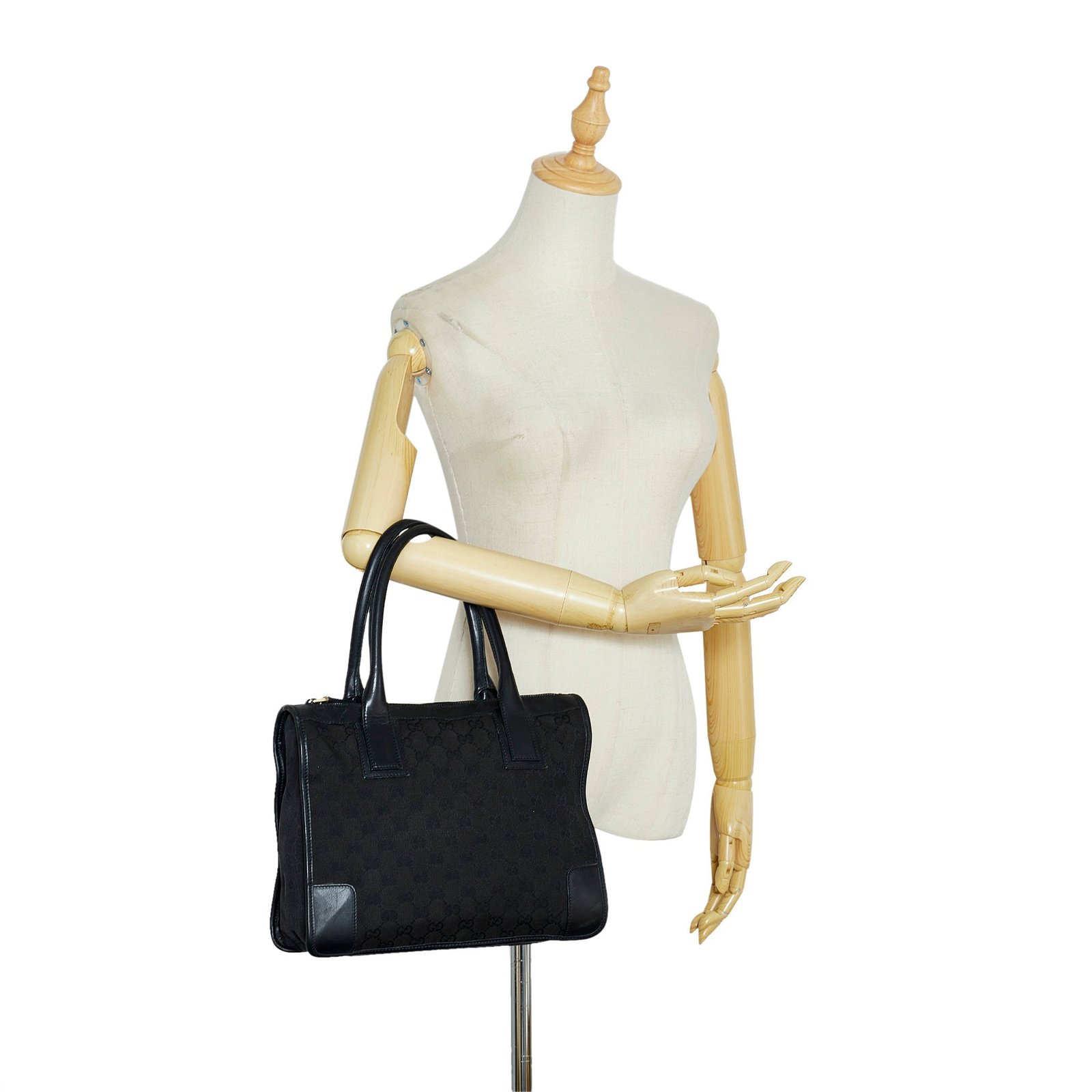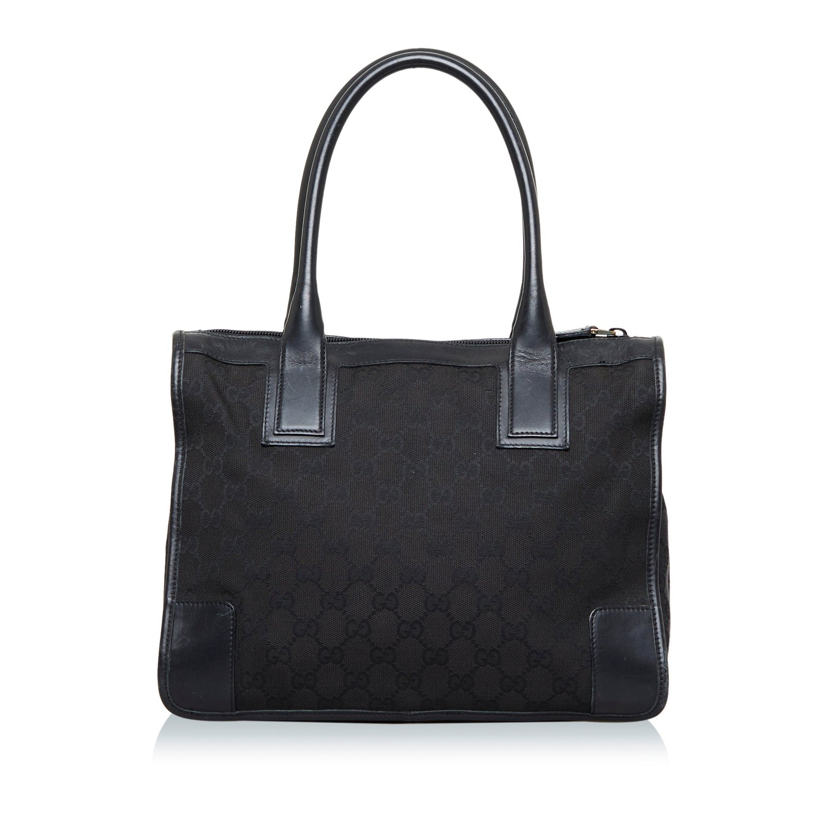 Product Details: Black Gucci GG Canvas Tote. This tote bag features a canvas body, rolled leather handles, a top zip closure, and an interior zip pocket. 9.4′ L x 12.4′ W x 3.1′ D, 5.5′ drop. Serial number 000-0855.