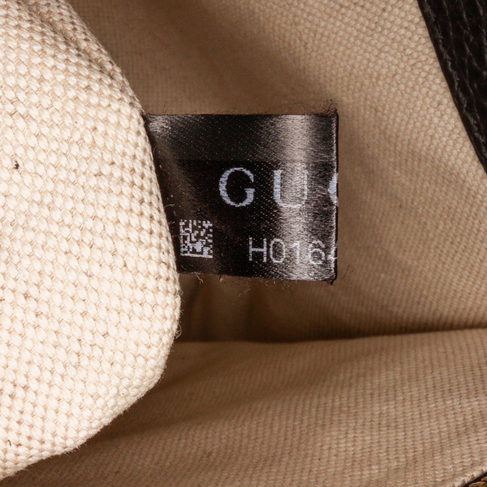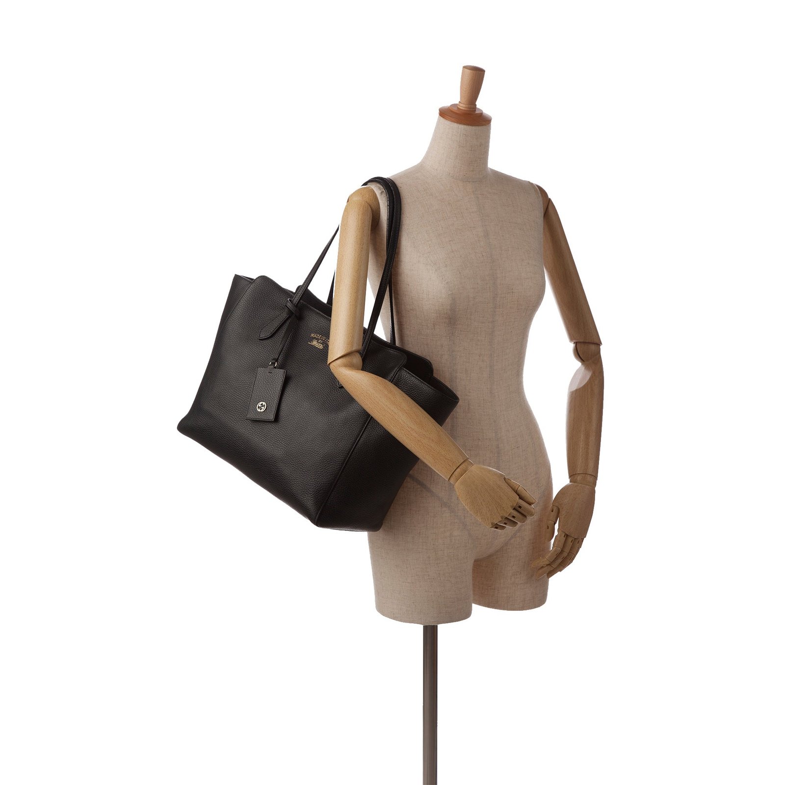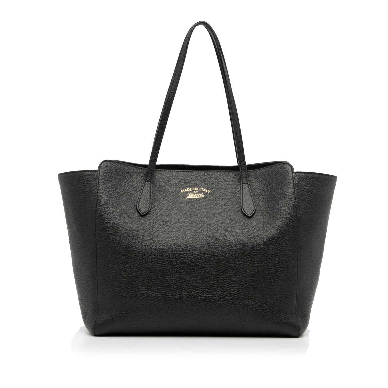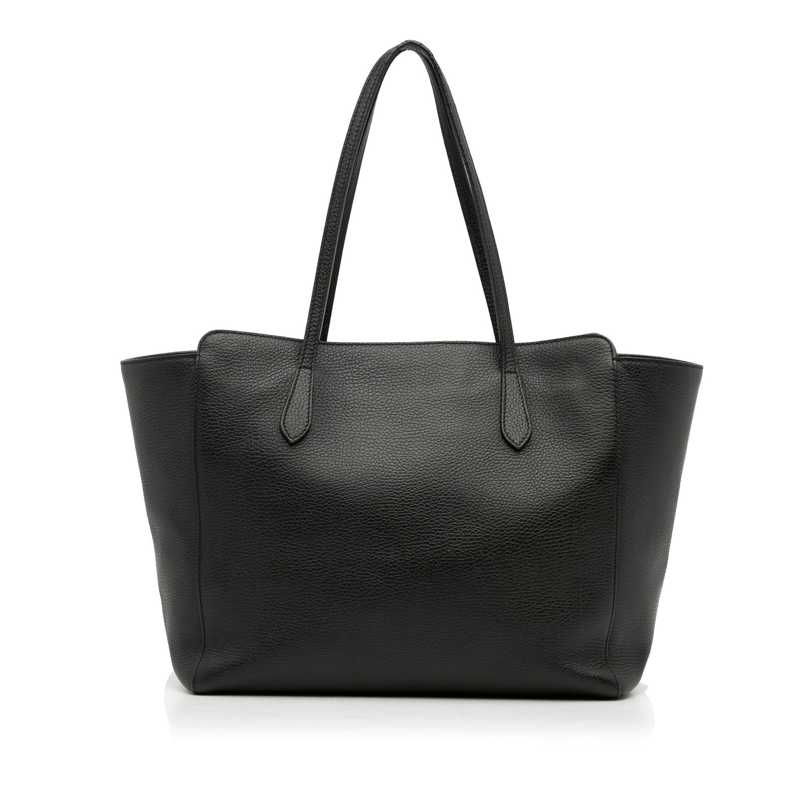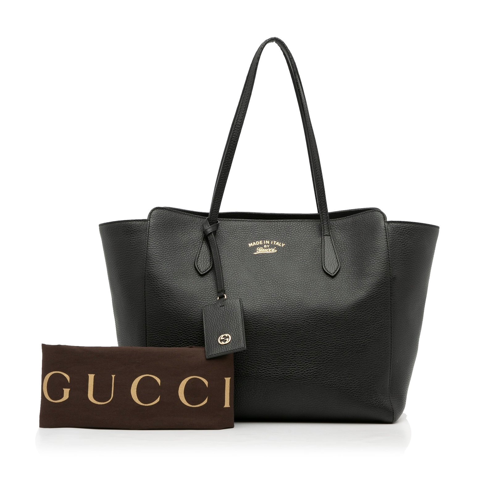 Product Details: Black Gucci Medium Swing Tote. The Swing features a leather body, flat leather straps, an open top with magnetic closure, and interior zip and slip pockets. 11′ L x 13.4′ W x 6.3′ D, 6.3′ drop. Serial number 354397 498879.
