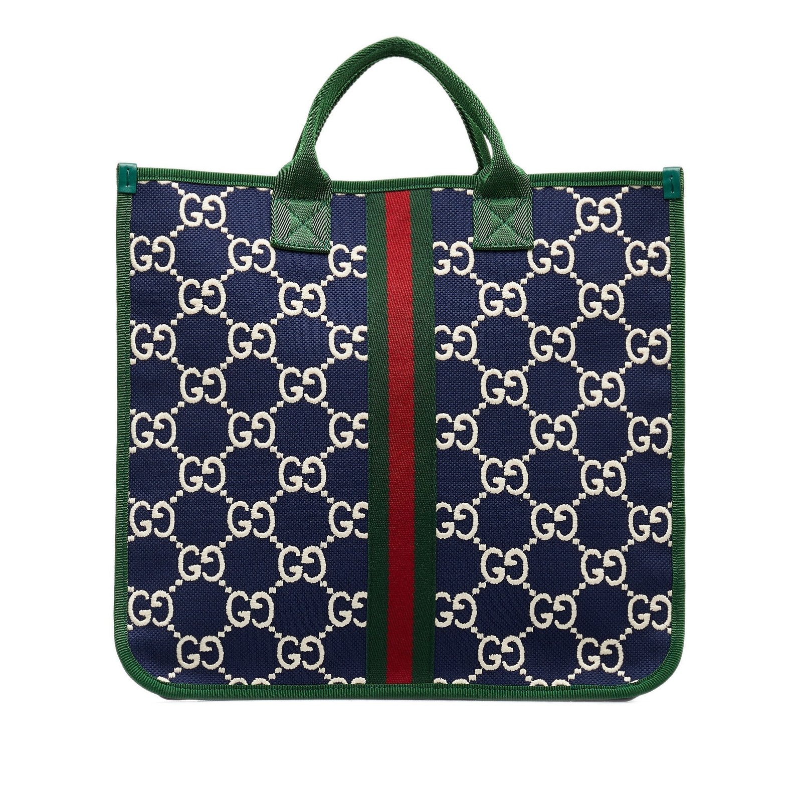 Product Details: Blue Gucci GG Nylon Web Children’s Tote Bag. This tote bag features a nylon body with leather trim and web detail, rolled leather handles, and an open top. 12.2′ L x 13.2′ W x 3′ D, 3′ drop. Serial number 605831 520981.
