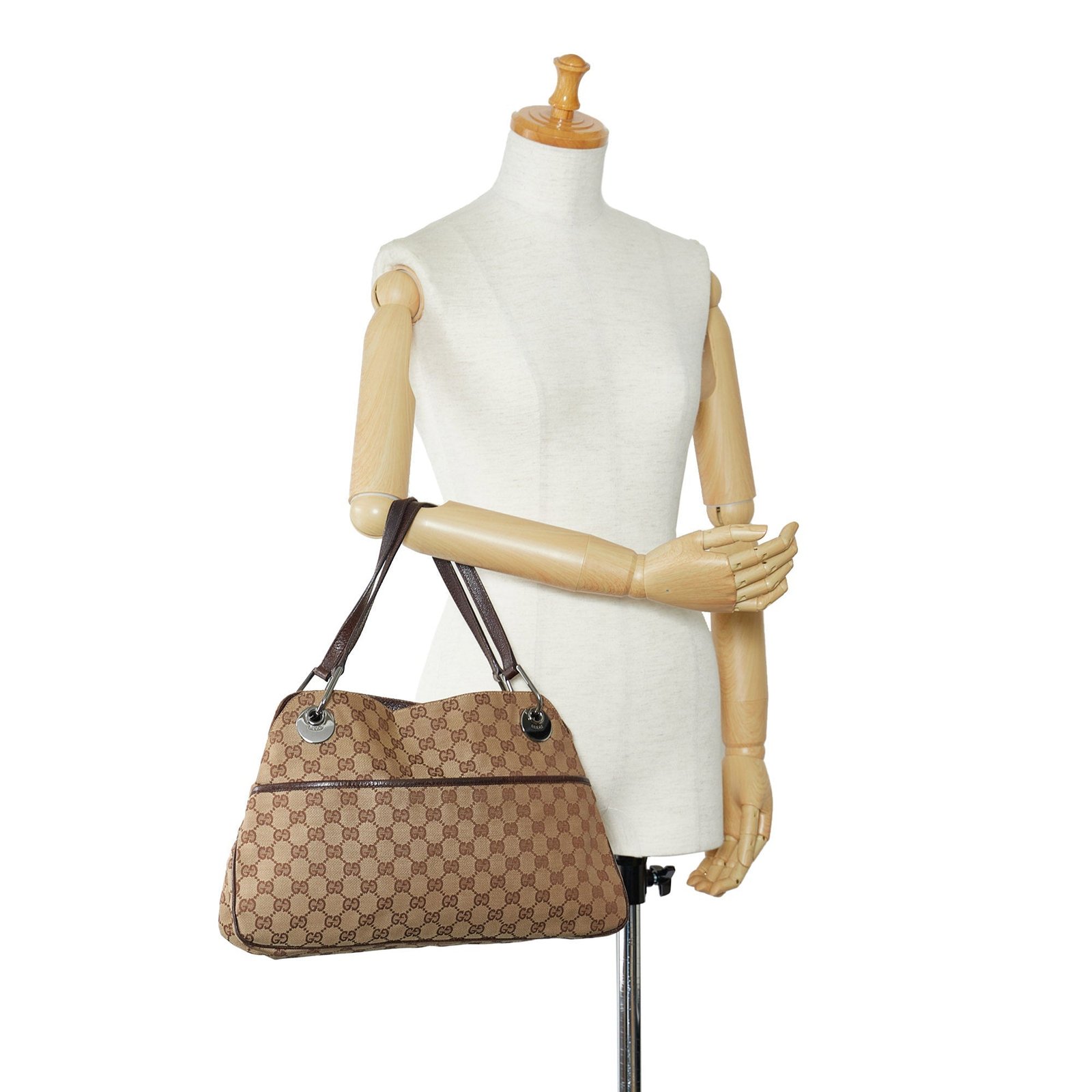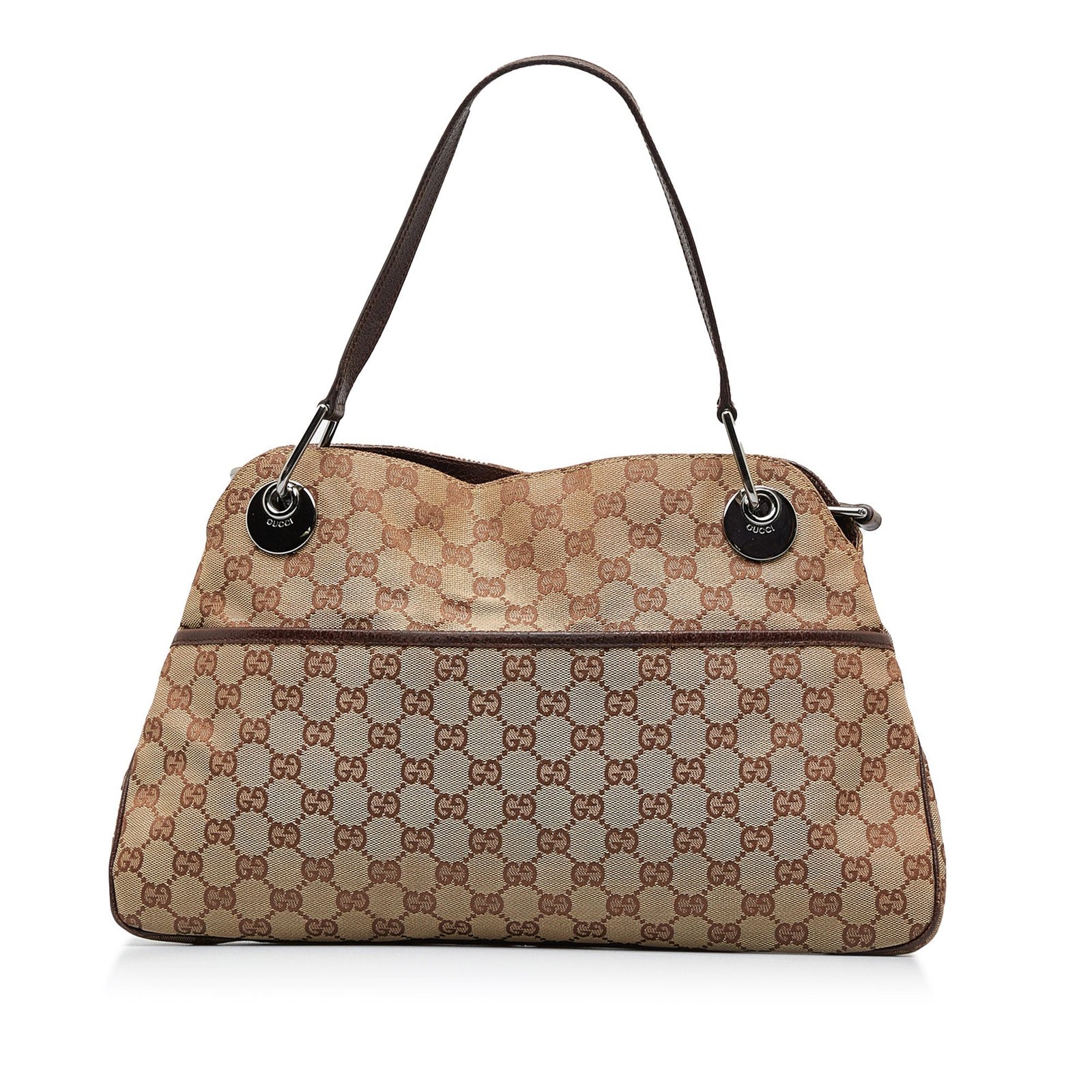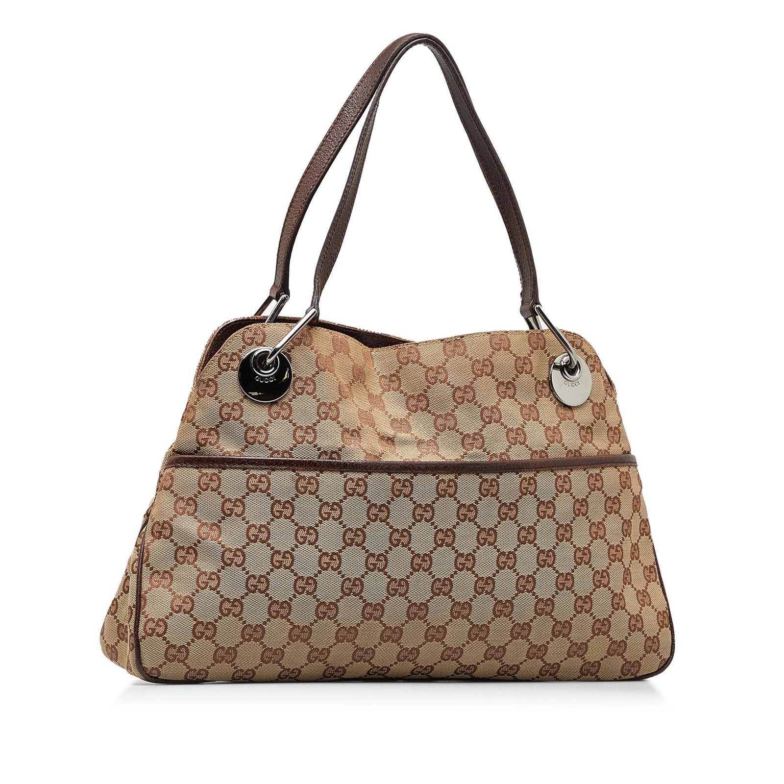Product Details: Brown Gucci GG Canvas Eclipse Tote Bag. The Eclipse tote bag features a canvas body with leather trim, flat leather handles, an open top with a magnetic closure, an exterior front slip pocket, and interior zip and slip pockets. 9.1′ L x 14.6′ W x 2.8′ D, 6.3′ drop. Serial number 121023 1669.