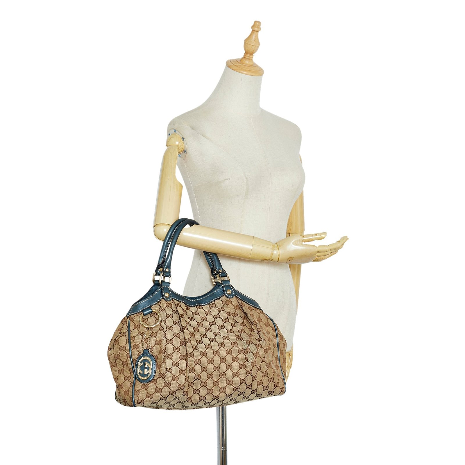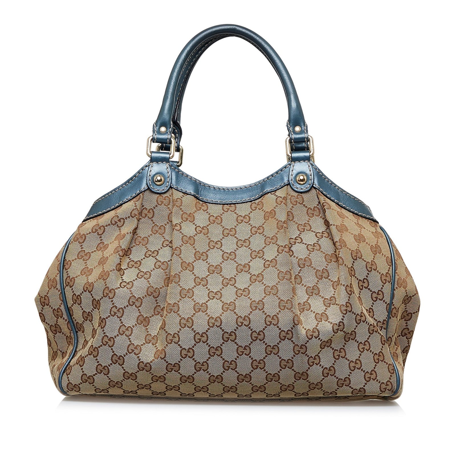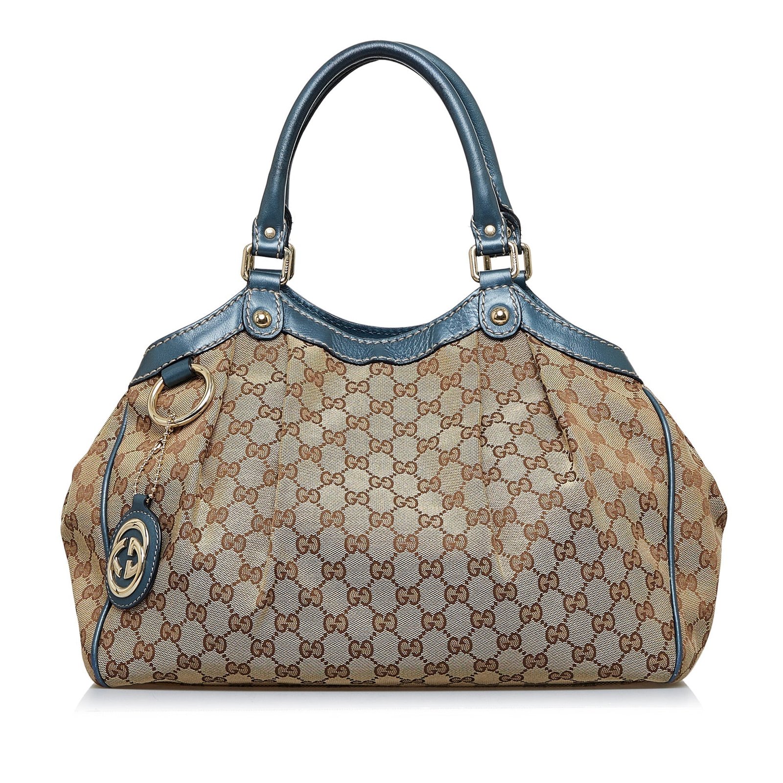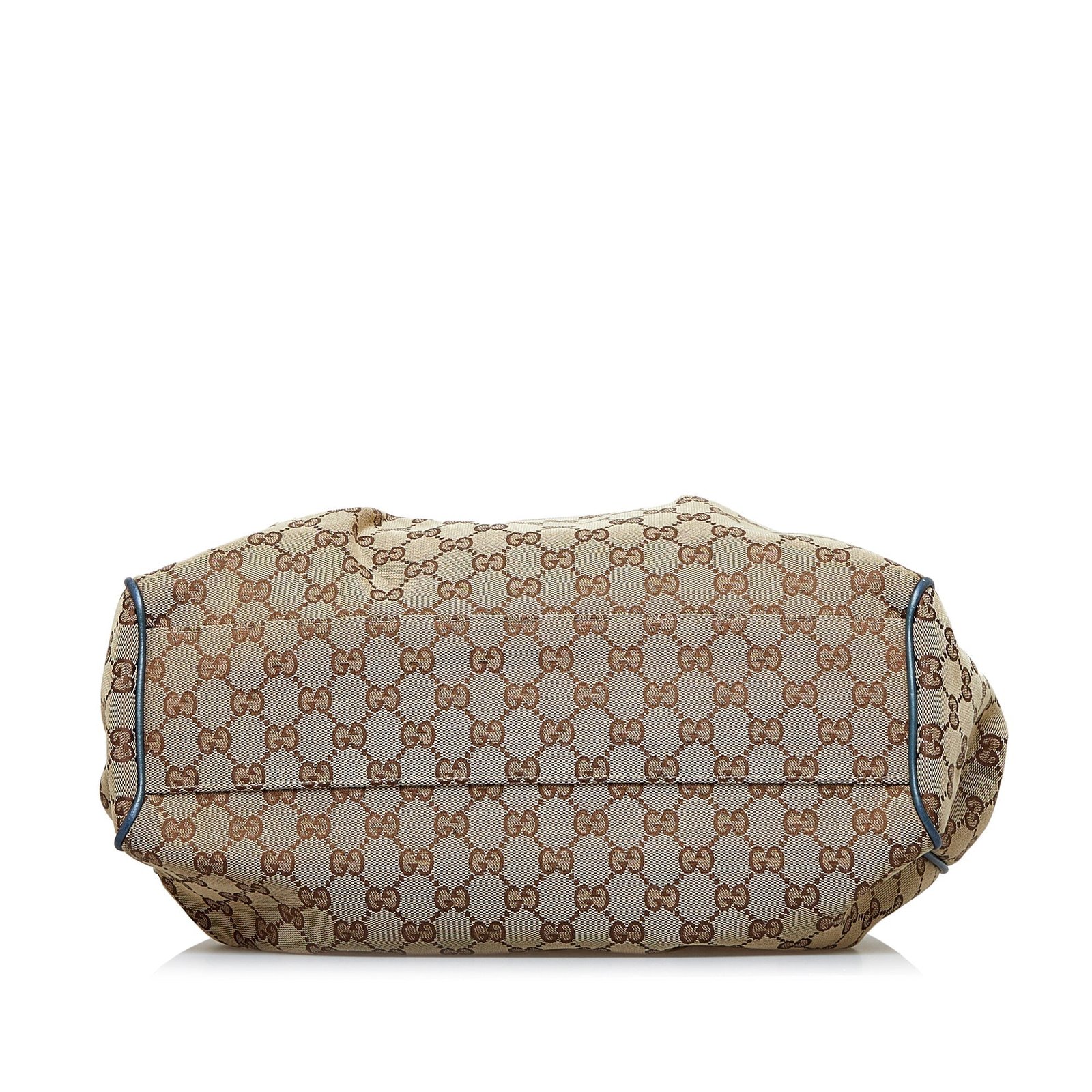 Product Details: Brown Gucci GG Canvas Sukey Tote Bag. The Sukey features a canvas body, rolled leather handles, an open top with magnetic snap closure, and an interior zip pocket. 11.8′ L x 13.4′ W x 4.3′ D, 6.3′ drop. Serial number 211944.