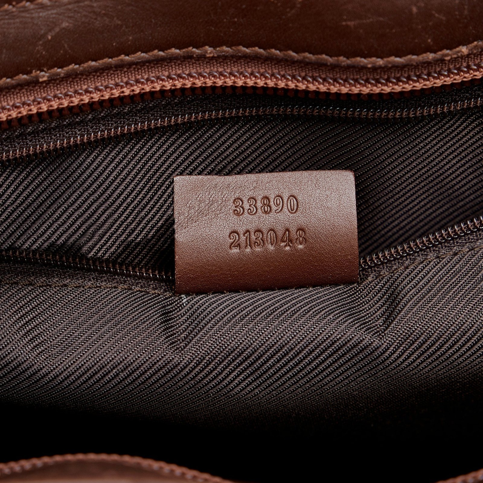 Product Details: Brown Gucci GG Canvas Tote. This tote bag features a canvas body, rolled leather handles, a top zip clousre, and an interior zip pocket. 9.3′ L x 12.2′ W x 3.5′ D, 6.7′ drop. Serial number 33890.