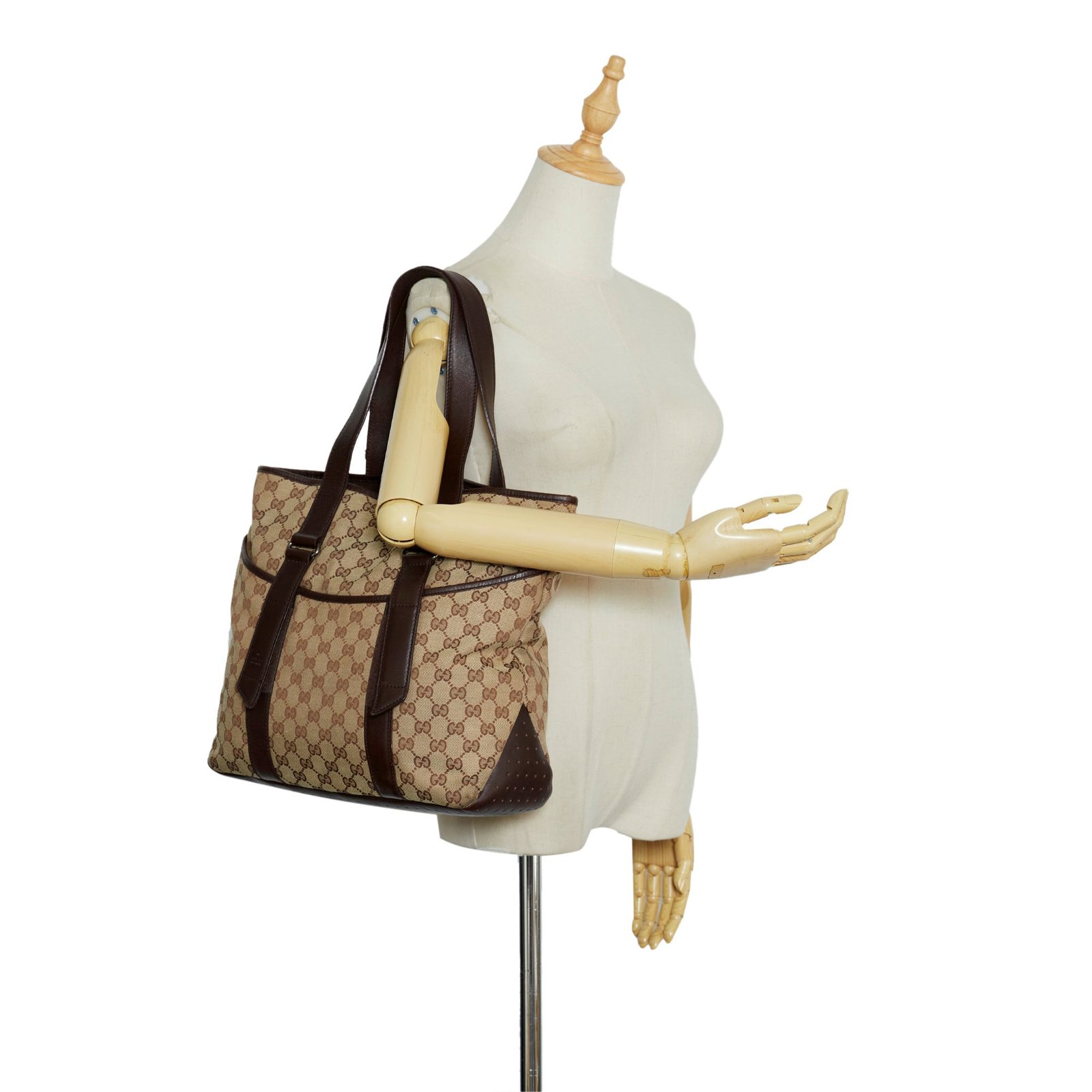 Product Details: Brown Gucci GG Canvas Tote Bag. This tote bag features a canvas body with leather trim, front exterior slip pockets, flat leather straps, an open top, and an interior zip pocket. 11.4′ L x 13.4′ W x 4.5′ D, 8.5′ drop. Serial number 145971.