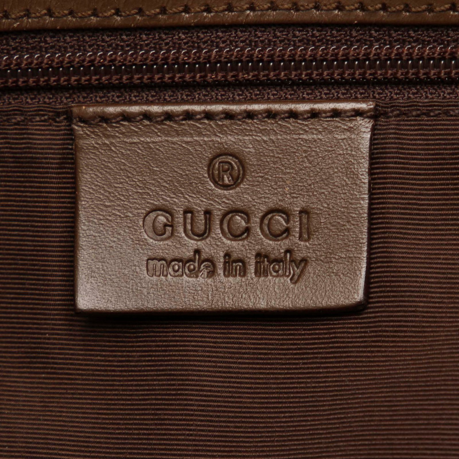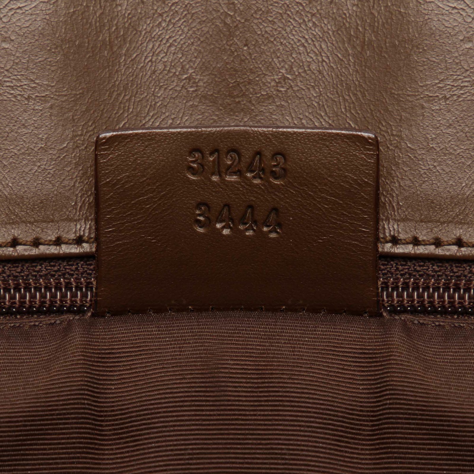 Product Details: Brown Gucci GG Canvas Web Tote Bag. The Web tote bag features a canvas body, flat leather straps, an open top, a yellow and black vintage web and an interior zip pocket. 12.2′ L x 12.6′ W x 4.3′ D. Serial number 31243 3444.