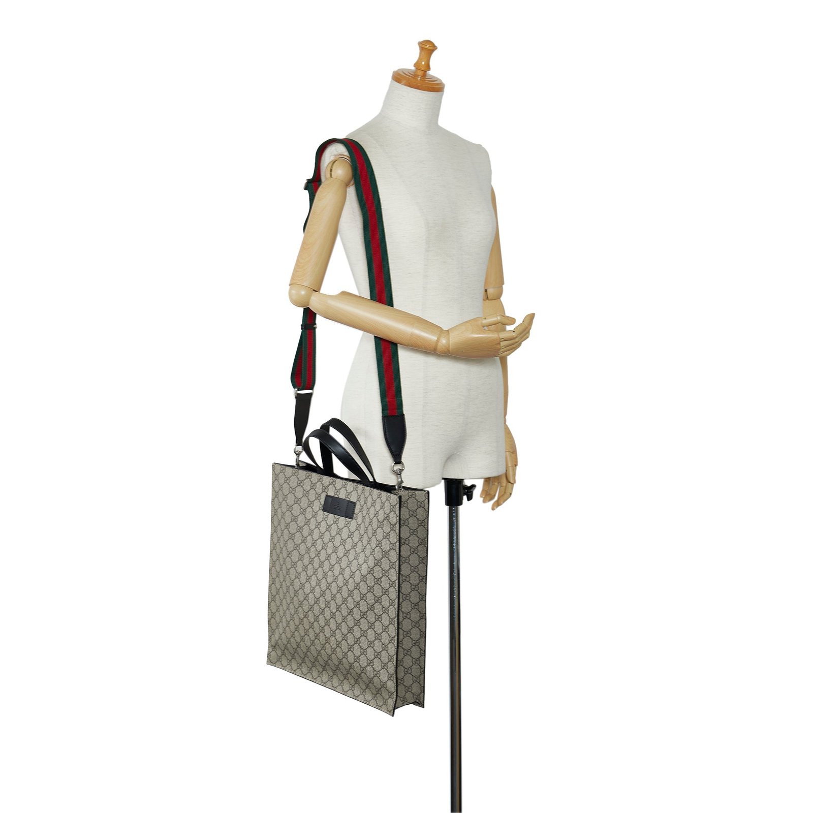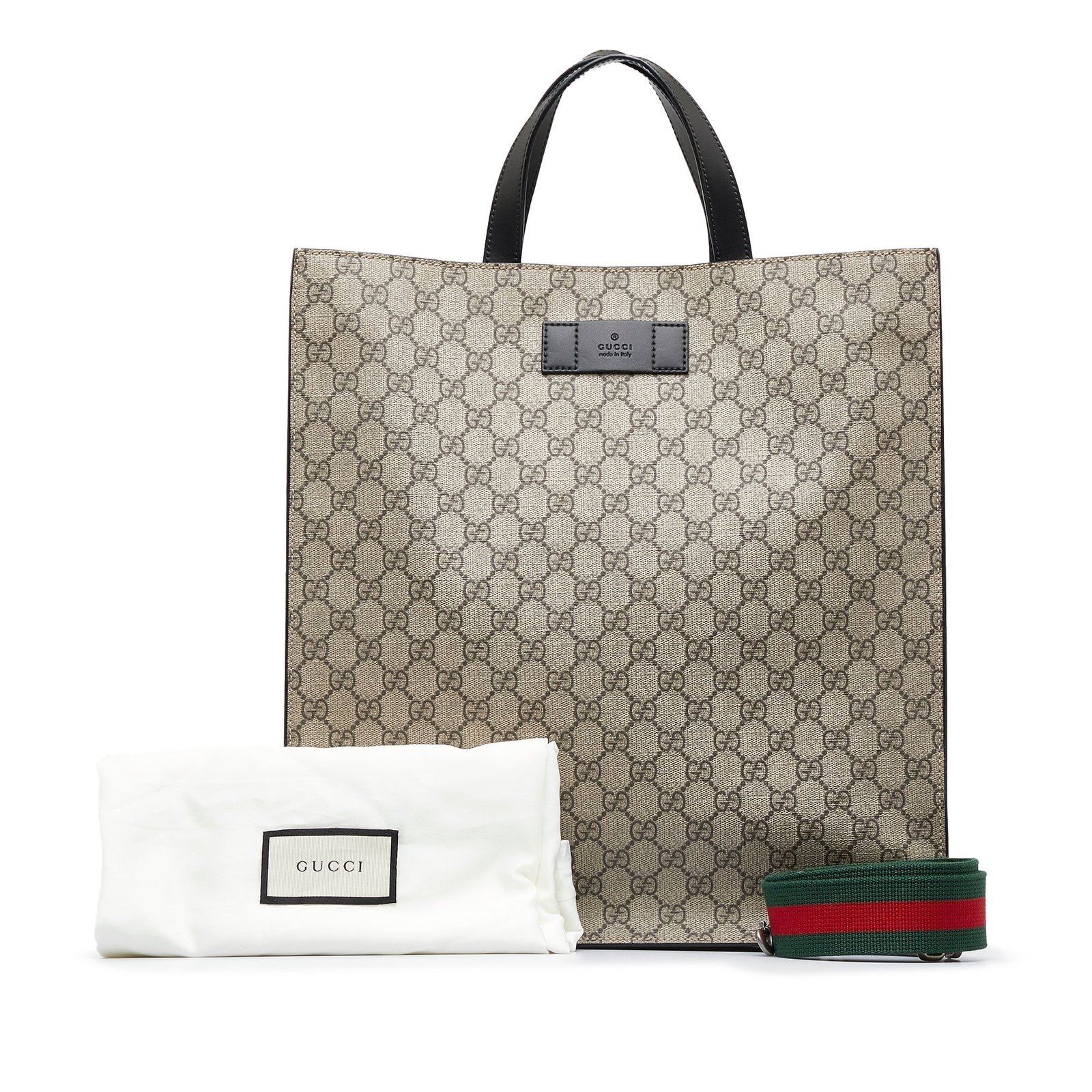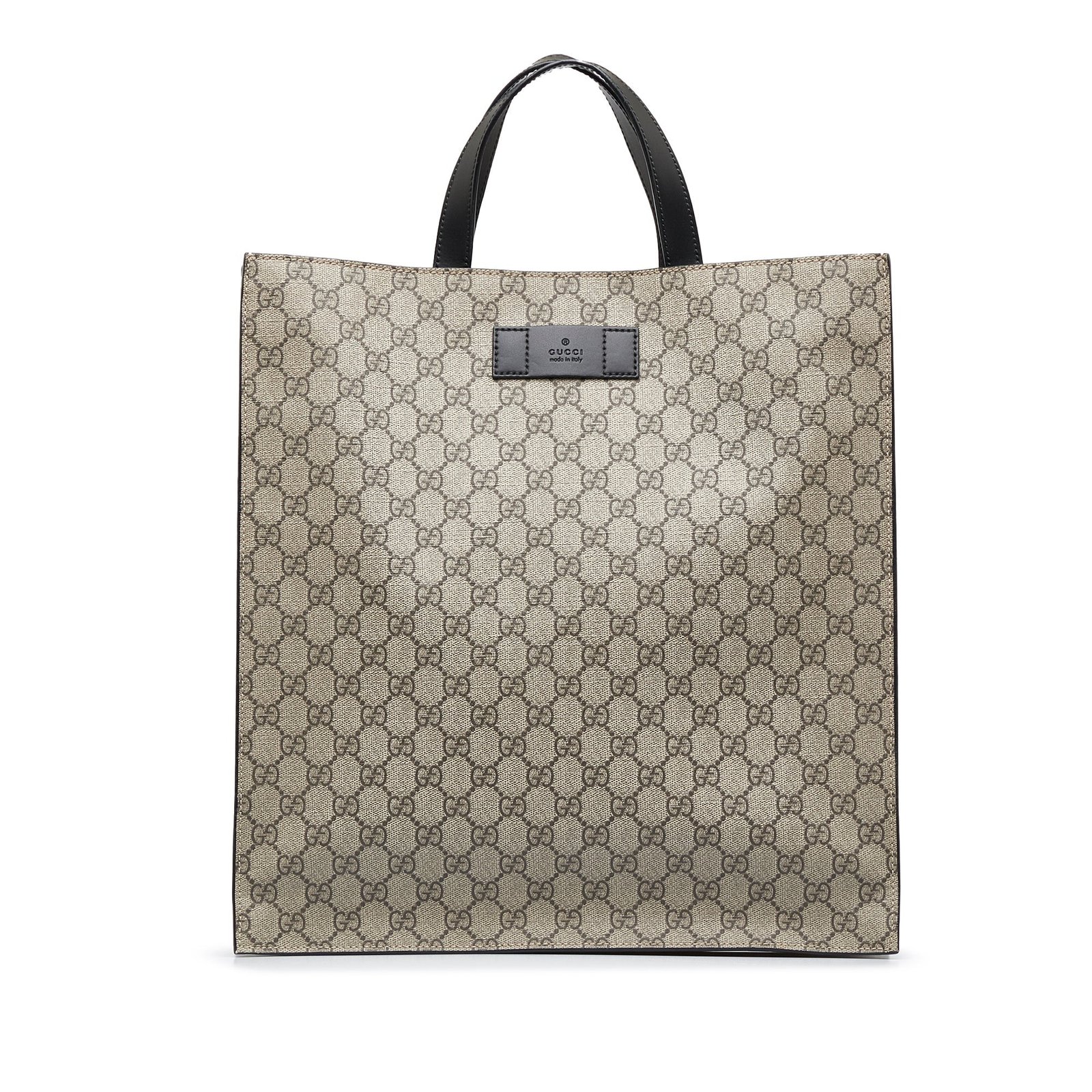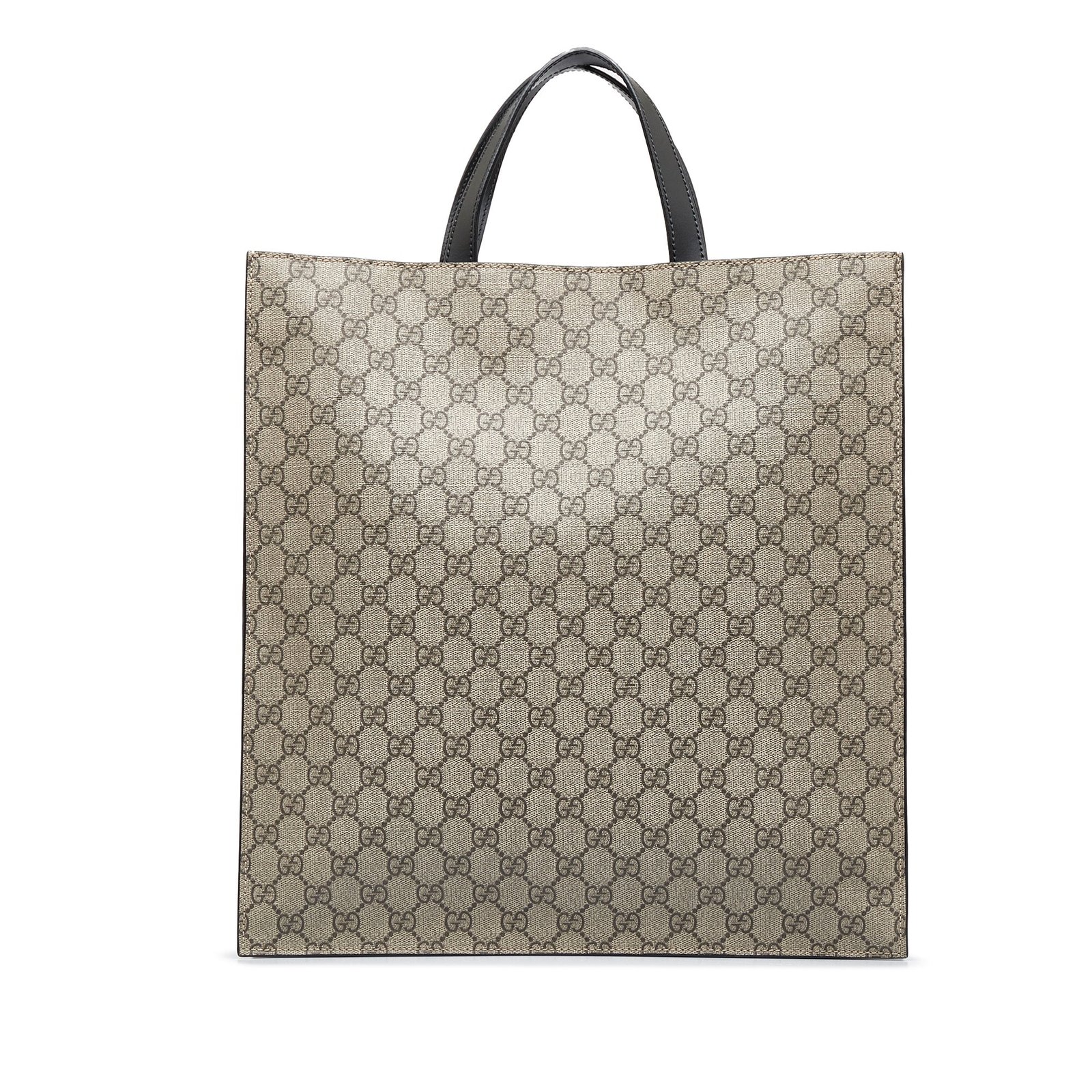 Product Details: Brown Gucci GG Supreme Convertible Soft Tote Satchel. The GG Supreme Convertible Soft Tote features a coated canvas body, flat leather straps, a detachable strap, and an open top. 15′ L x 14.2′ W x 3.1′ D, 3.9′ drop. Serial number 456217.