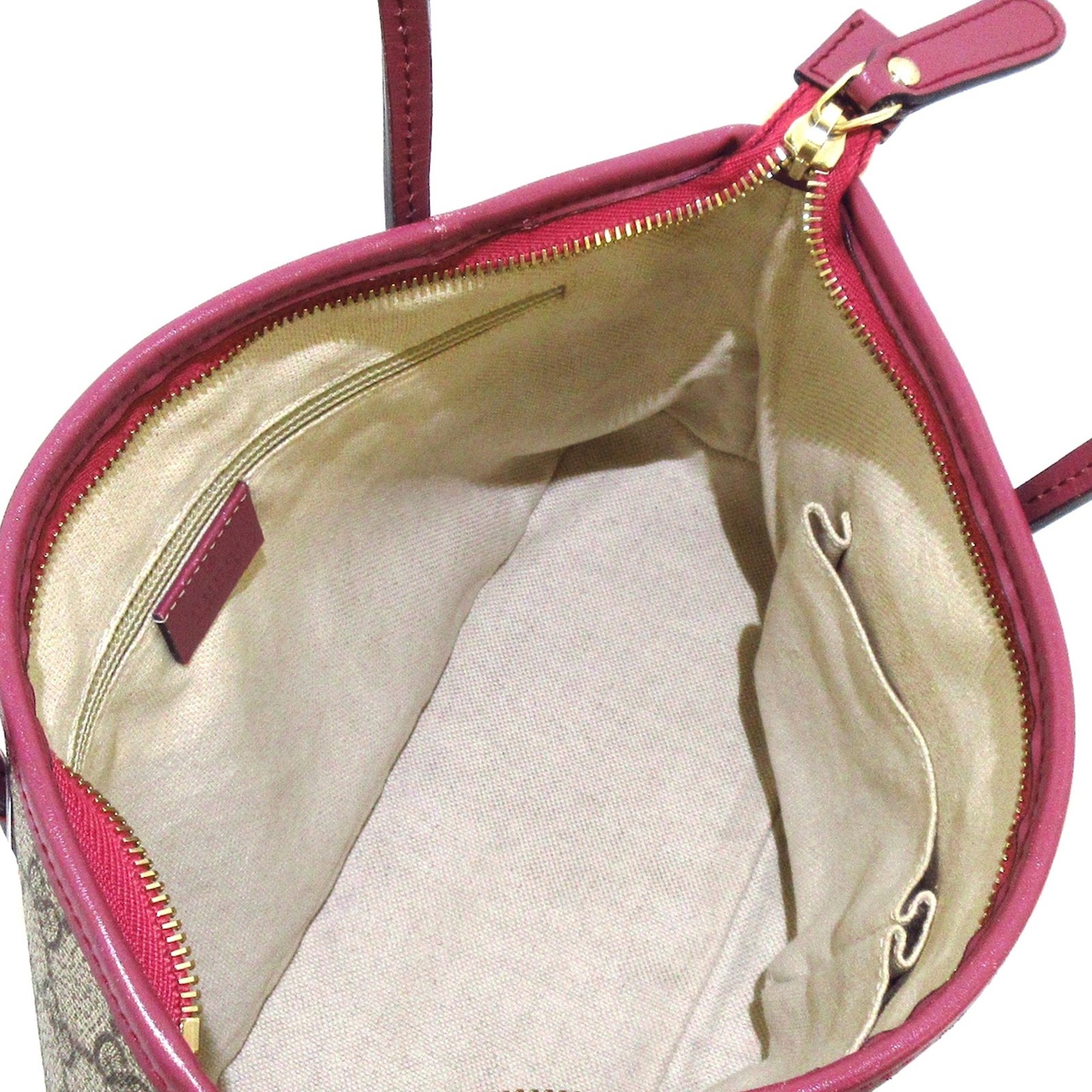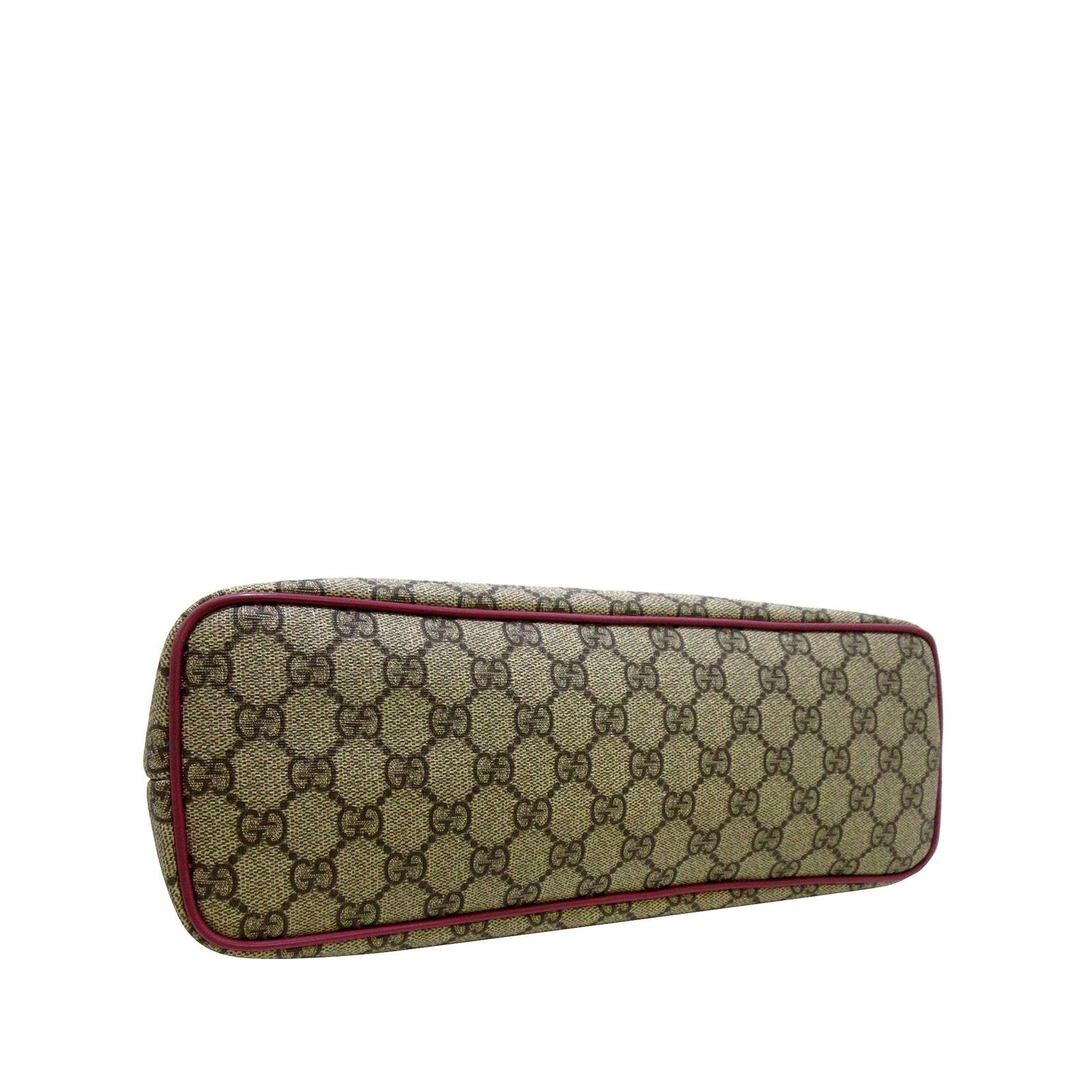 Product Details: Brown Gucci GG Supreme Convertible Zip Tote Satchel. This satchel features a coated canvas body with leather trim, flat leather handles, a top zip closure, and interior zip and slip pockets. 8.3′ L x 12.6′ W x 4.3′ D, 5.5′ drop.
