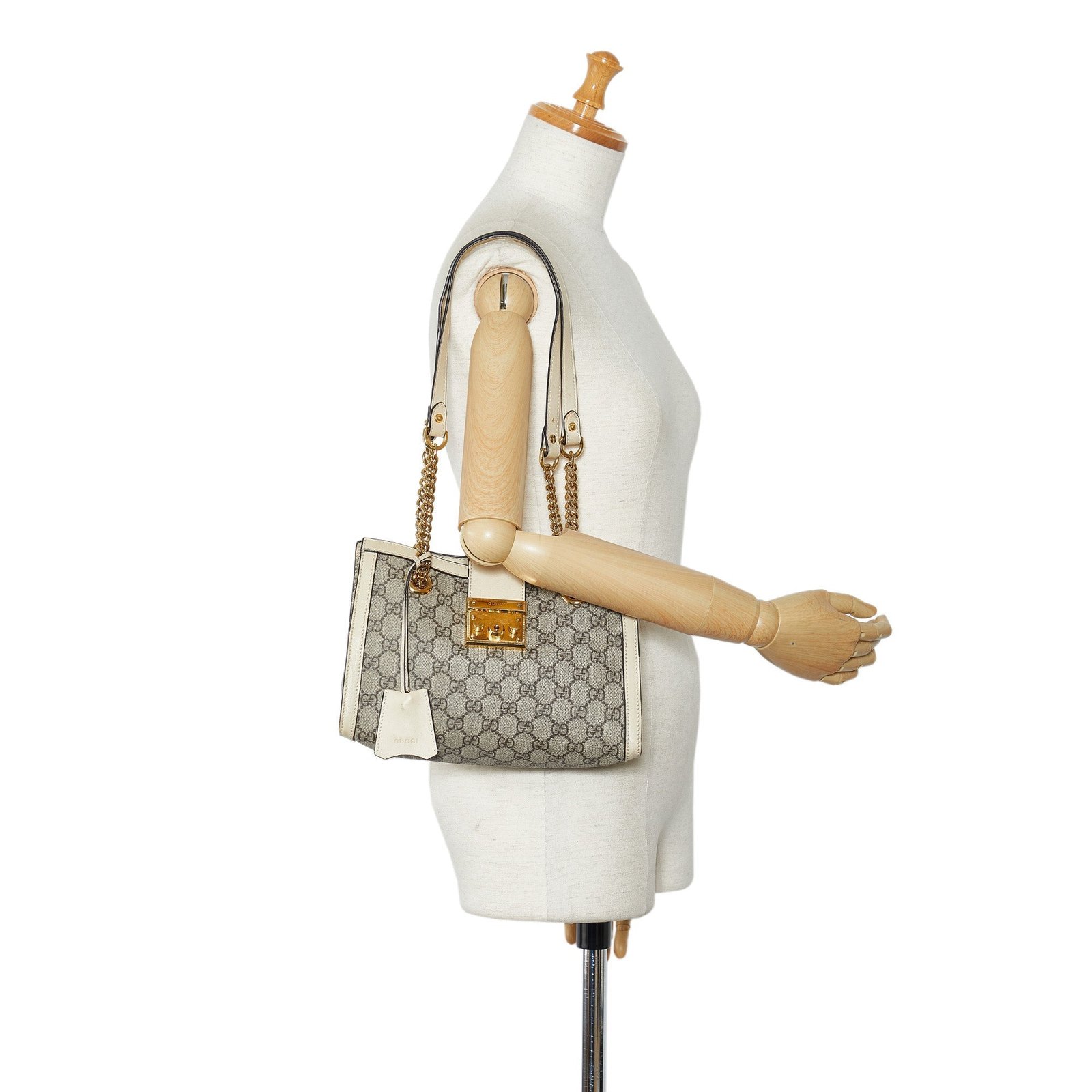 Product Details: Brown Gucci Small GG Supreme Padlock Tote. The Padlock tote bag features a coated canvas body with leather trim, chain-link shoulder straps with leather shoulder guards, an open top with S-lock closure at the front, and interior slip pockets. 6.7′ L x 10.2′ W x 3.9′ D, 11.8′ drop. Serial number 498156 525040.