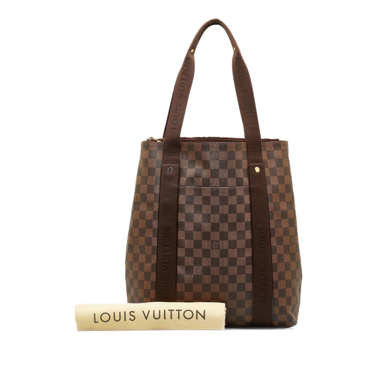 Product Details: Brown Louis Vuitton Damier Ebene Cabas Beaubourg Tote Bag. The Cabas Beaubourg features a damier ebene canvas body, flat handles, an open top, an interior zip compartment, and an interior slip pockets. 15′ L x 12.2′ W x 4.7′ D, 8.7′ drop. Serial number CA0088.