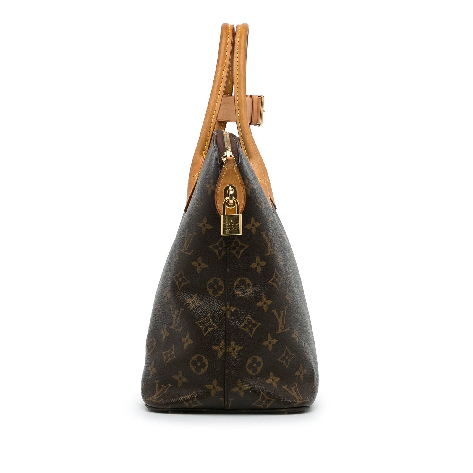 Product Details: Brown Louis Vuitton Monogram Lockit MM Tote Bag. The Lockit MM features a monogram canvas body, rolled leather handles, a top zip closure, and interior zip and slip pockets. 11.8′ L x 13′ W x 6.7′ D, 4.3′ drop. Serial number FL4121.