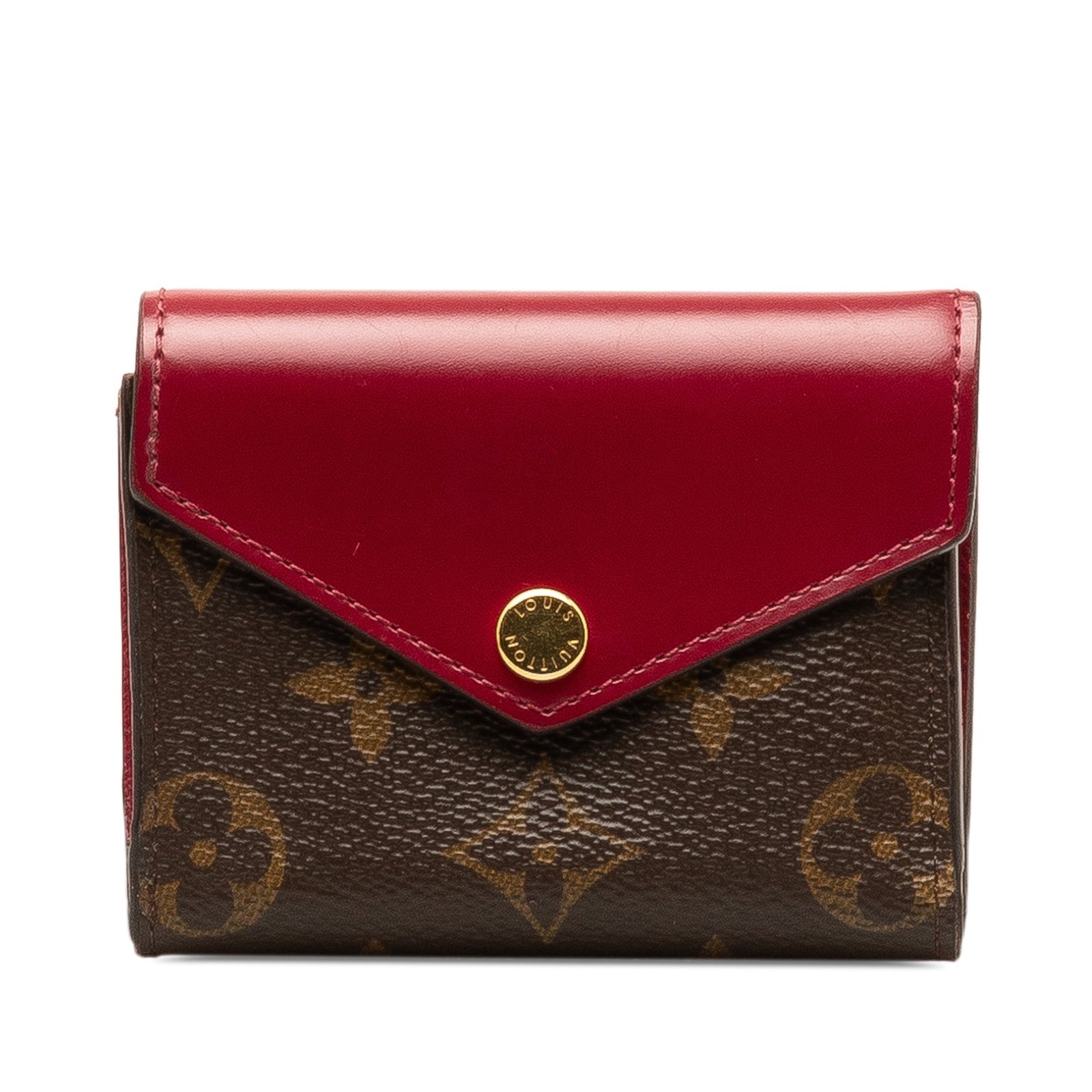 Product Details: Brown Louis Vuitton Monogram Zoe Wallet. The Zoe wallet features a monogram canvas body, a top leather flap with a snap button closure, and interior slip pockets. 3.1′ L x 3.7′ W x 0.4′ D. Serial number TN2280.