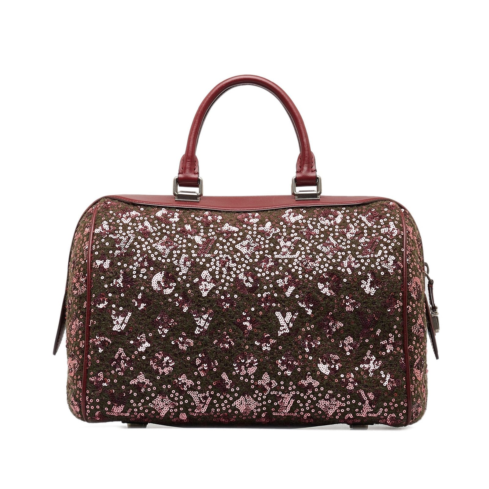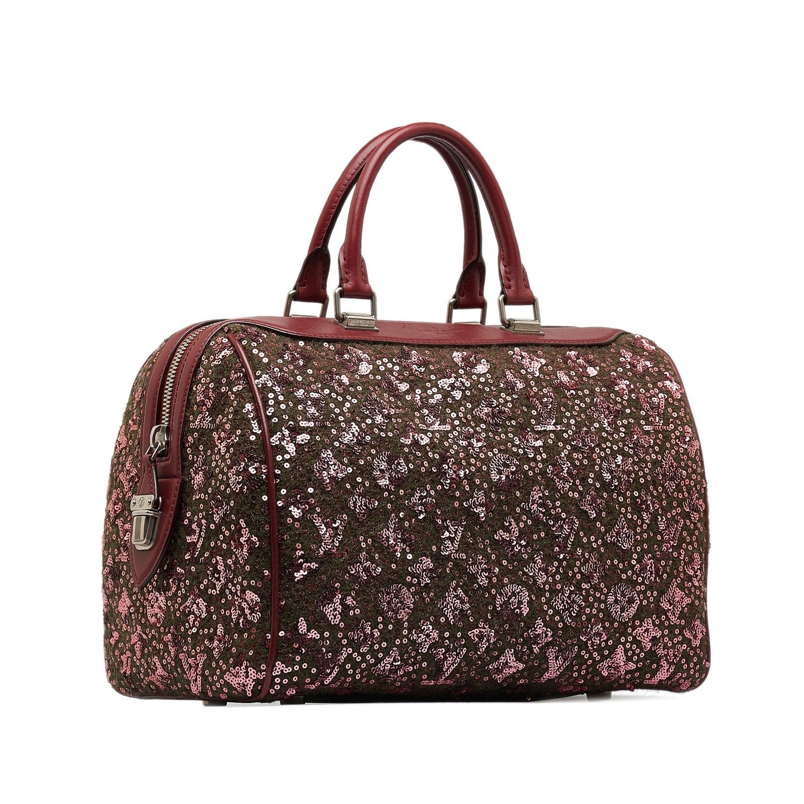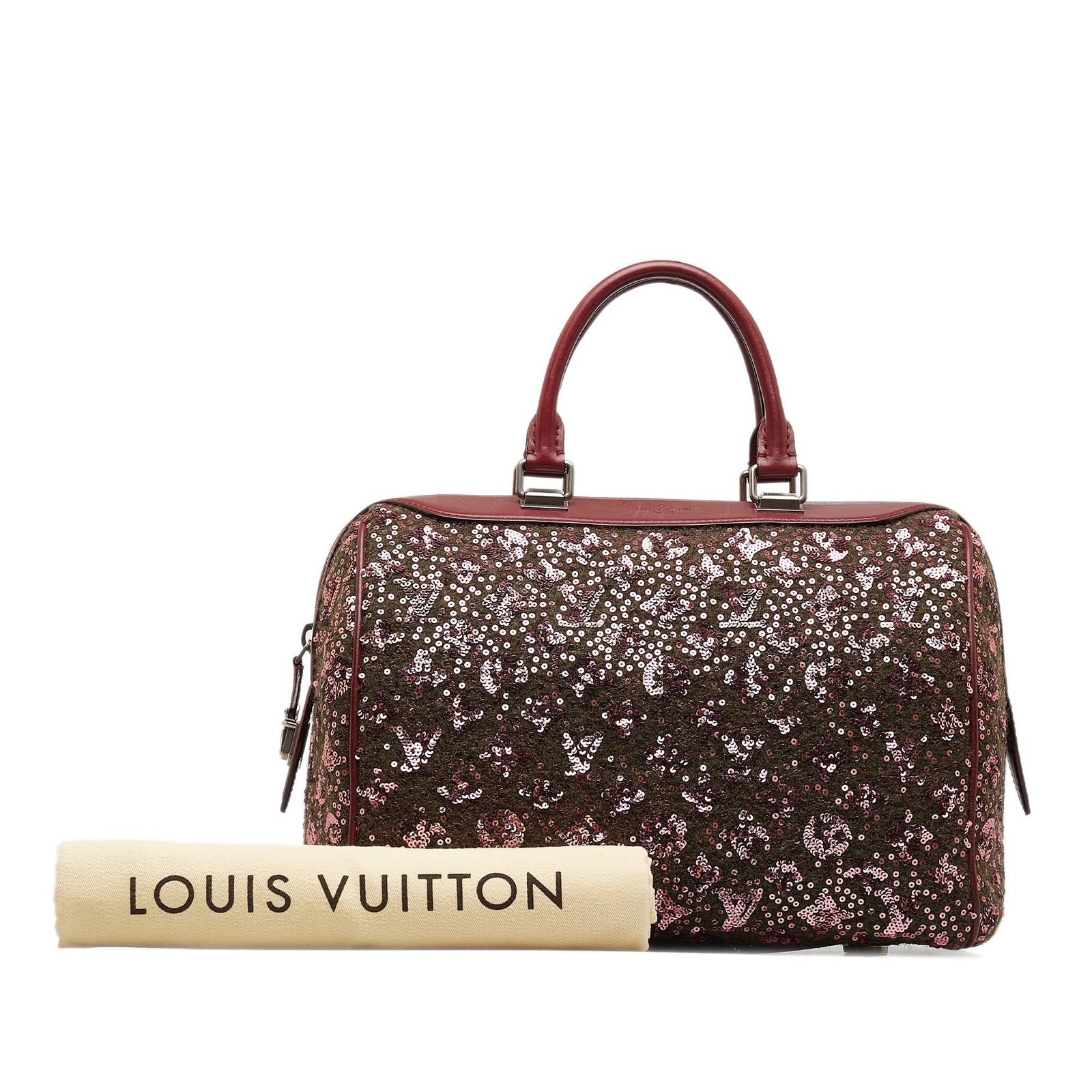 Product Details: Red Louis Vuitton Monogram Sunshine Express Speedy 30 Boston Bag. The Sunshine Express Speedy features an embellished fabric body with leather trim, rolled leather handles, a top zip closure, and an interior slip pocket. 9.1′ L x 12.6′ W x 7.9′ D, 4.5′ drop. Serial number FO3102.
