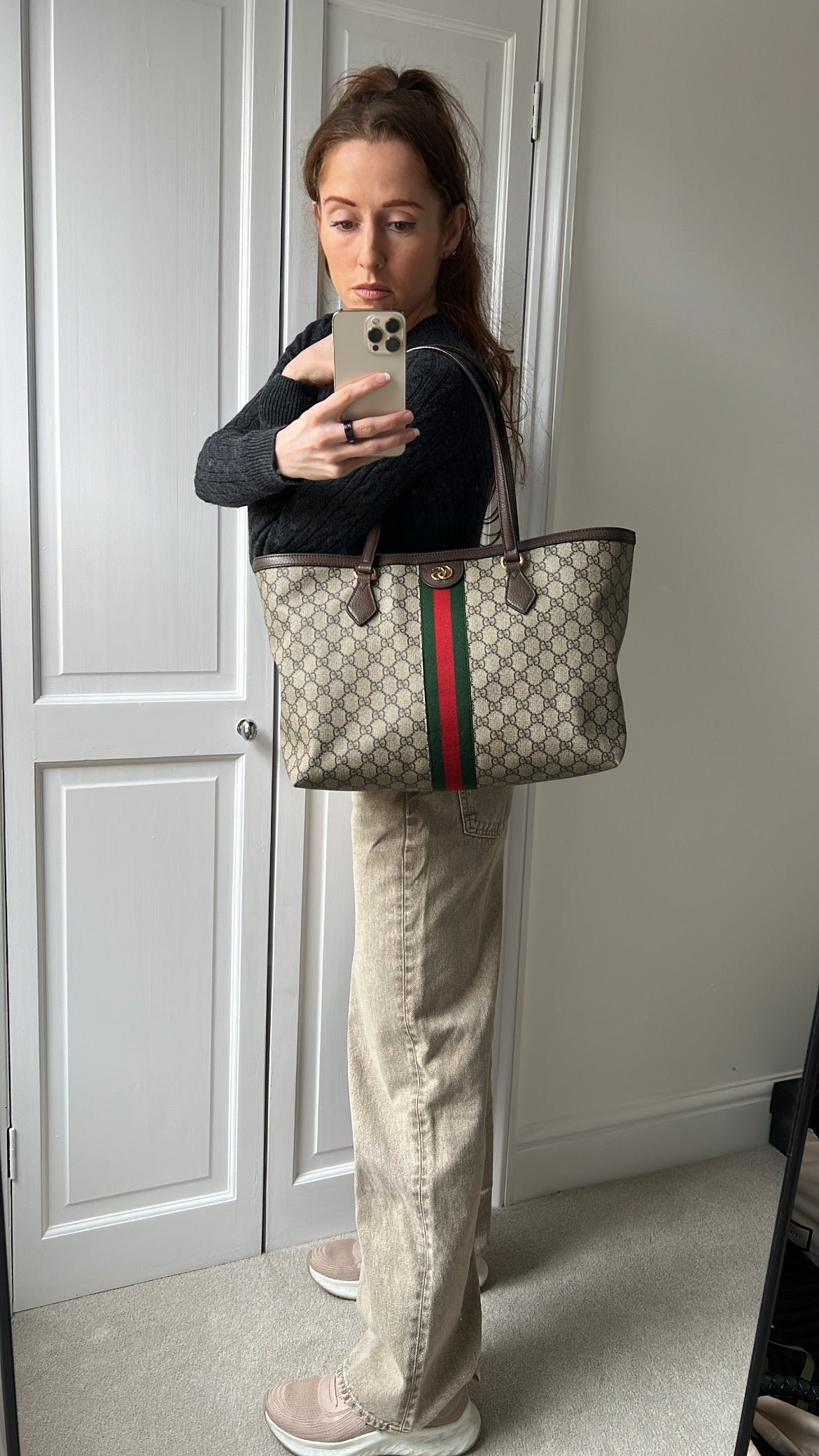 Gucci Ophidia Medium Supreme GG Ophidia Tote with gold hardware. Crafted in GG supreme canvas and trimmed with brown textured leather. This large tote combines the signature motif with the web stripe – a timeless pairing that pays homage to Gucci’s roots. Can be carried over the shoulder comfortably or by hand. Ideal size for day to day use.
