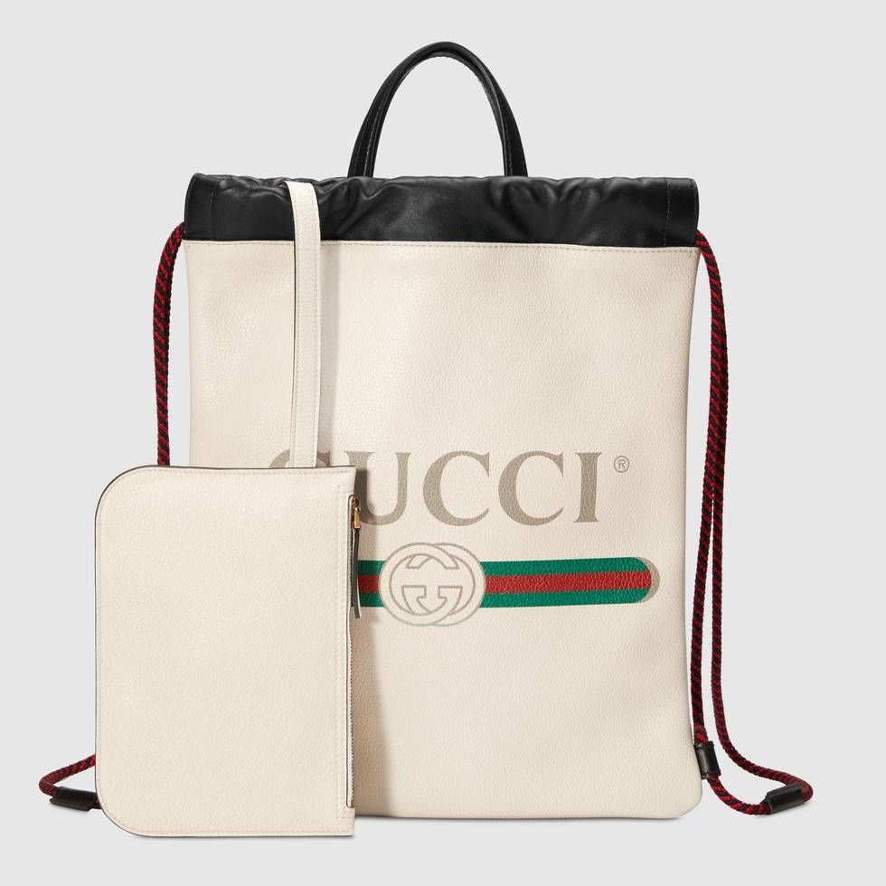 The Gucci 2018 Logo-Print Drawstring Backpack in White is from the 2018 Collection. White grained leather Gucci backpack with black leather trim, dual green and red Web-trimmed braided shoulder straps, dual flat top handles, green and multicolor printed logo motif at front face, tonal hide lining and drawstring closure at top. Includes accompanying zip pouch and dust bag.