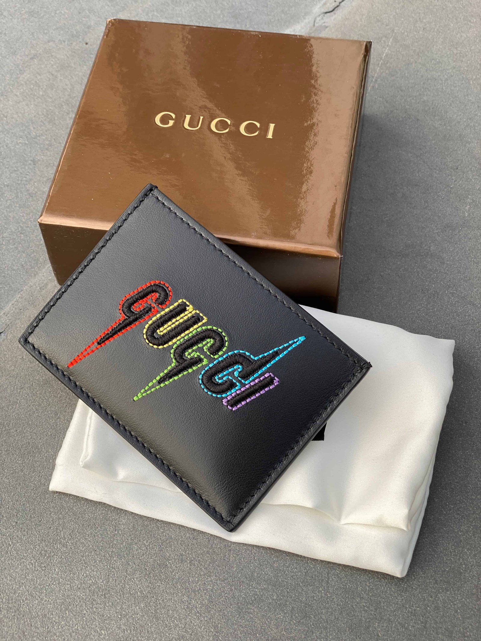 In the Gucci Blade Embroidered Card Case in Black, Gucci incorporates their Blade logo as an embroidered motif on this card case. Featuring an embroidered logo to the front, 2 card slots, and an embossed internal logo stamp.