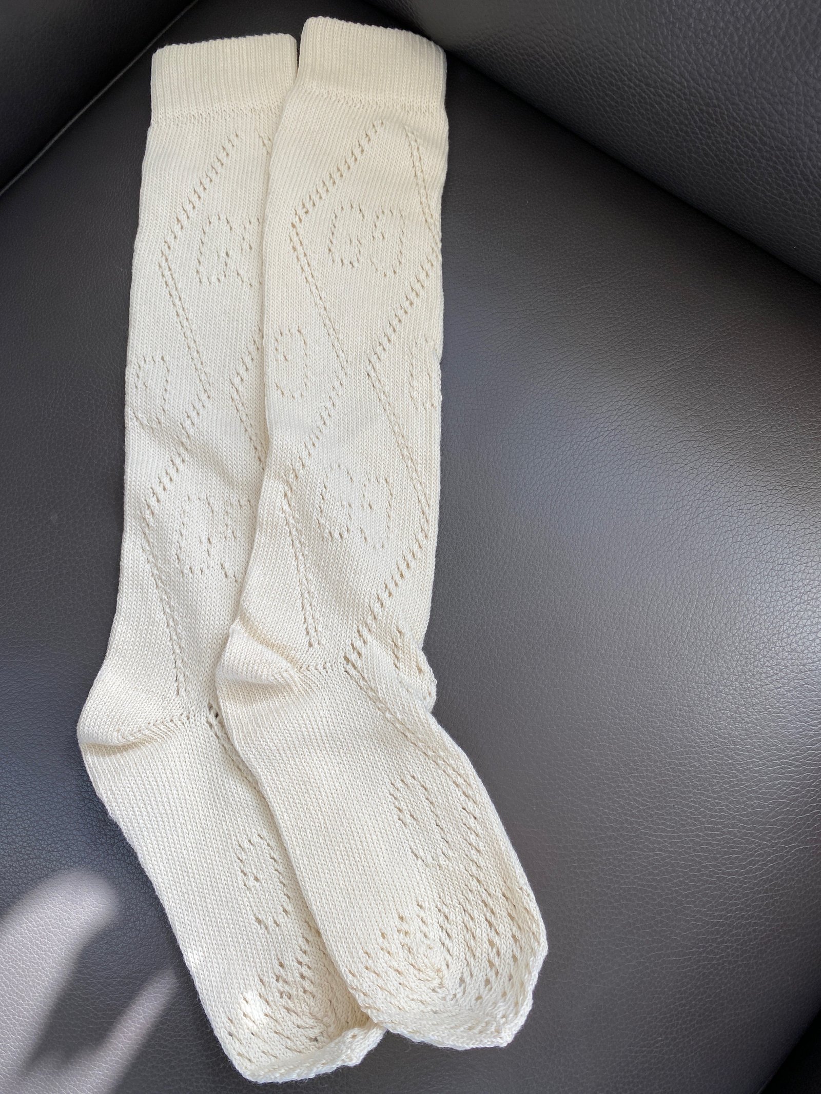 The Gucci Interlocking GG Knit Sock in White is crafted in Italy. This pair of socks features an interlocking GG within a perforated diamond.