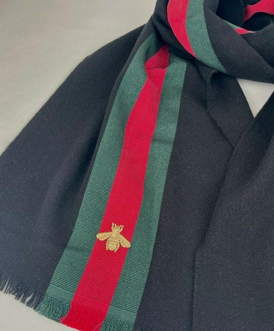 - Gucci Black Wool Cashmere Silk Long Scarf with BRB Web and Bee