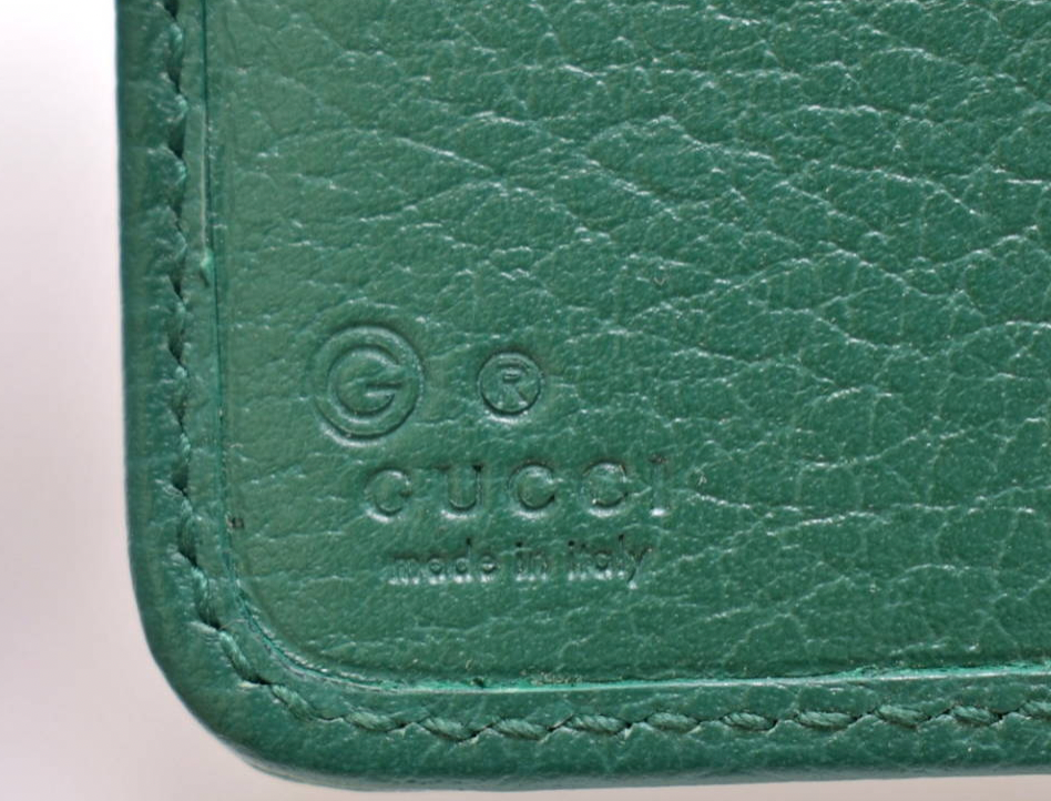 The Gucci Original GG Canvas French Wallet in Beige and Emerald Green is crafted from GG supreme coated canvas and a pebbled calfskin leather in Italy. This French style wallet features the GG Guccissima monogram pattern, and zip around coin pouch with dual slots. The other side features a flap with snap closure that opens to 8 card slots and 1 bill slot.