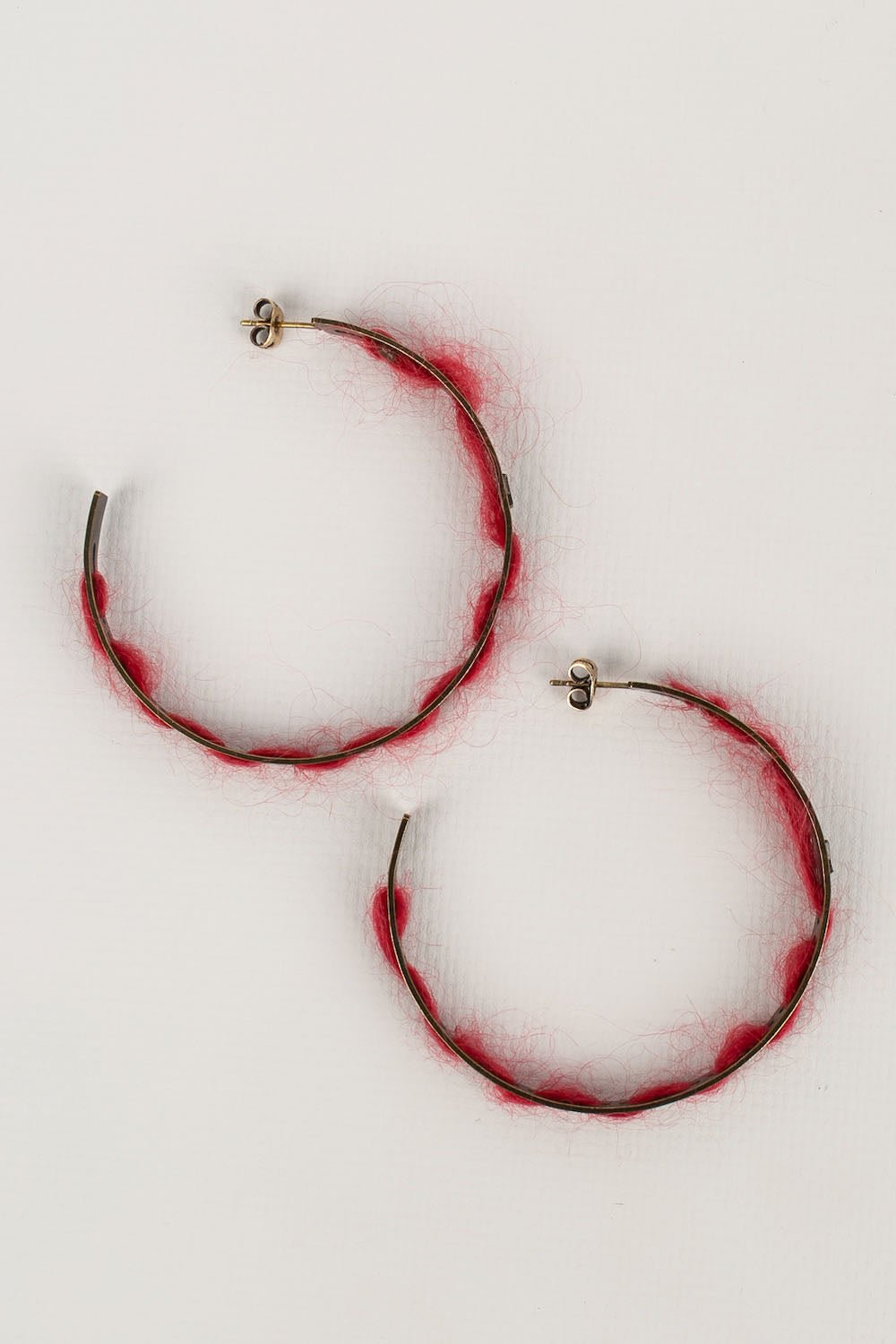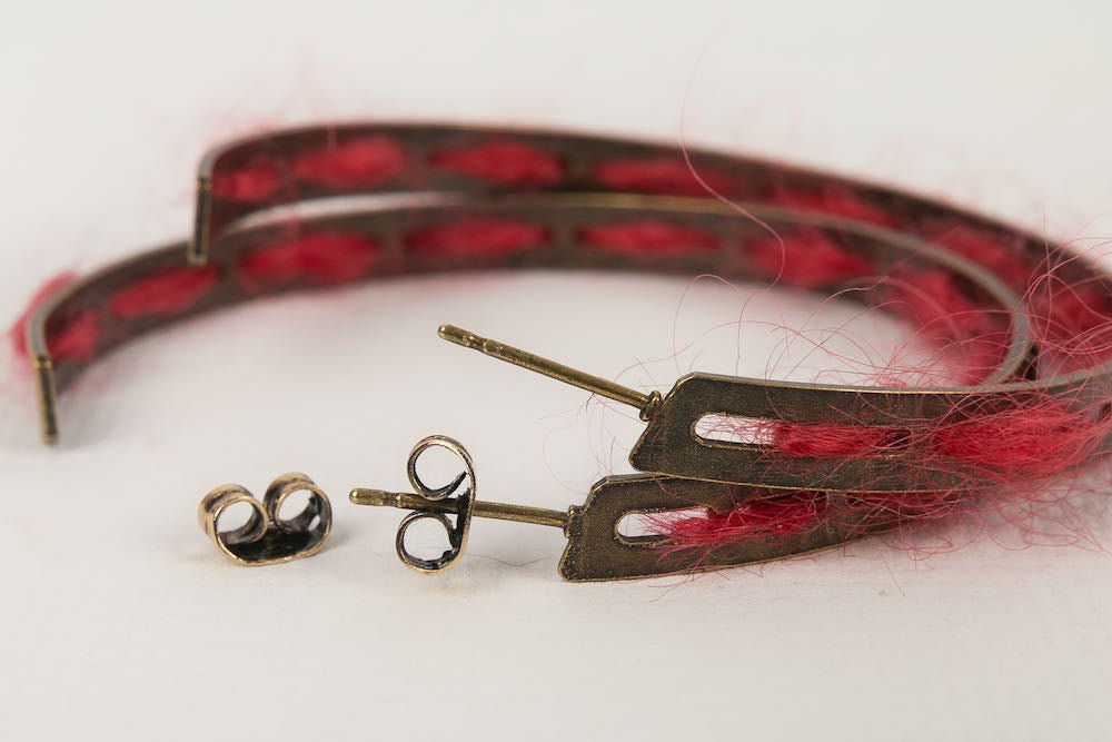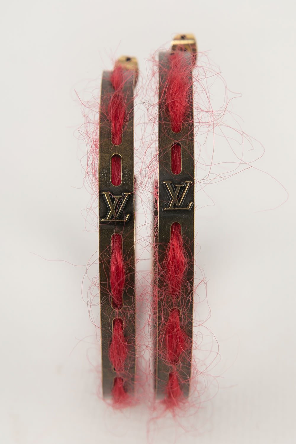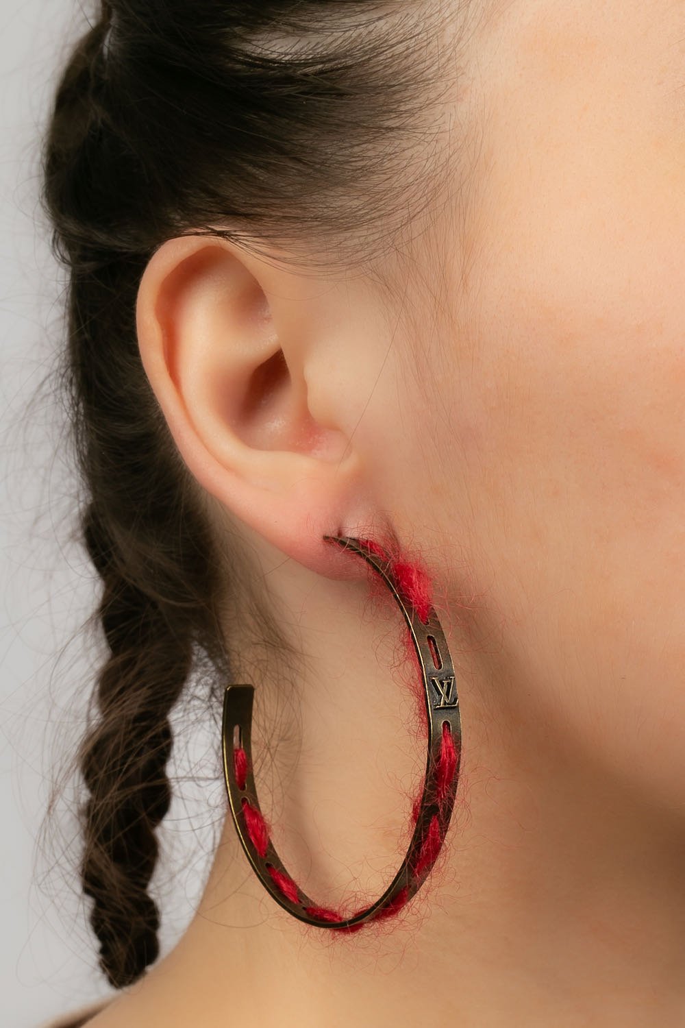 LOUIS VUITTON -Créoles en métal doré foncé entrelacées de laine rose.