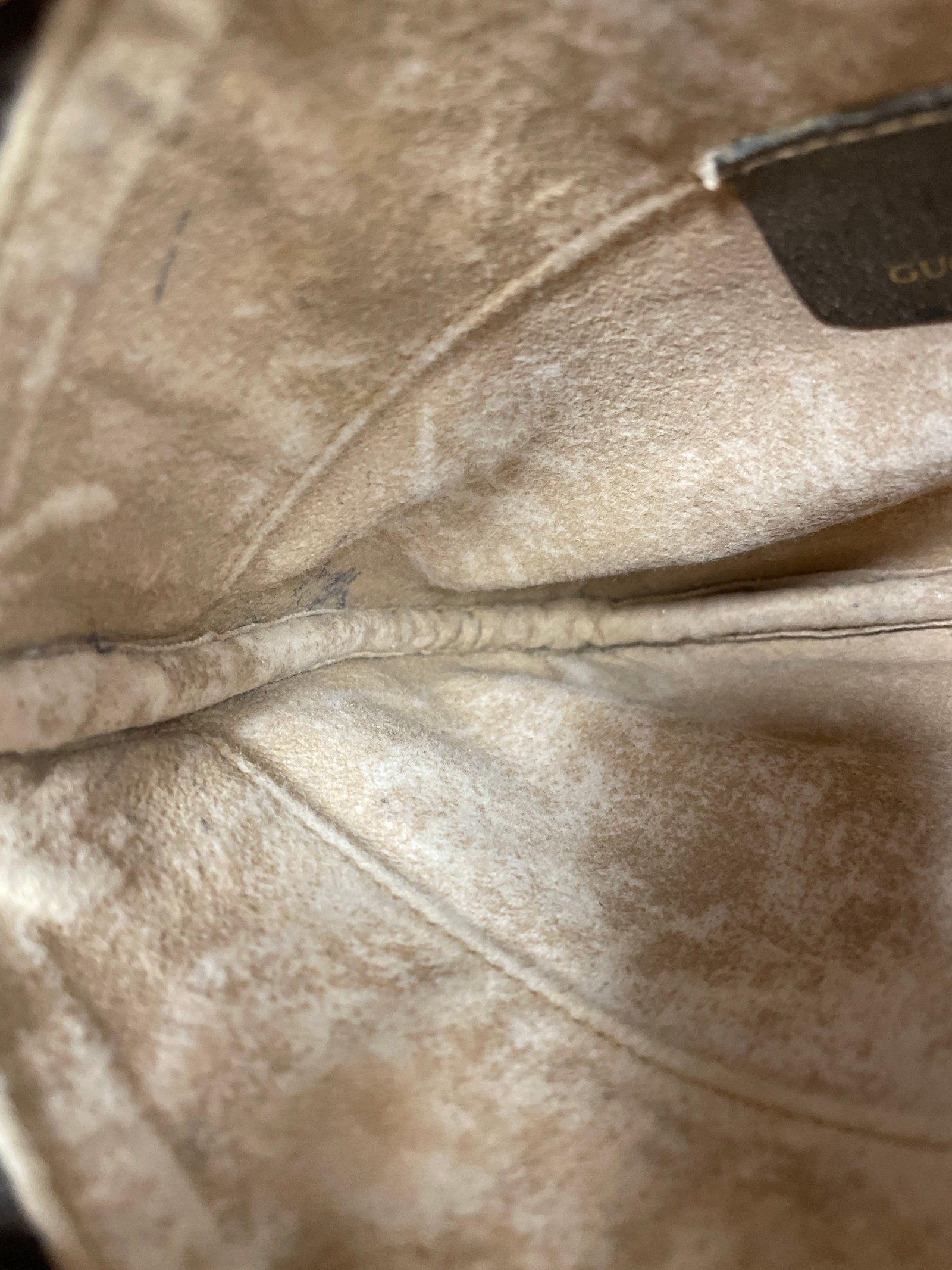 Front plate has wear. Interior has black markings. Zipper has wear.