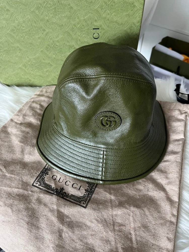 This is an used Gucci bucket hat in olive, a stylish accessory designed to uplift your look. Crafted from high-quality leather, this hat combines classic elegance with a modern twist. Its structured brim and signature Gucci details offer a chic silhouette, making it an essential piece for fashion-forward individuals.