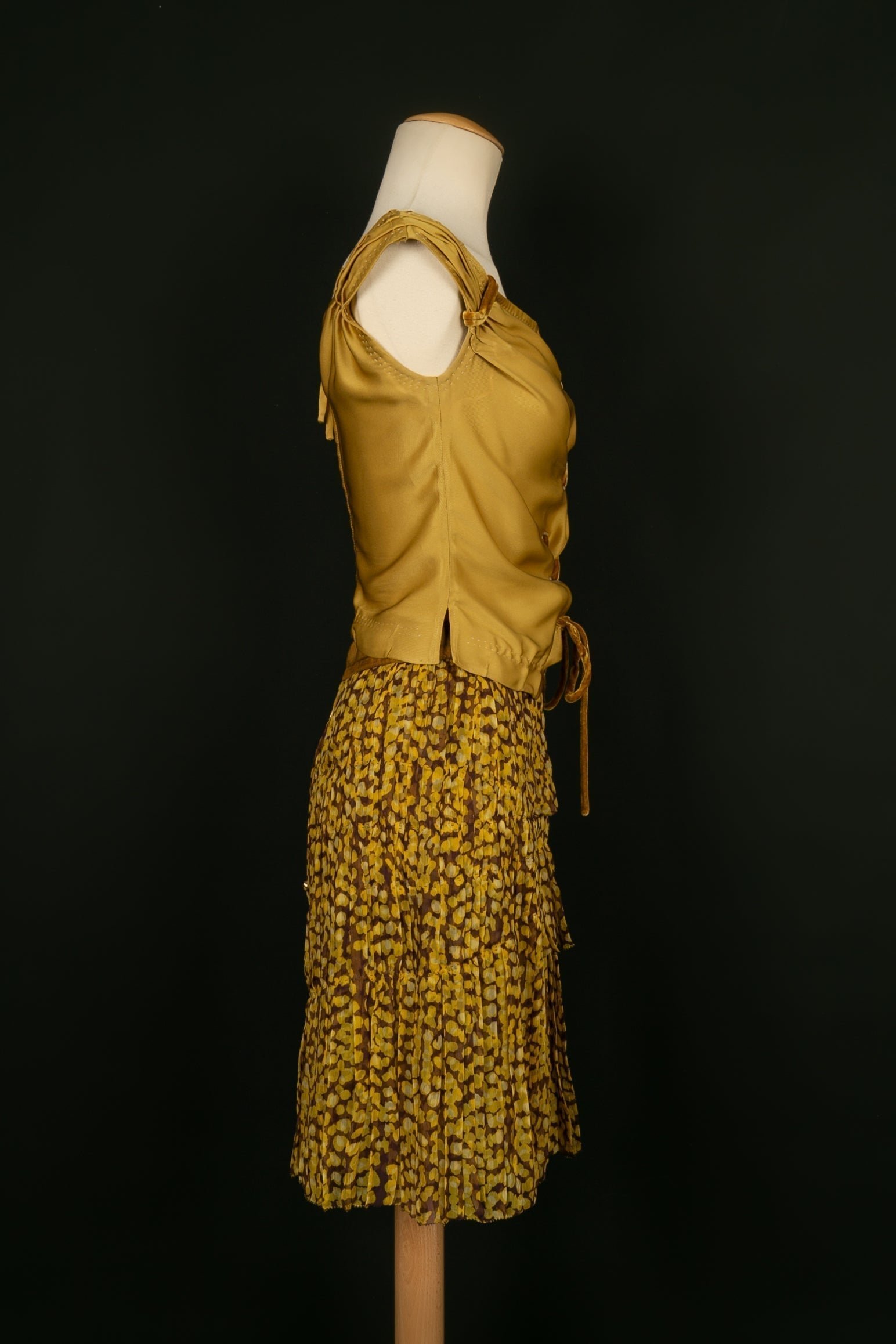 LOUIS VUITTON – (Made in France) Ensemble composé d’un haut 34FR en acetate et d’une jupe 36FR plissée en soie.