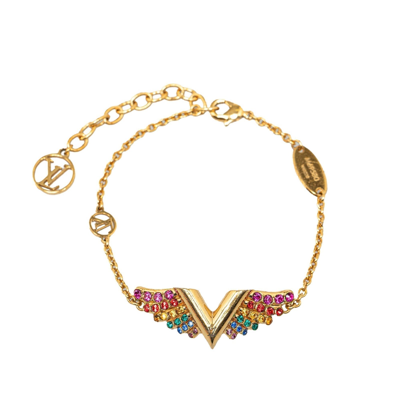 Product Details: Gold Louis Vuitton Essential V Bracelet. The V bracelet features a metal body with rhinestone details, and a lobster-claw closure. 2.4′ L x 7.1′ W x 0′ D. Serial number VA0220.