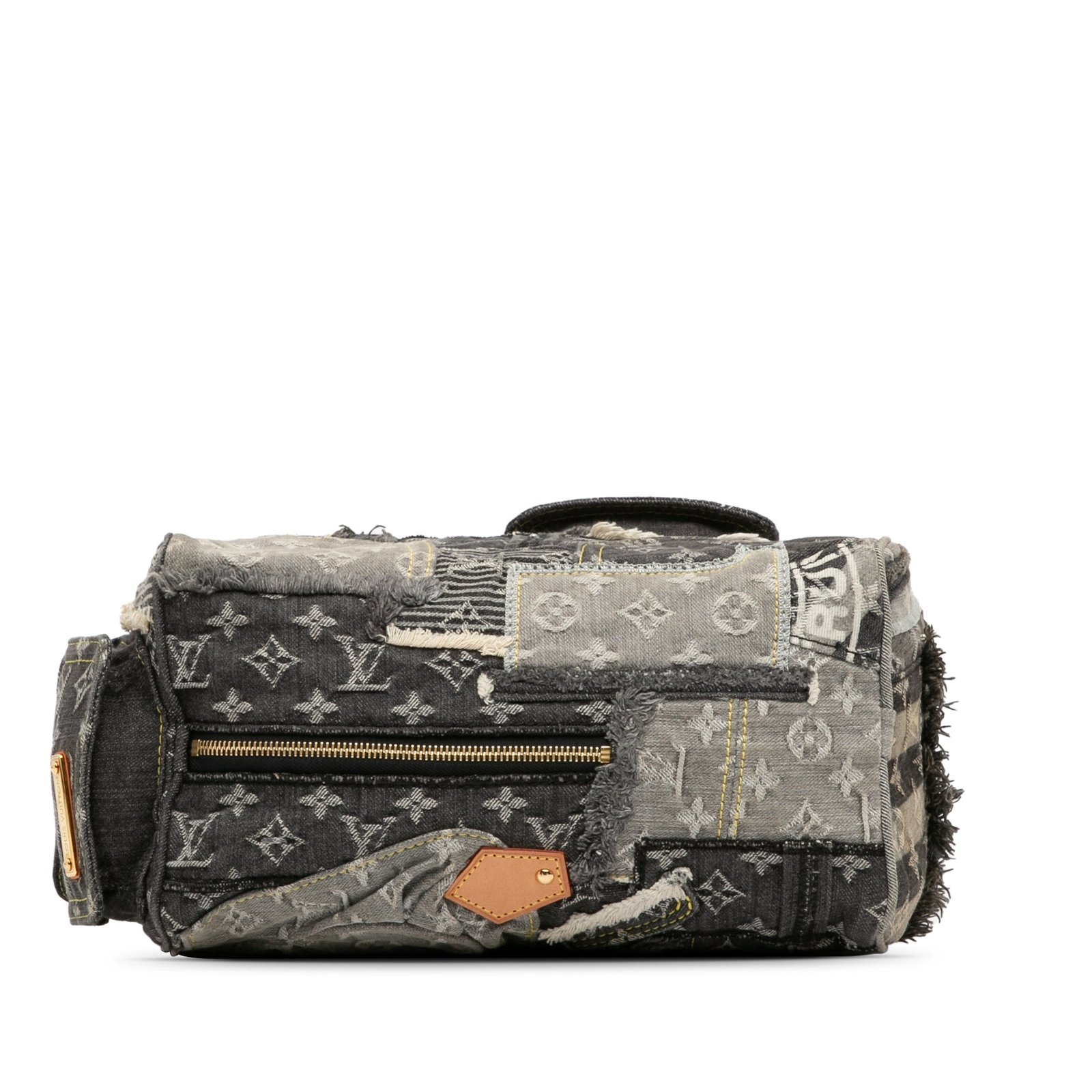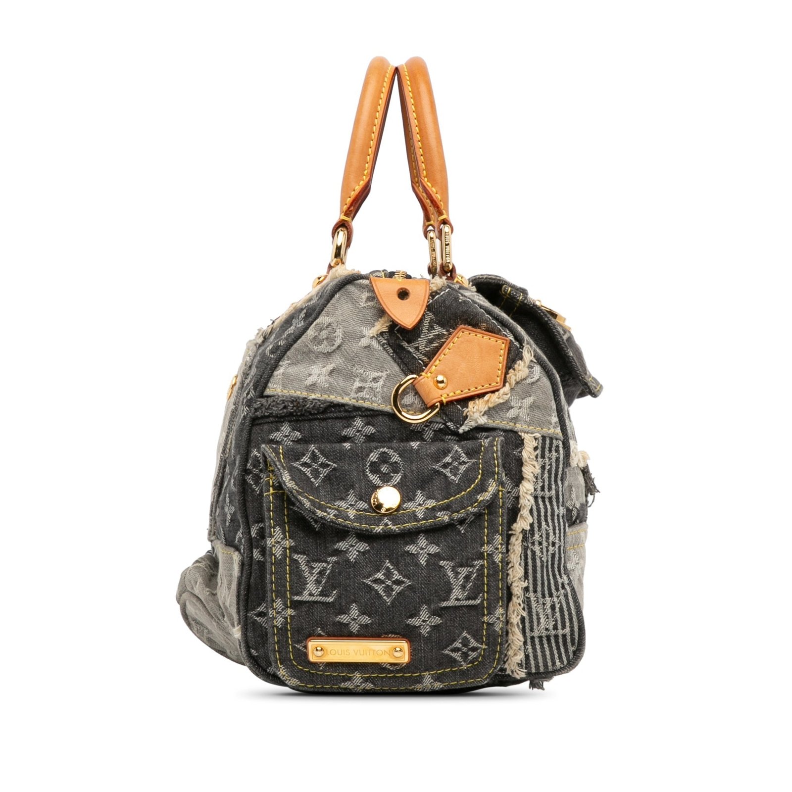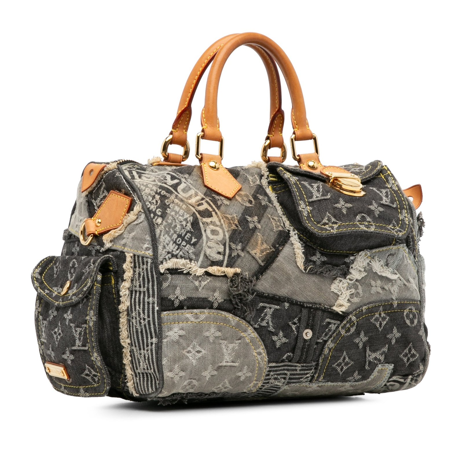 Product Details: Gray Louis Vuitton Monogram Denim Patchwork Speedy 30 Boston Bag. The Patchwork Speedy 30 features a denim body, rolled leather top handles, a top zip closure, exterior zip and flap pockets, and interior slip pockets. 8.3′ L x 11.4′ W x 6.7′ D, 4.3′ drop. Serial number TH 2017.