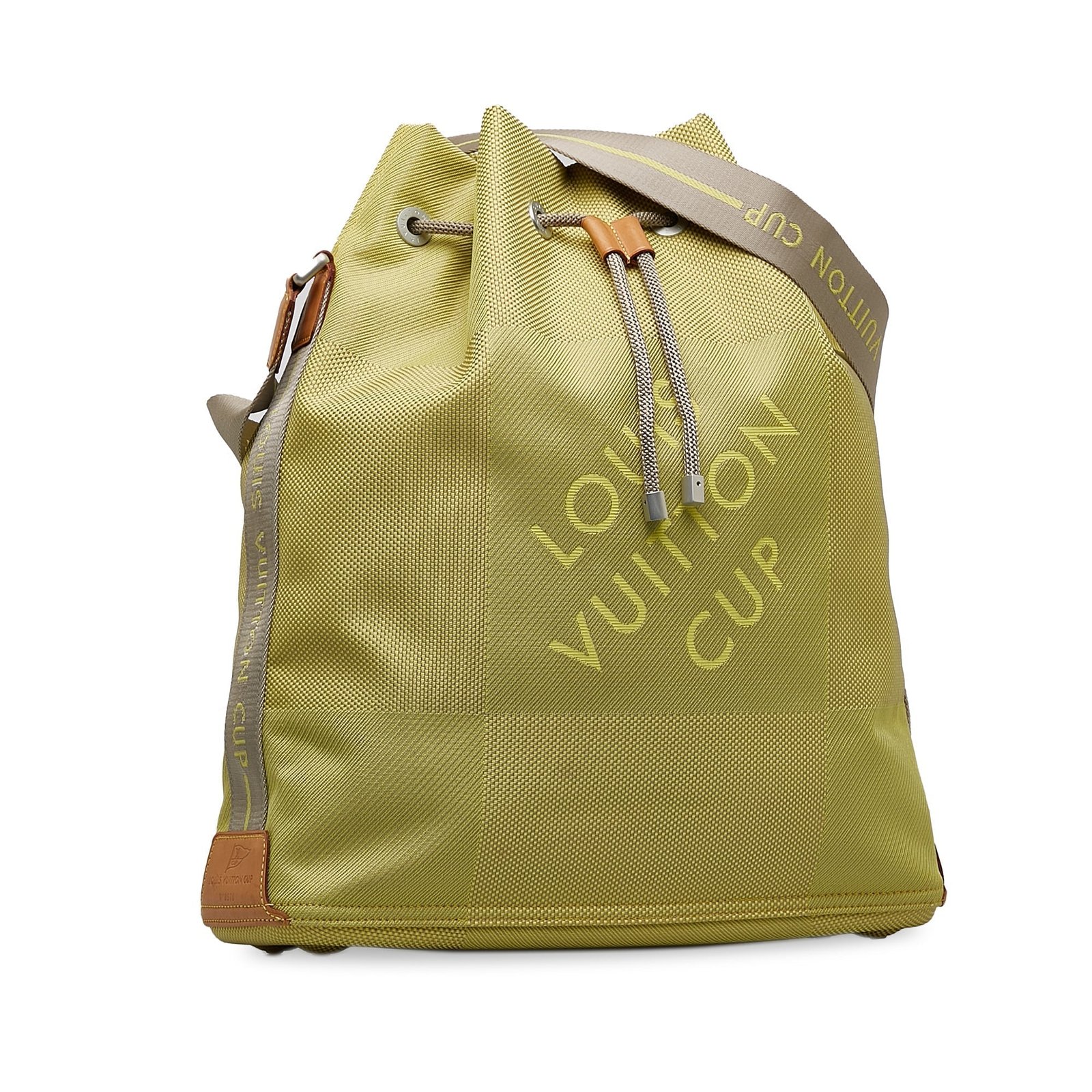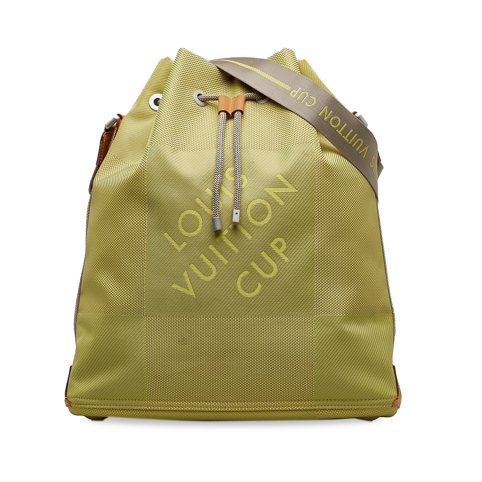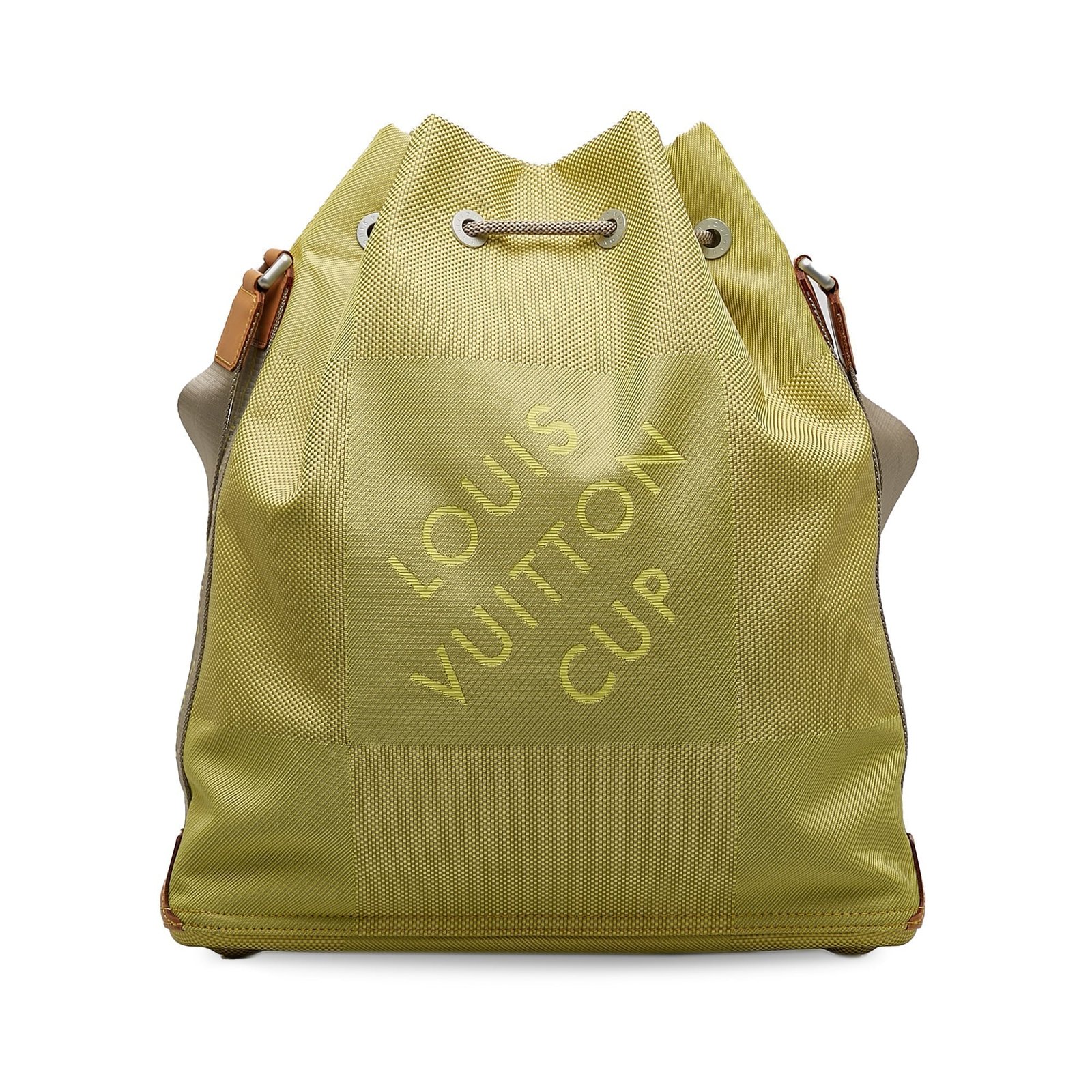 Product Details: Green Louis Vuitton Damier Geant LV Cup Volunteer Bucket Bag. The LV Cup Volunteer Bag features a canvas body with leather trim, an adjustable flat strap, and a top drawstring closure. 16.5′ L x 15′ W x 4.7′ D. Serial number SP0052.