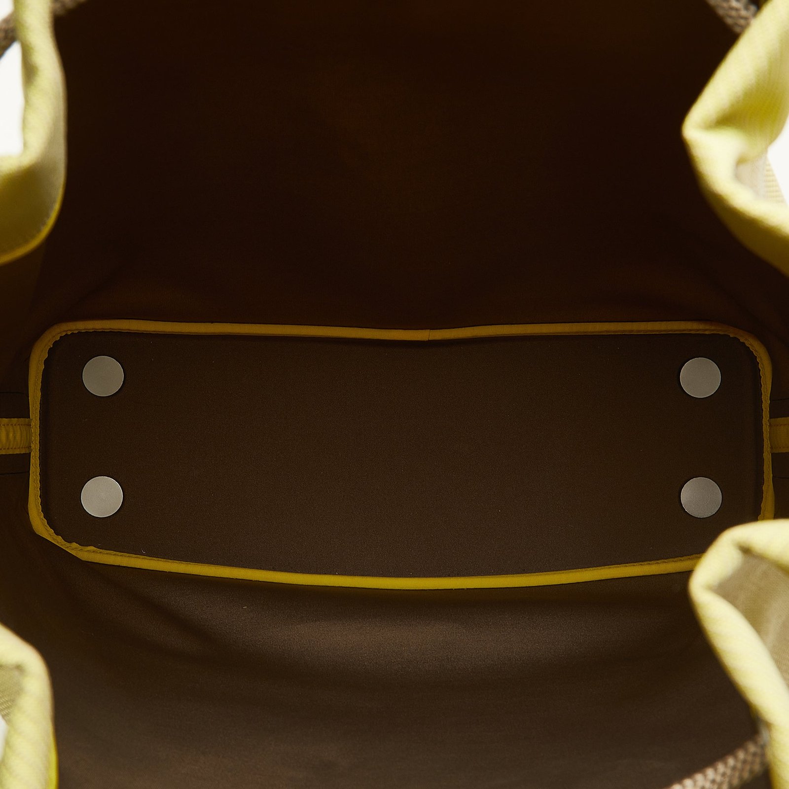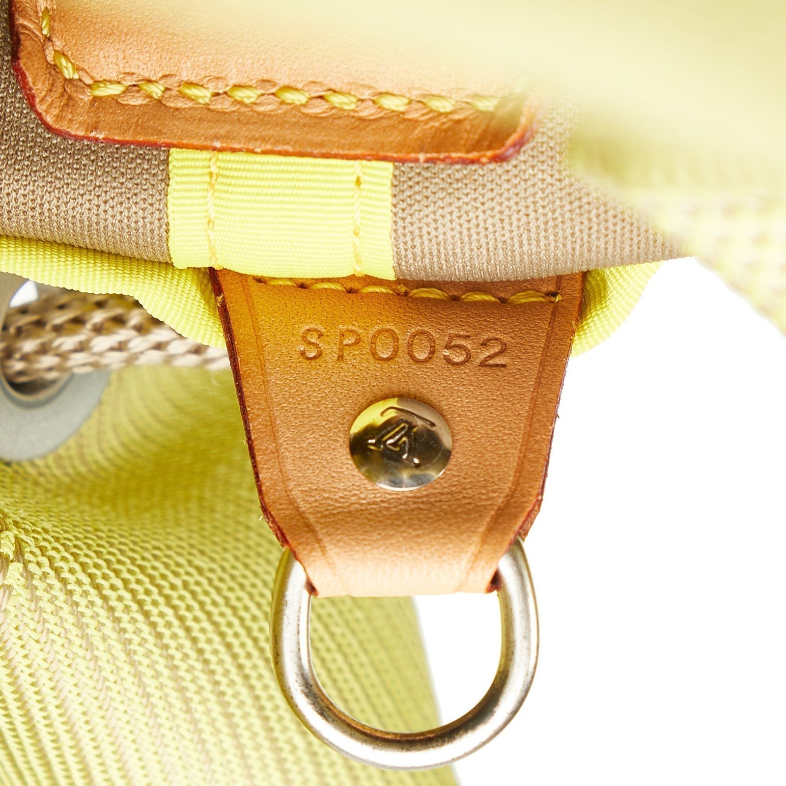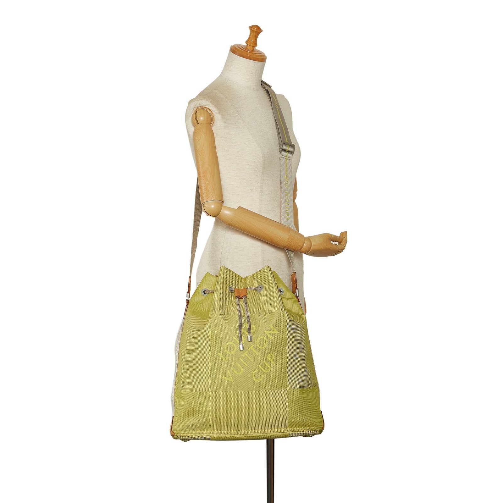 Product Details: Green Louis Vuitton Damier Geant LV Cup Volunteer Bucket Bag. The LV Cup Volunteer Bag features a canvas body with leather trim, an adjustable flat strap, and a top drawstring closure. 16.5′ L x 15′ W x 4.7′ D. Serial number SP0052.