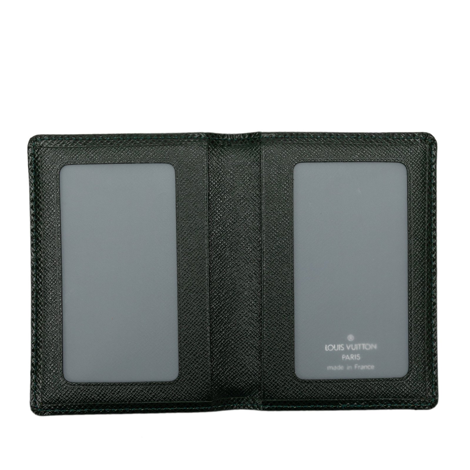 Product Details: Green Louis Vuitton Taiga Business Card Holder. This card holder features a leather body and interior slip compartments. 4.5′ L x 3.3′ W x 0.3′ D. Serial number CT0035.