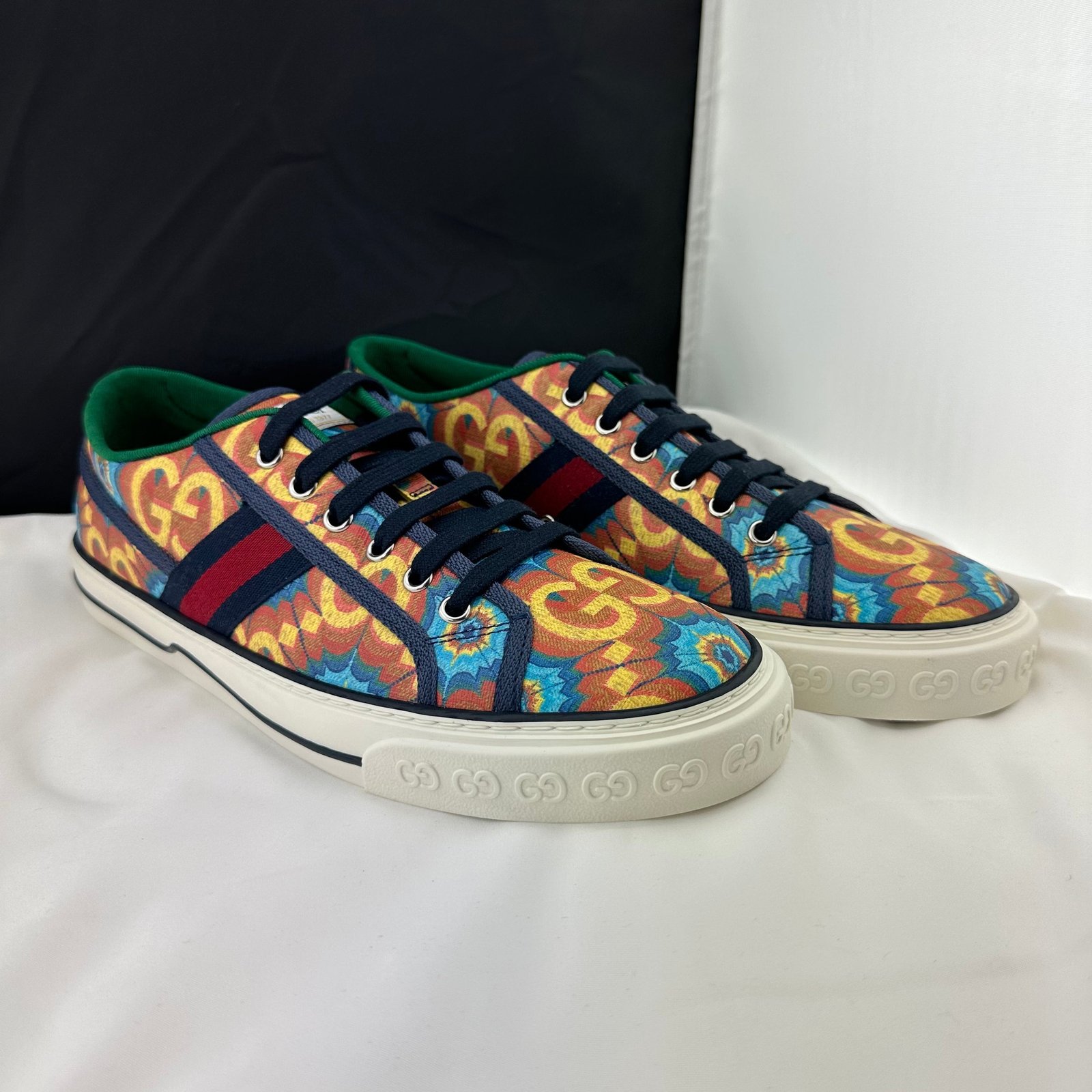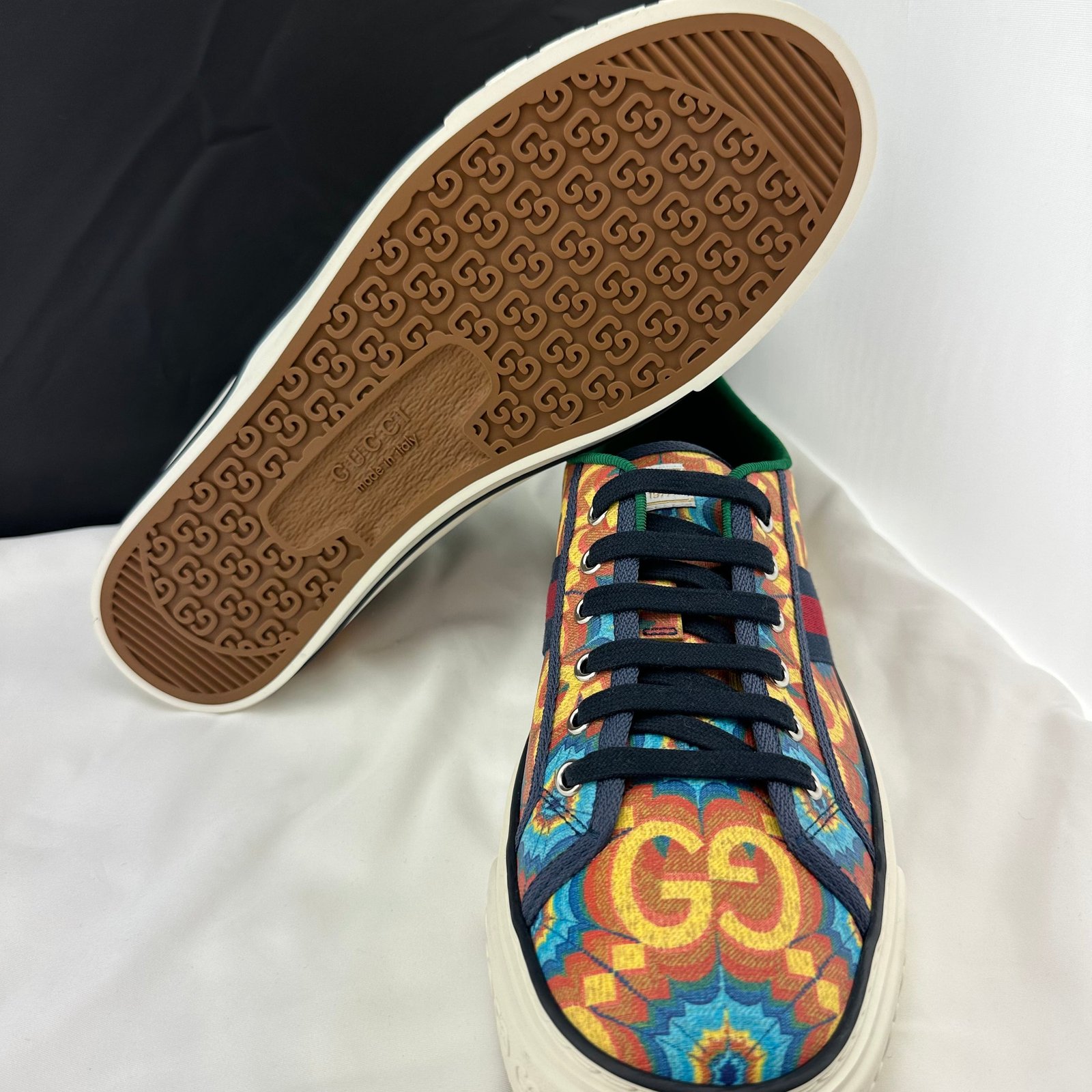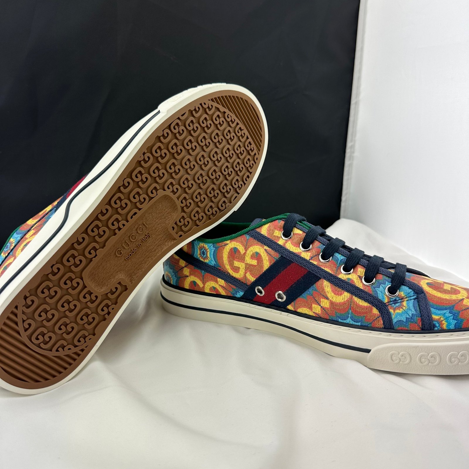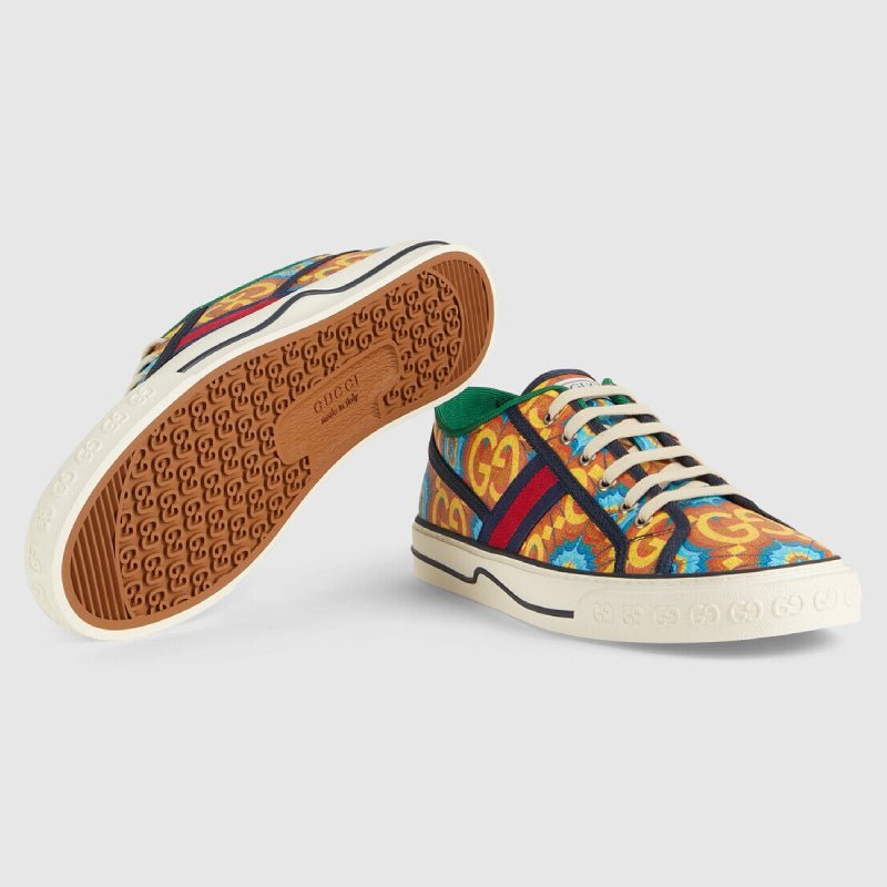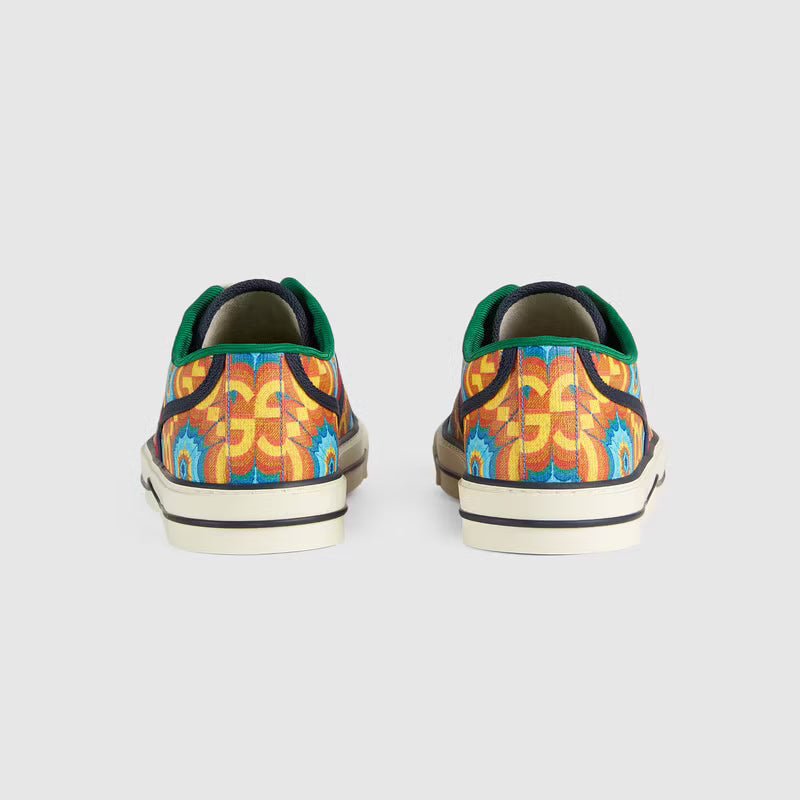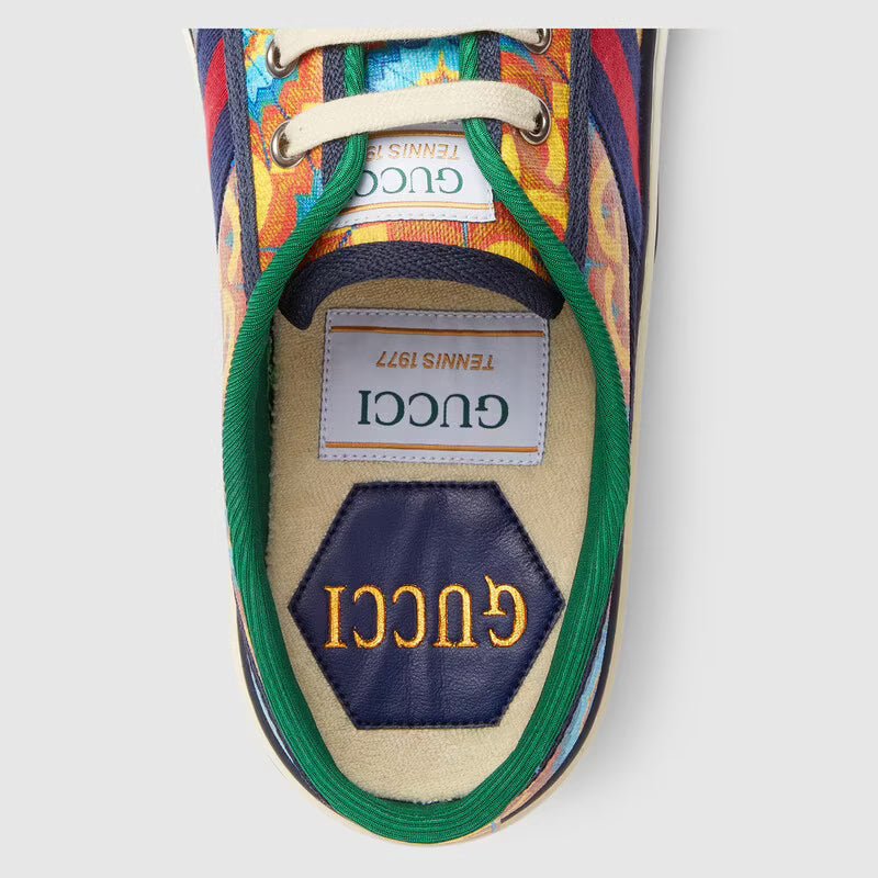 During its 100 years, Gucci has established itself as one of the most influential fashion houses. in honor of the centennial, this Gucci tennis 1977 sneaker celebrates the house’s whimsical nature with a colorful print that mixes circles and GGs to create a playful kaleidoscope effect. A leather detail with the Gucci script logo on the inner sole adds an unexpected element to the style.