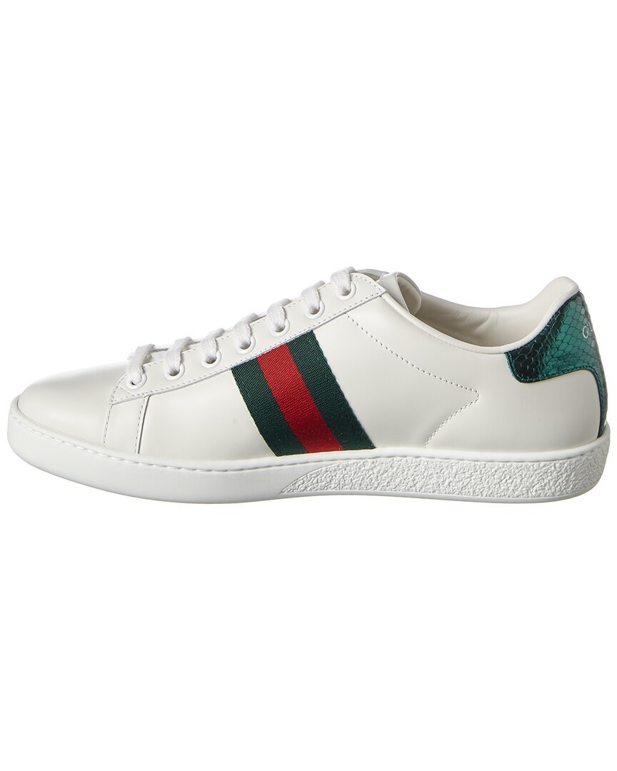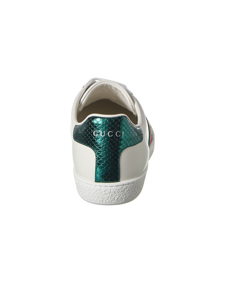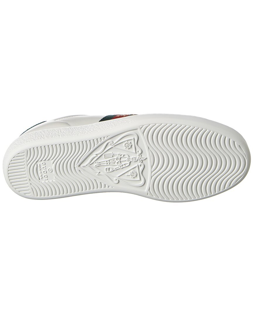 - Ace Embroidered Leather Sneaker In White Leather With Red And Green Signature Webbing Detail And Metallic Bee Embroidery