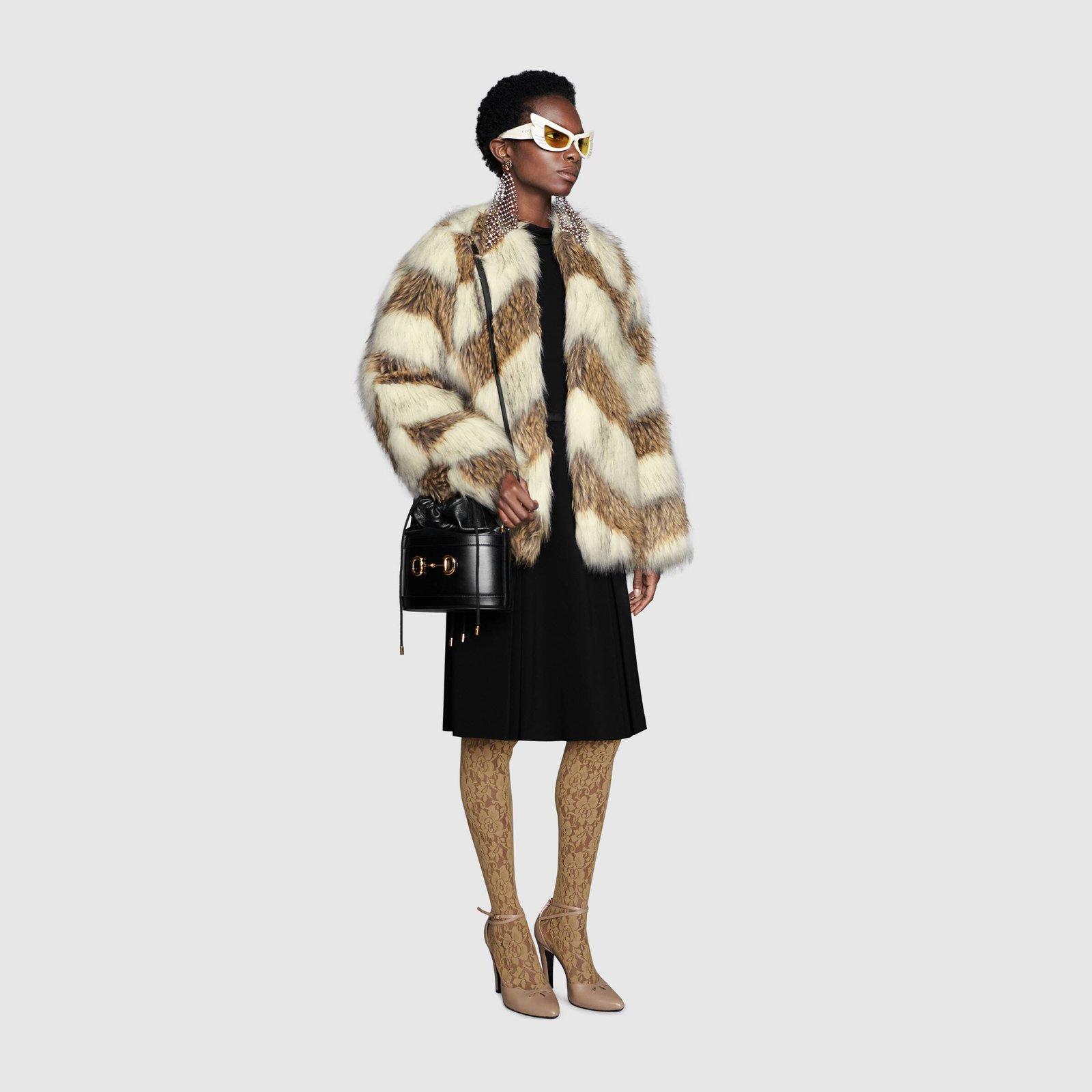 Inspired by archival designs, Gucci 1955 Horsebit bucket bag unifies the original details first introduced over six decades ago with a modern spirit, highlighting the Horsebit. Part of Gucci’s genetic code, the double ring and bar design has been established as one of the most distinctive elements among the House symbols borrowed from the equestrian world. The hardware is paired with a contemporary mix of materials, combining textured and soft white leather to create a unique tonal effect.