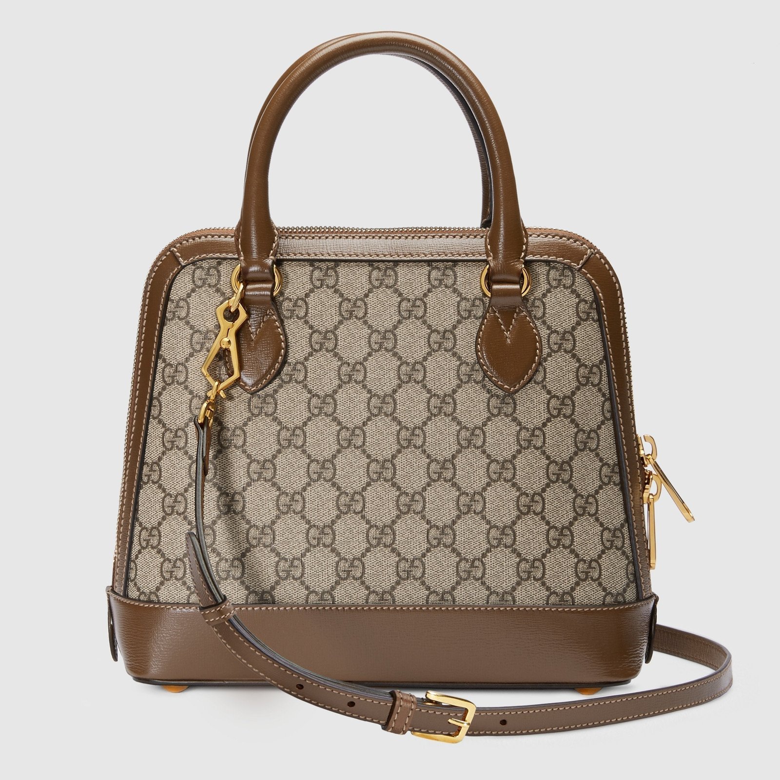 The Gucci 1955 Horsebit top handle has a domed shape with a detachable leather shoulder strap, crafted from GG Supreme canvas with white leather. The collection unifies details first introduced on the original bag that inspired the line from over six decades ago with a modern spirit, highlighting the Horsebit. Part of Gucci’s genetic code, the double ring and bar design has been established as one of the most distinctive elements among the House symbols borrowed from the equestrian world.