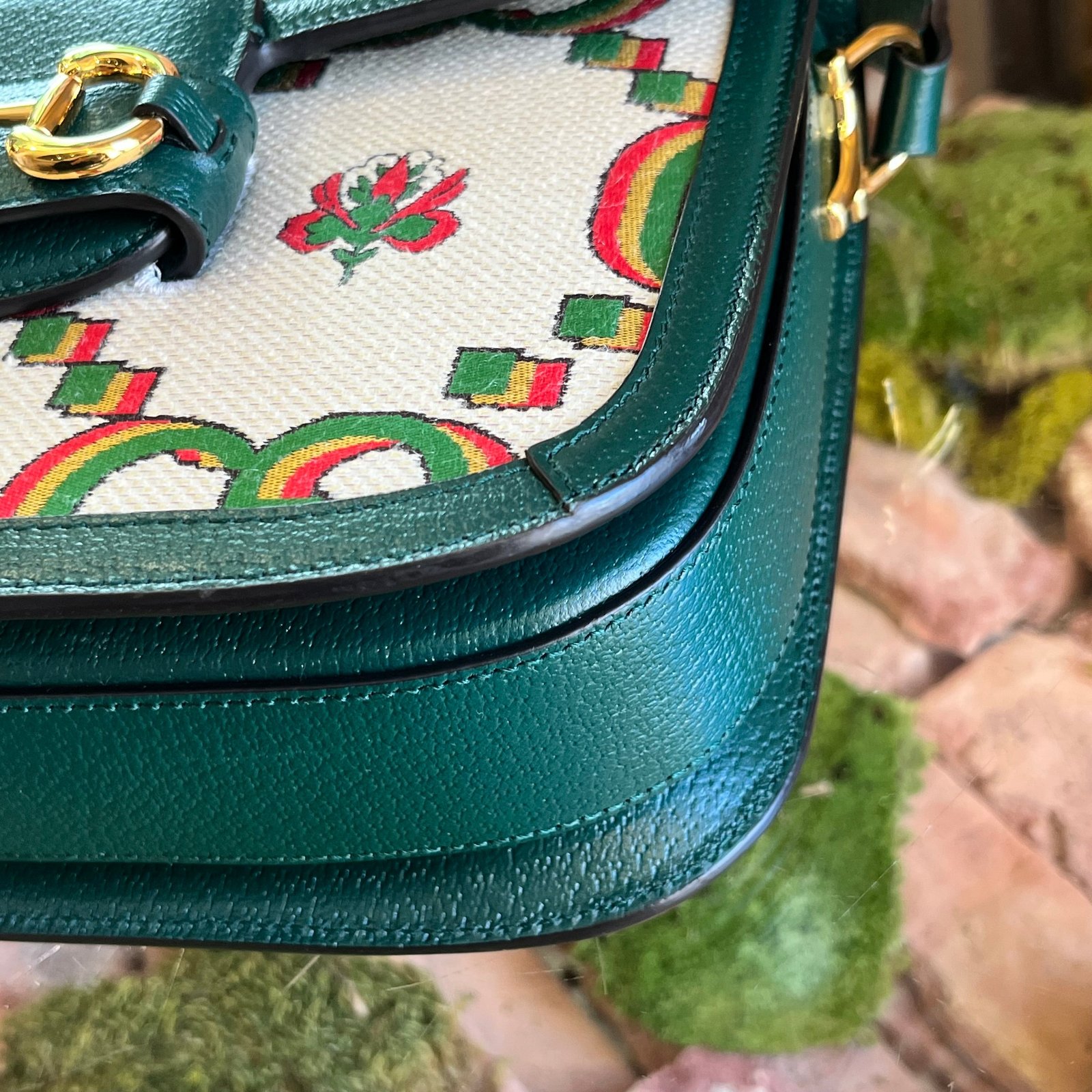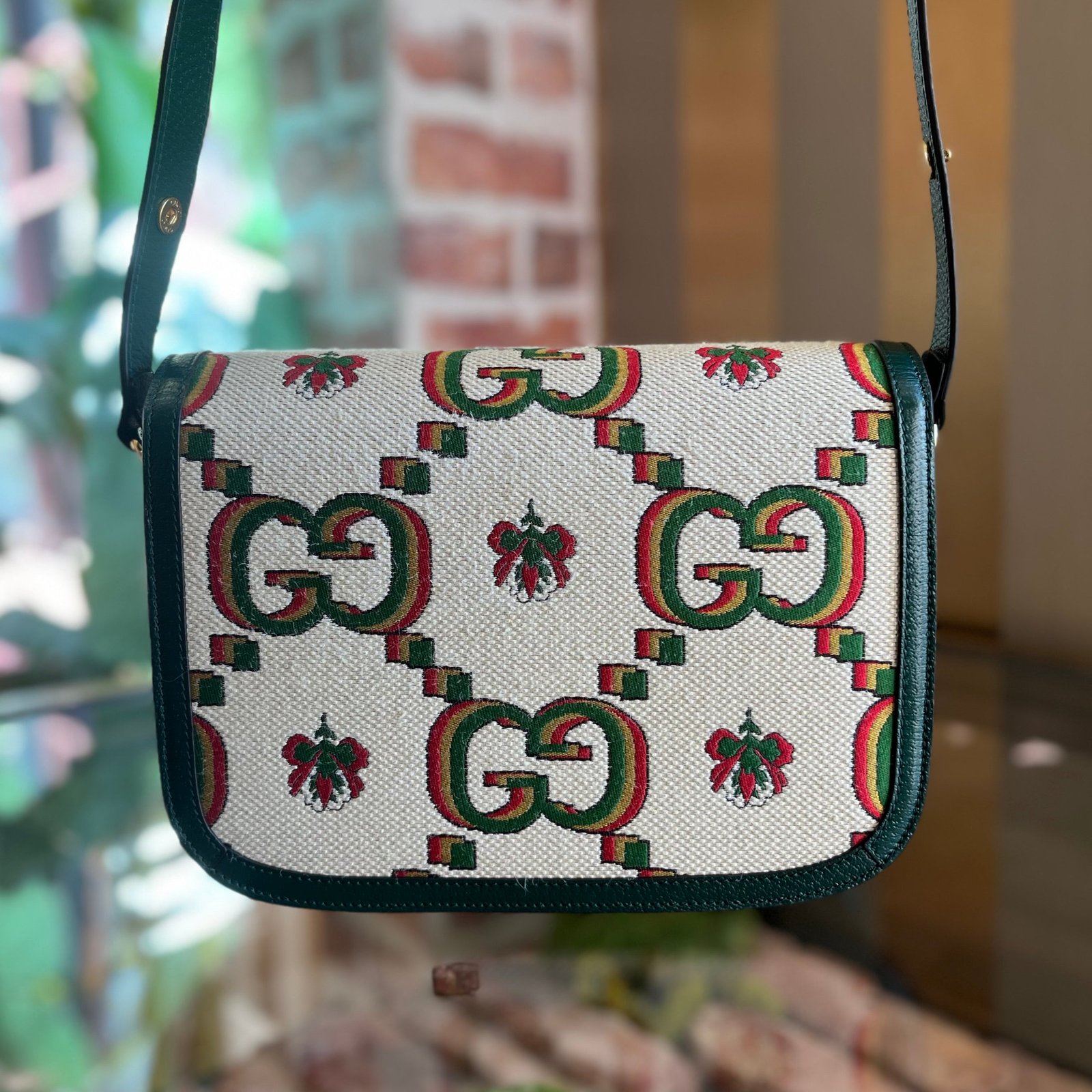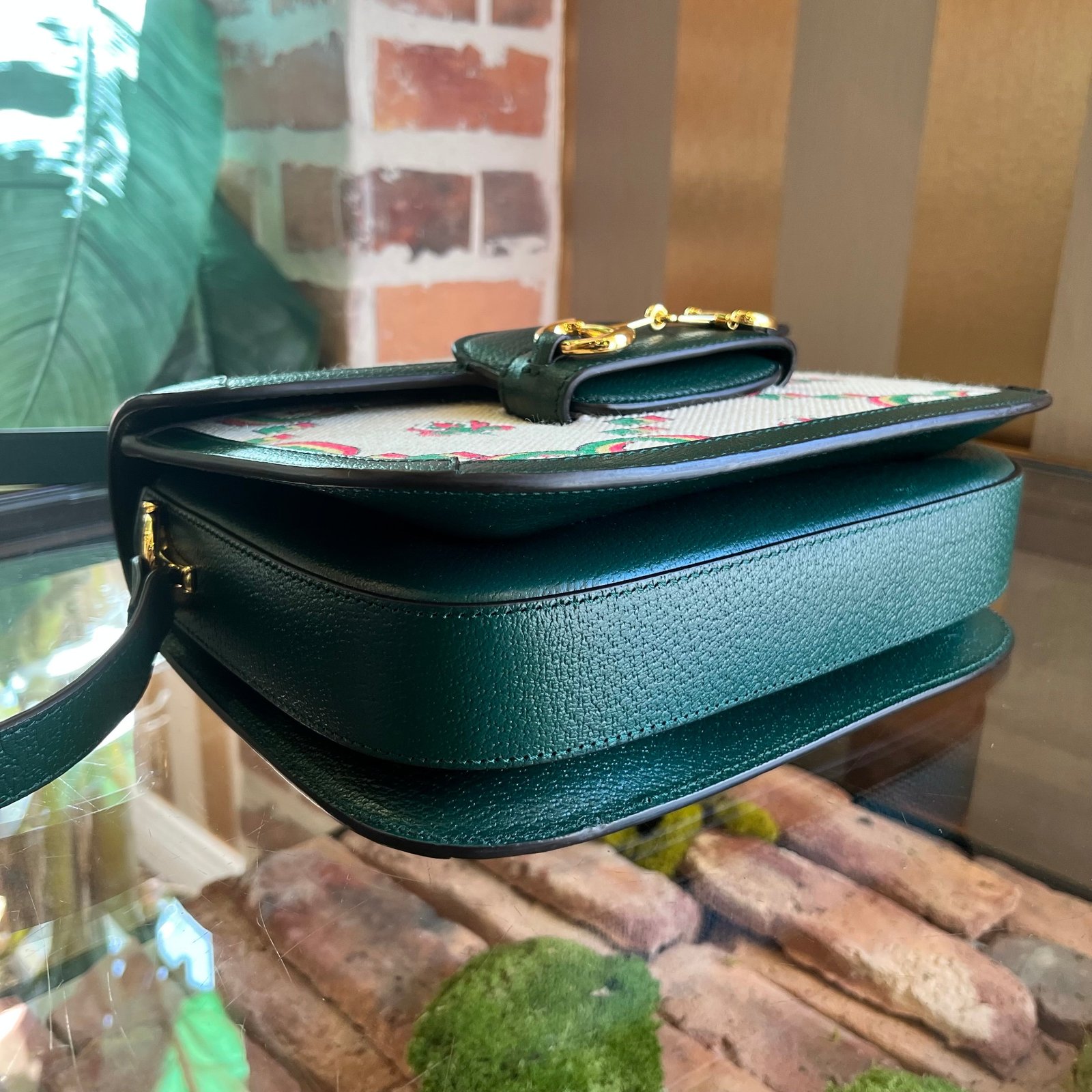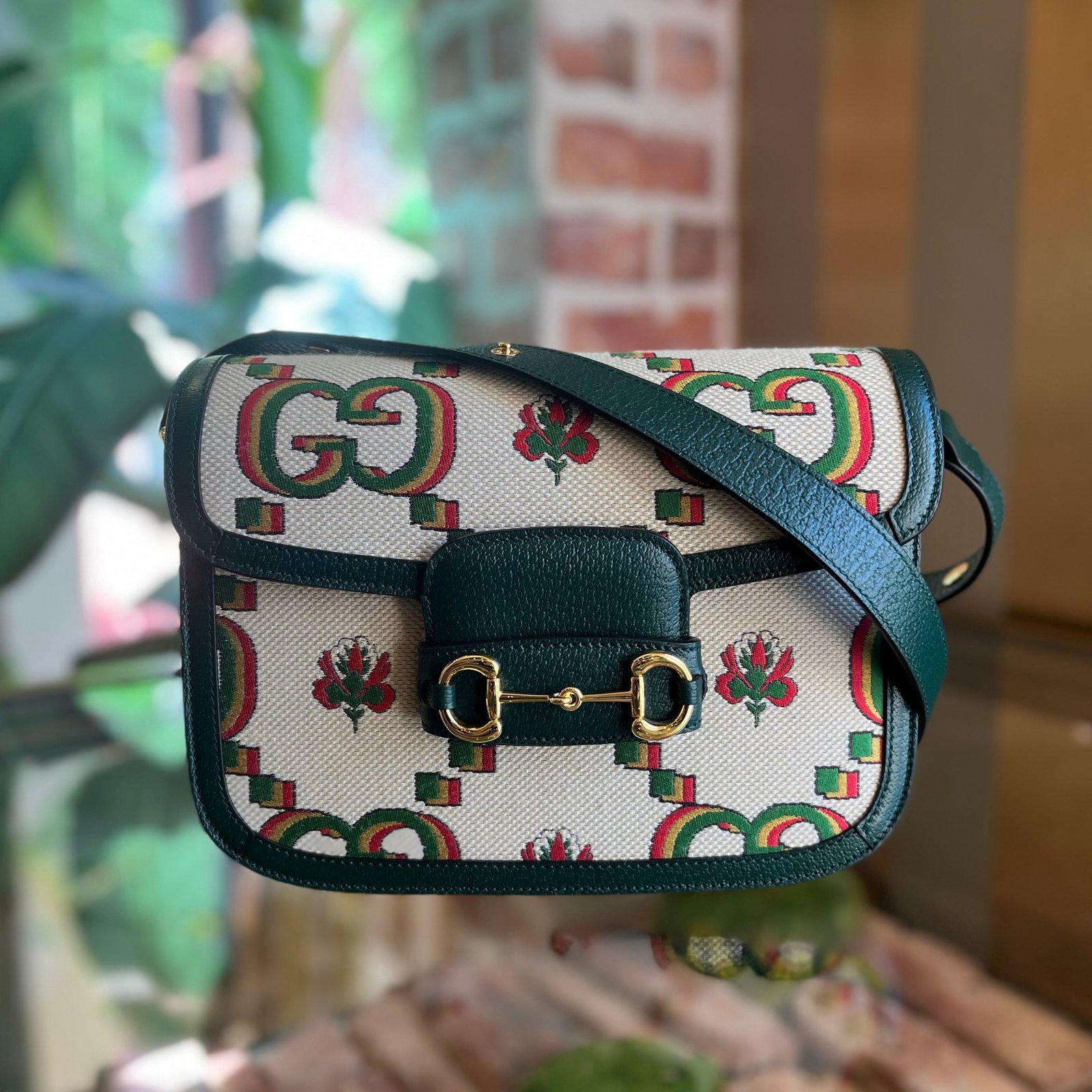 A vibrant celebration of Gucci’s heritage, this crossbody bag features a green and ivory floral GG monogram canvas, commemorating the brand’s 100th anniversary with a touch of whimsical elegance. Its compact design and iconic Horsebit detail make it a perfect blend of practicality and high-fashion allure, ideal for those who appreciate Italian luxury with a hint of retro flair. B+ Very Good Condition