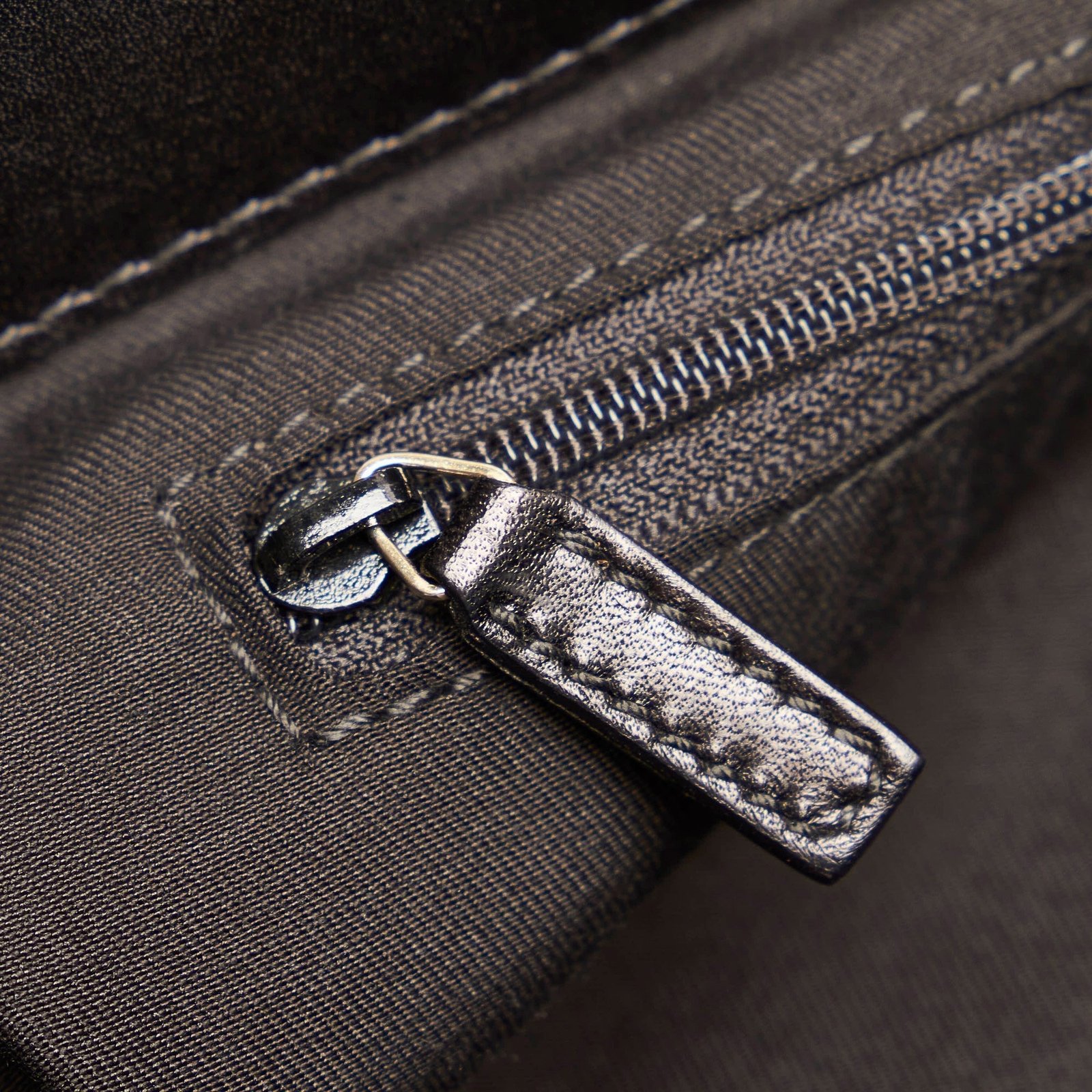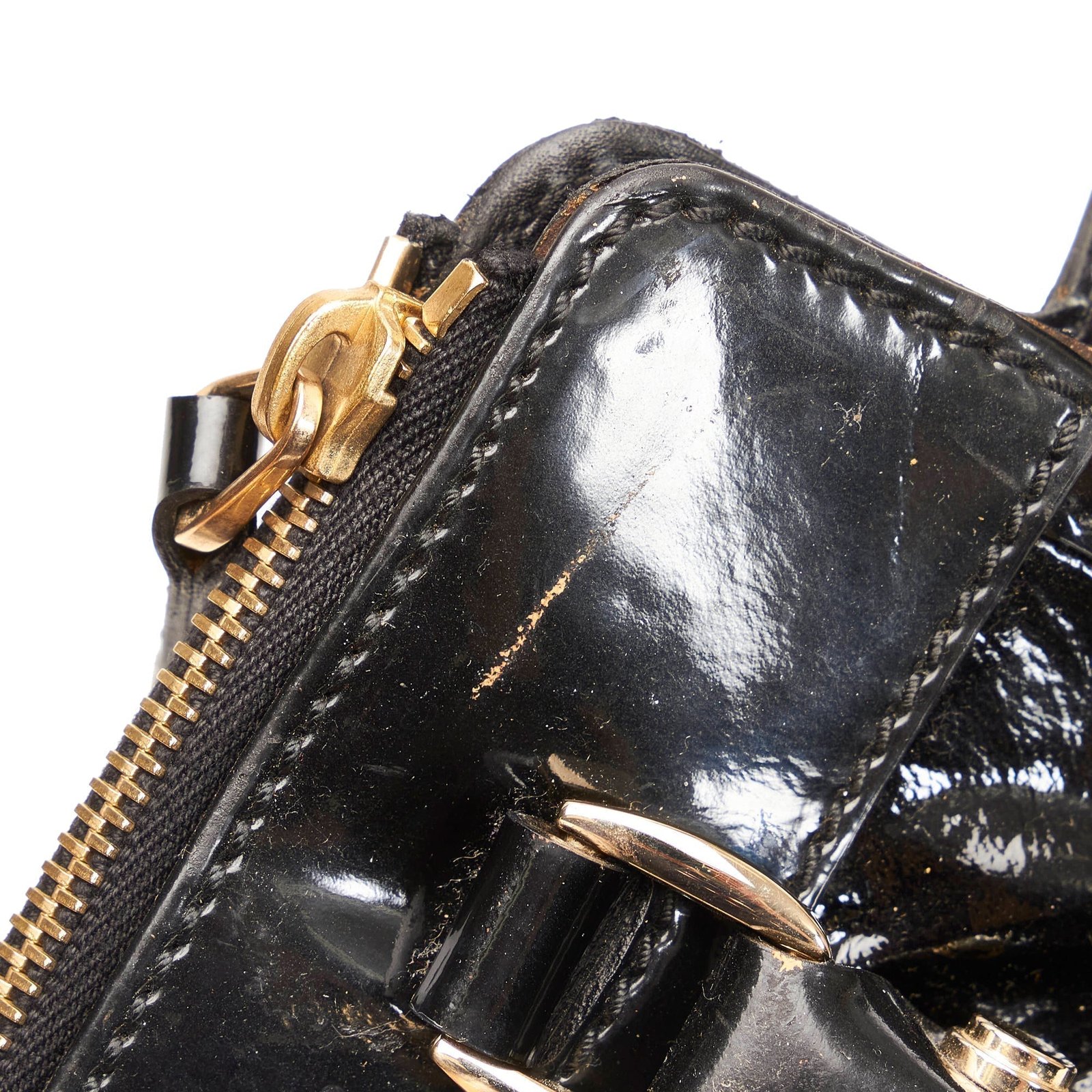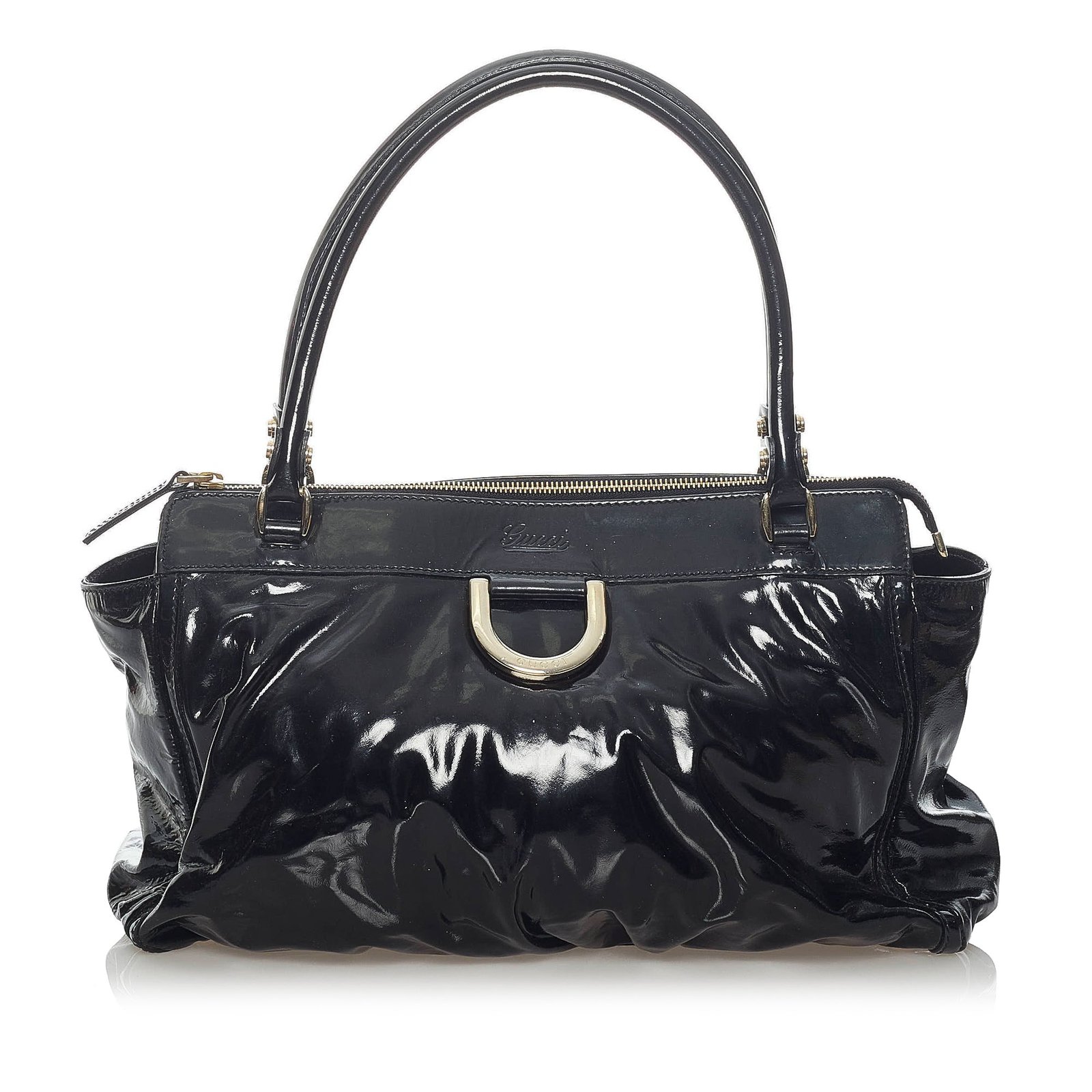 The Abbey D-Ring handbag features a patent leather body, rolled leather handles, a top zip closure, and interior zip and slip pockets.