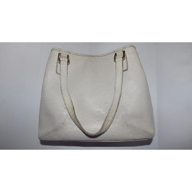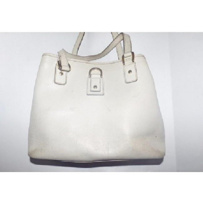 The bag is a satchel style purse with two straps. It has one interior compartment with smaller, interior pockets. This purse is called an ‘Abbey large D ring’ style! The purse is made of white, supple leather with od accents throughout.
