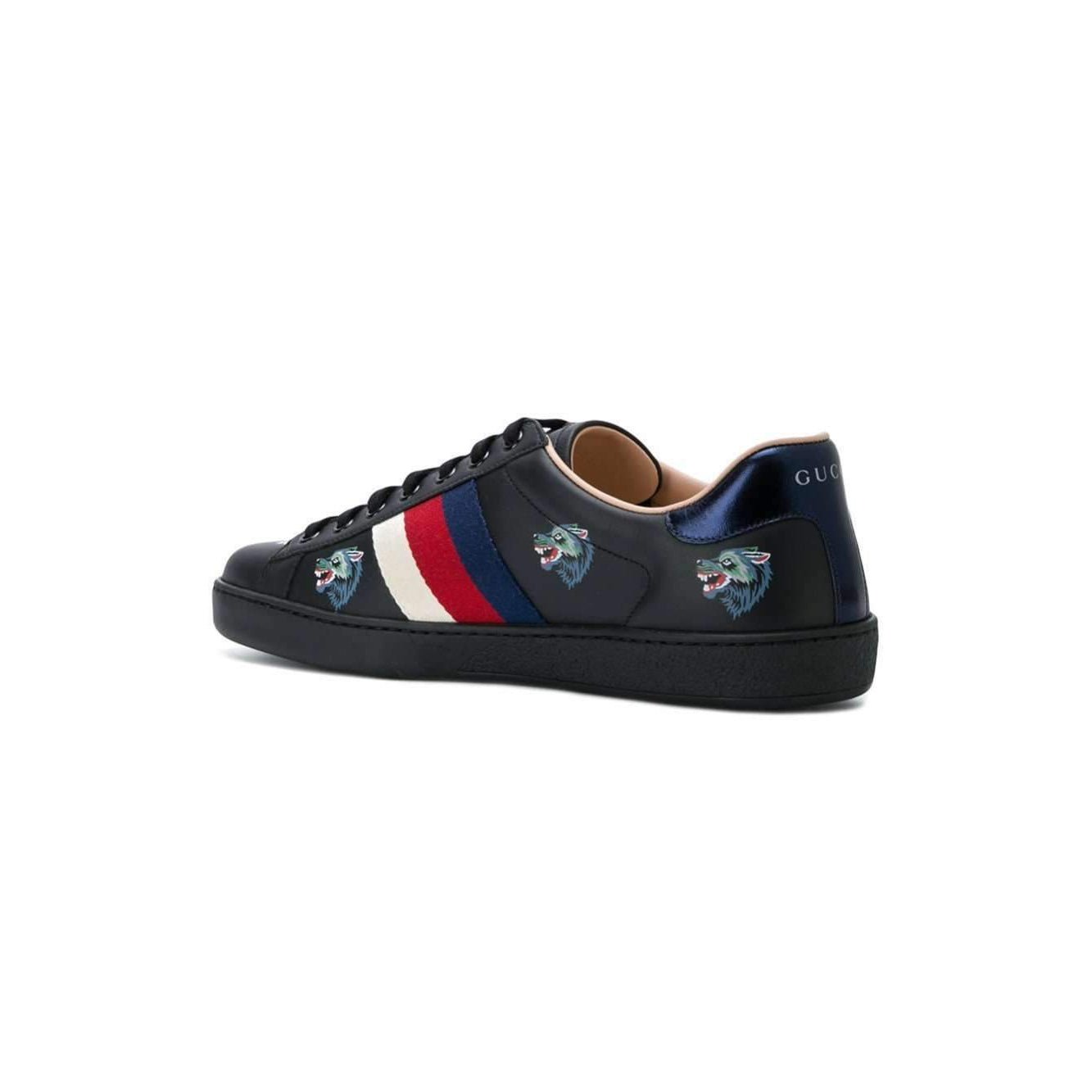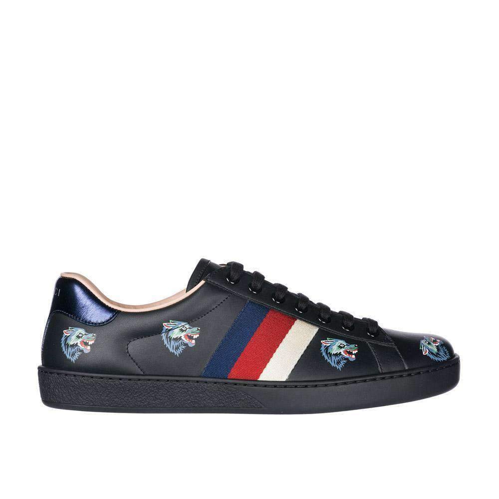- Gucci Ace Wolf Men’s Designer Shoes Black Embroidered Leather Sneakers Trainers 386750 OH810 (GGM1703)