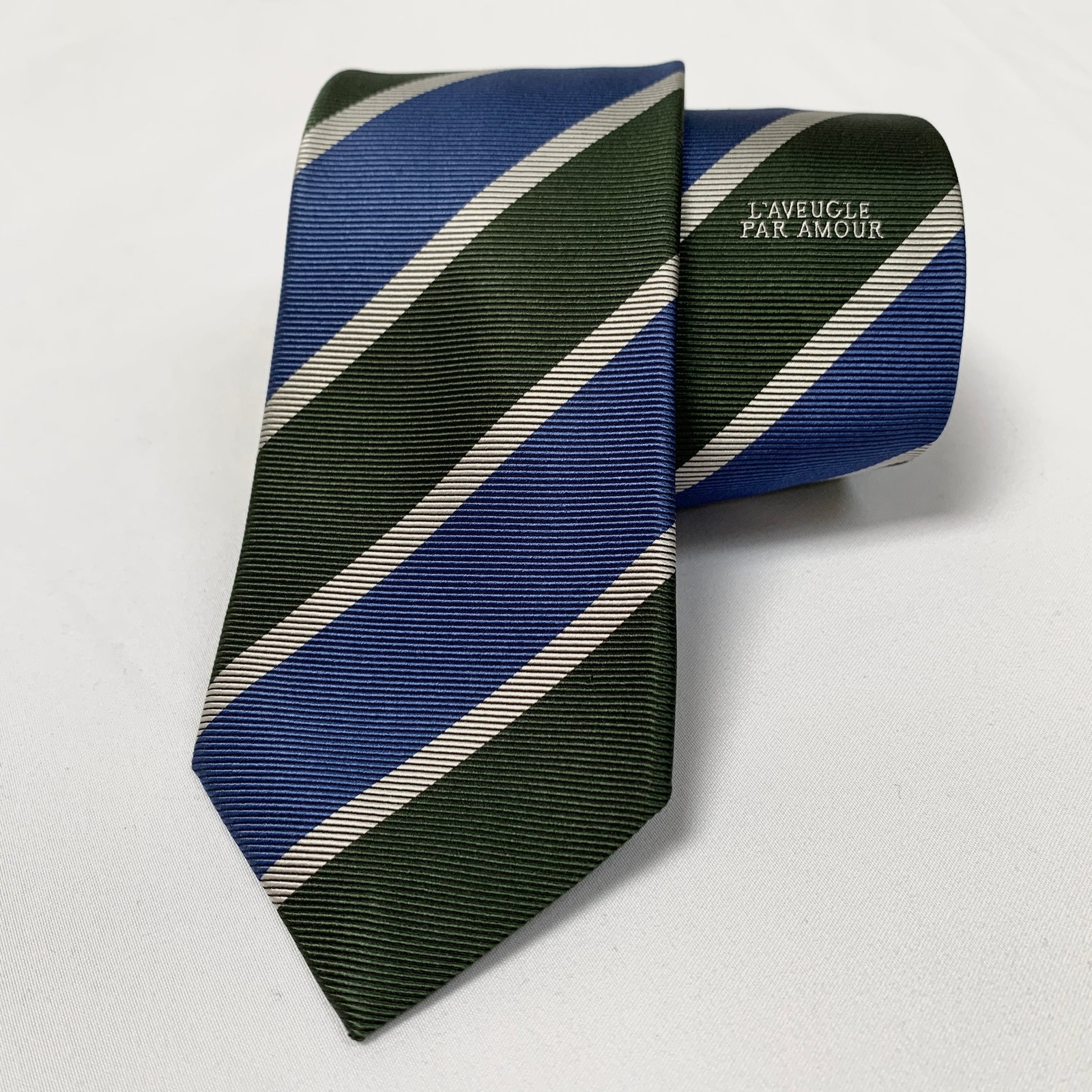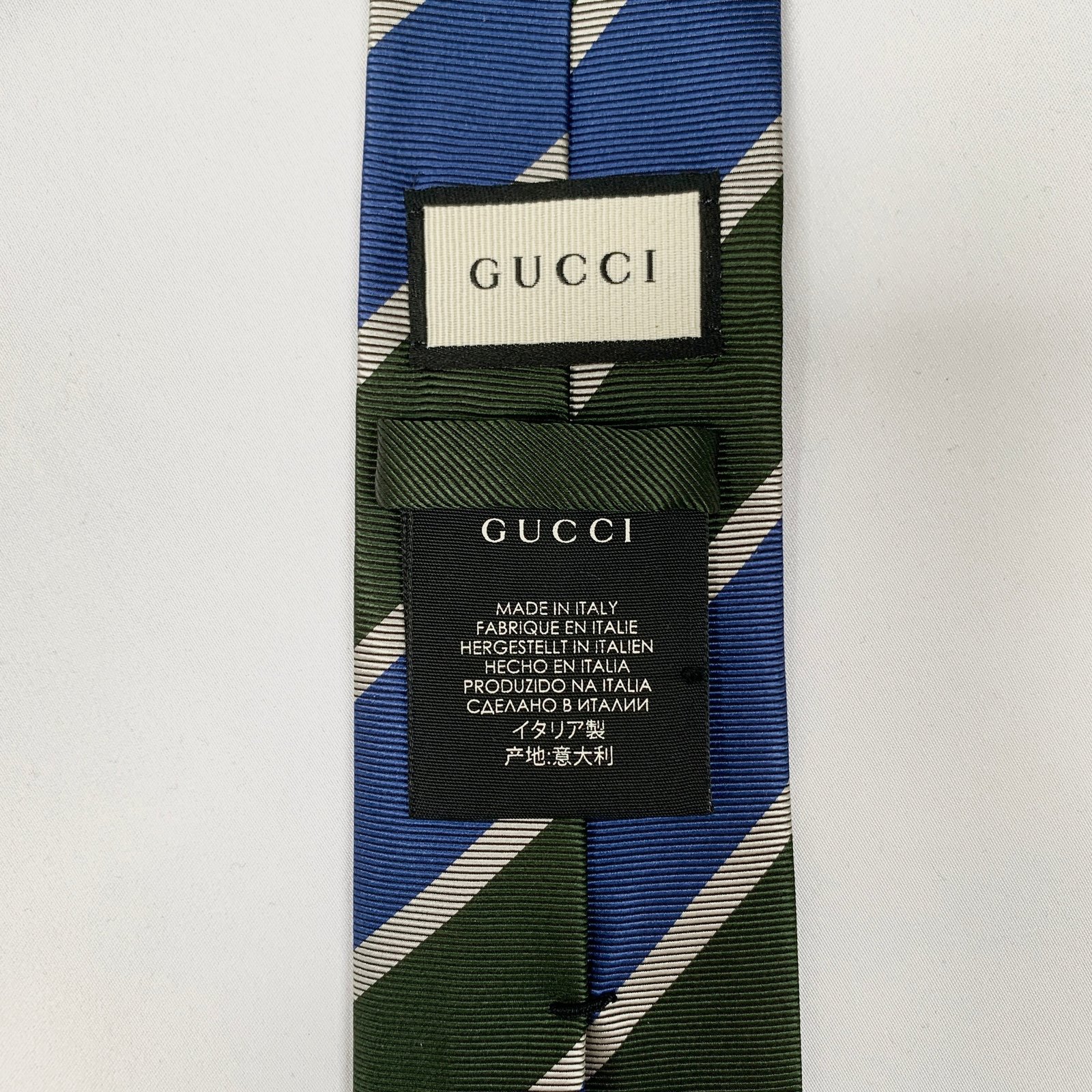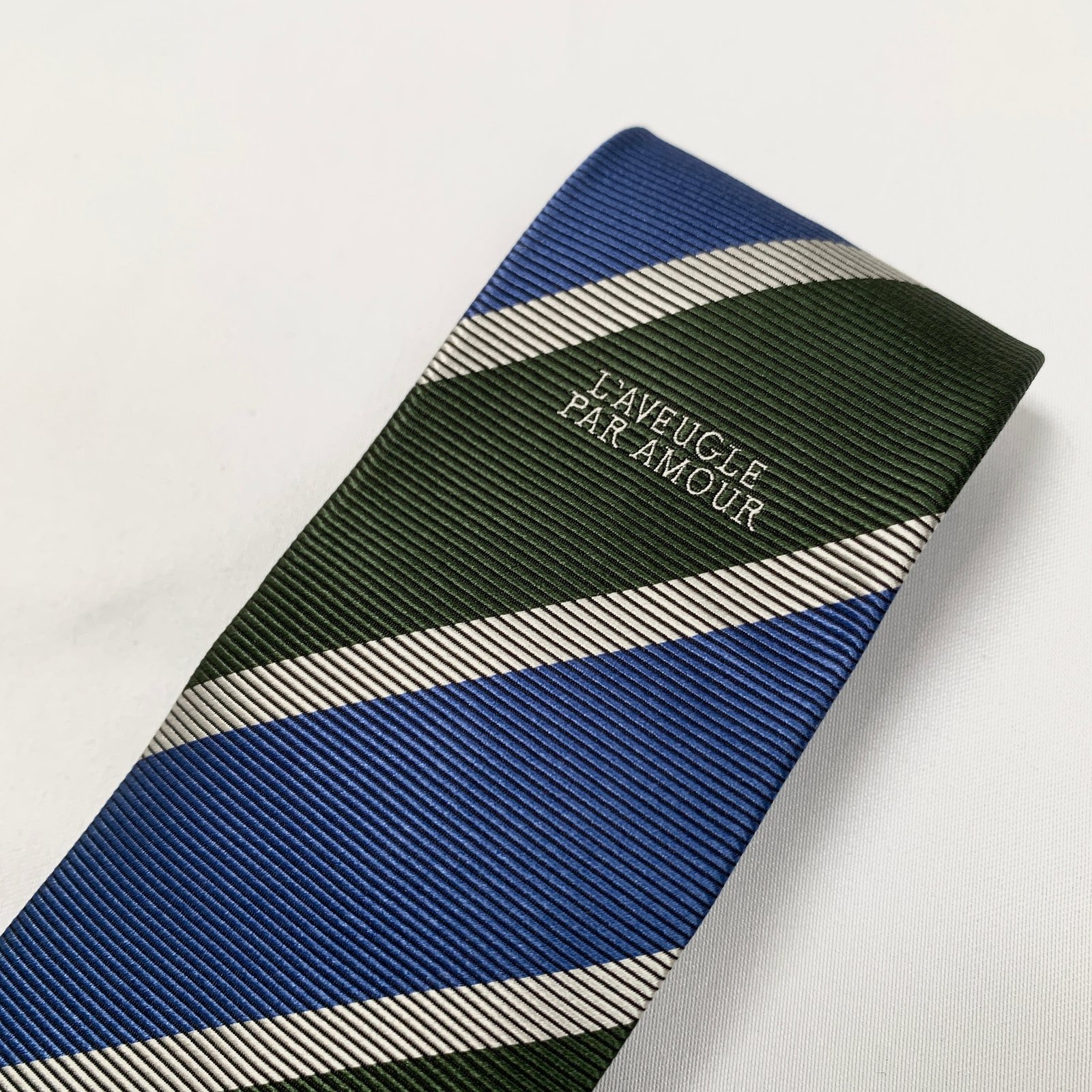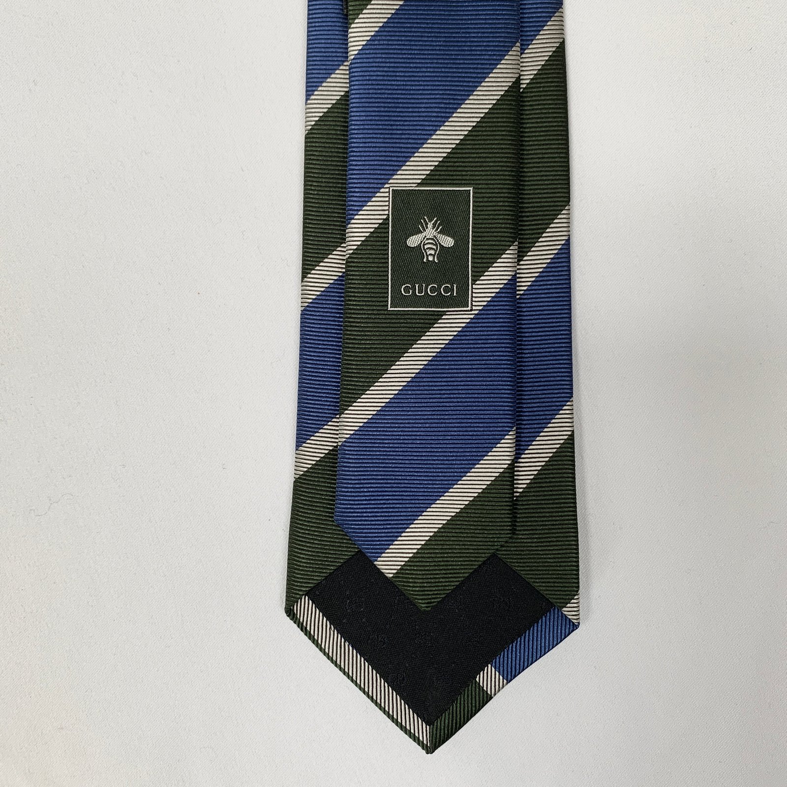 The Gucci Amoure Striped Neck Tie in Green and Blue is crafted in Italy from 100% woven silk. This classic tie features a blue and green striped pattern, an embroidered script of ‘L’Avengule Par Amoure’, and a bee emblem embroidered on the back.