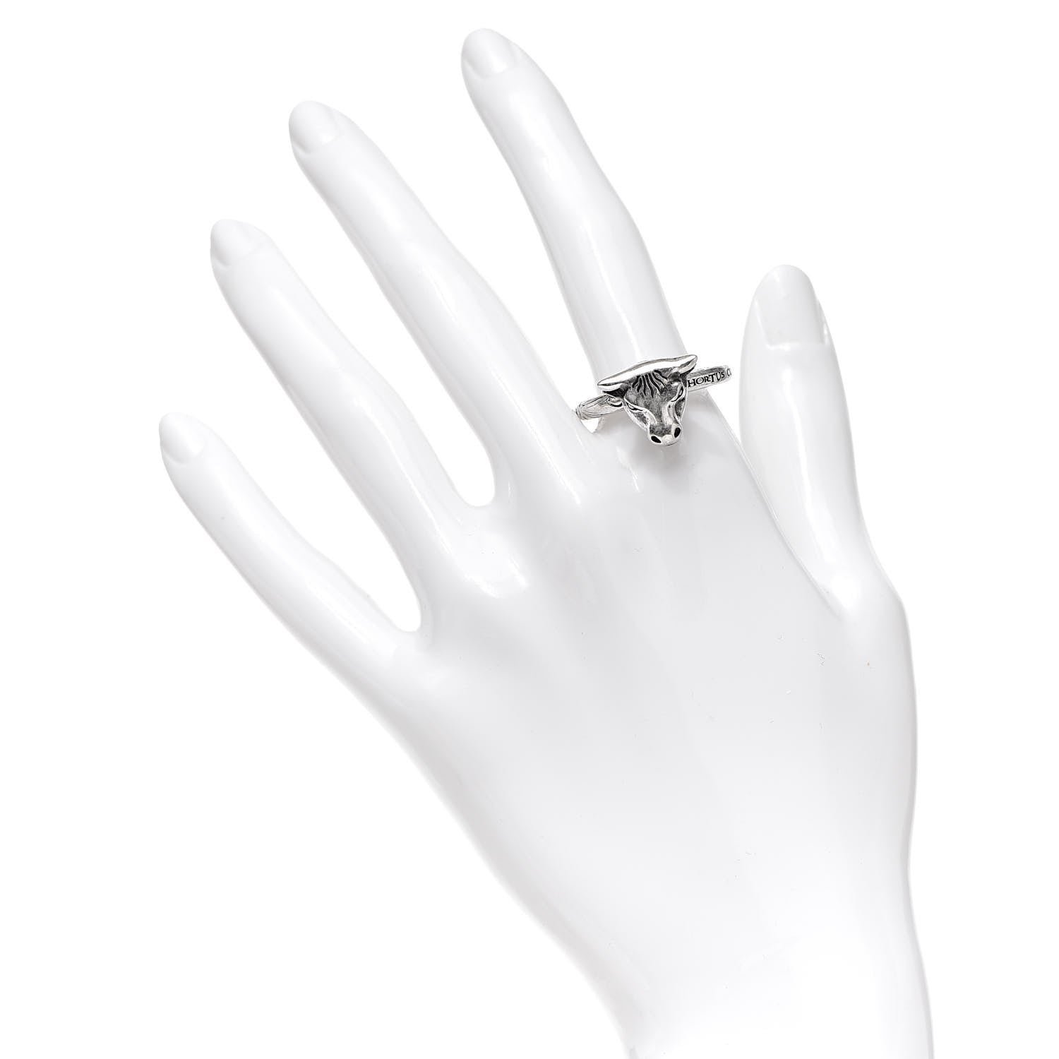 The Gucci Anger Forest Bulls Head Ring in Silver is crafted in Italy from sterling silver with an aged finish. This ring features a thin band with the words ‘Hortus Conclusus’ and a textured design, and a bulls head with the GG logo.