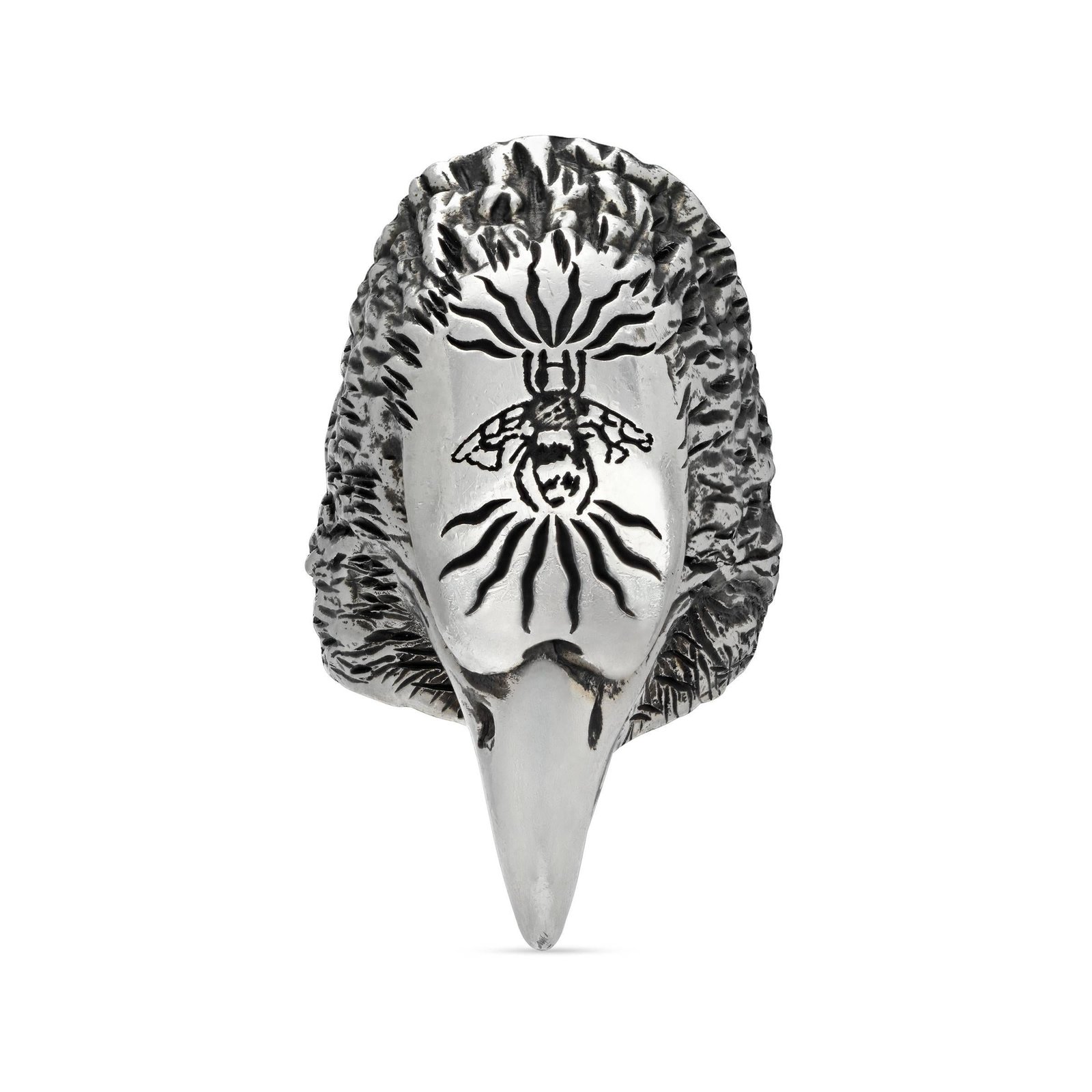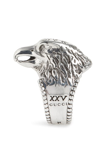 The Gucci Anger Forest Eagle Head Ring In Silver is crafted from sterling silver into a chunky ring in Italy. This ring is constructed into an eagle head and features a circle border, ‘XXV Gucci’, ‘Loved’, and a GG logo on the band, ‘Anger Forest’ engraved on the interior, and a design on the eagle’s head.