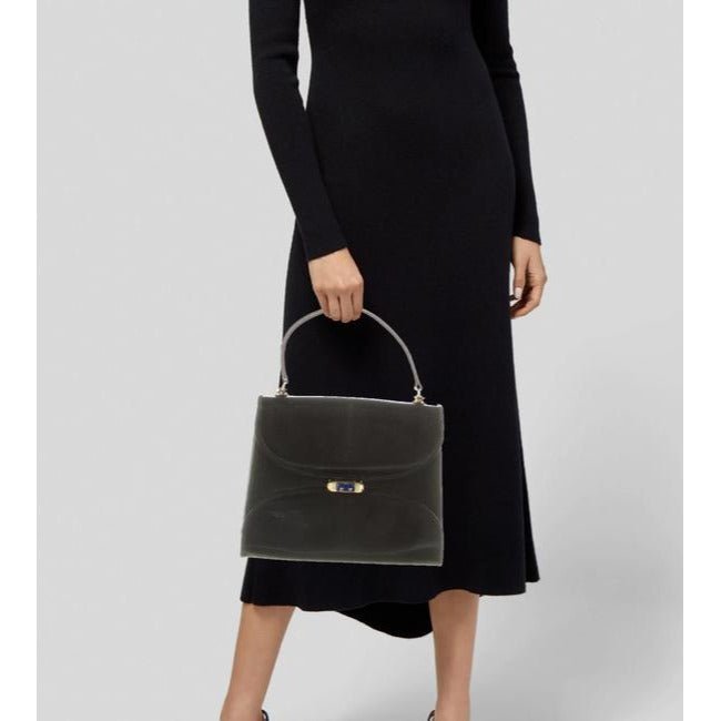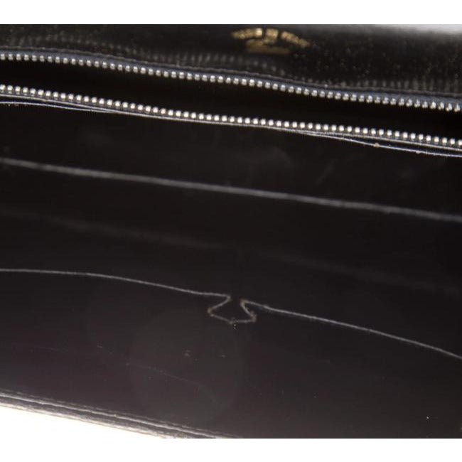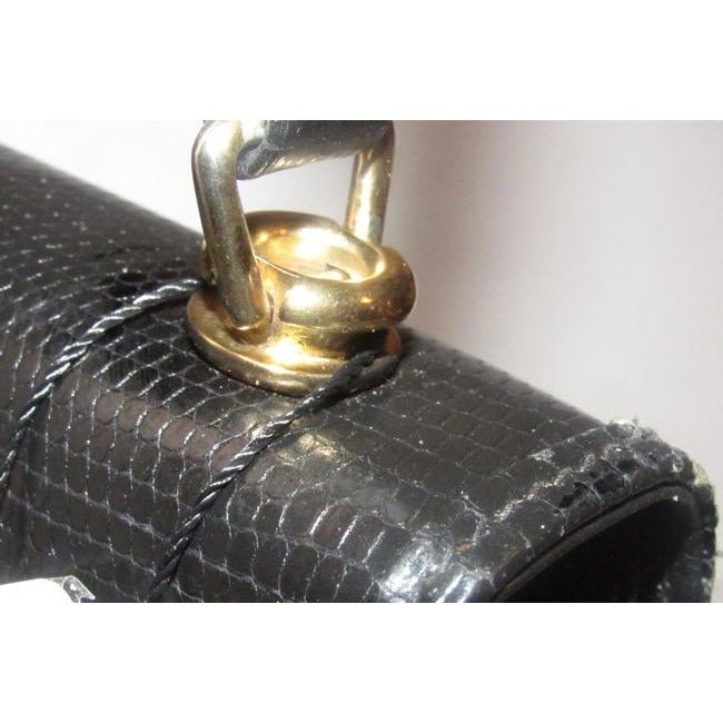 The bag is a Kelly style satchel made with glossy black lizard skin leather with a beautiful, blue, lapis lazuli accent at the clasp and bold gold hardware. It is a handheld style Kelly purse with a hard, rolled strap, an envelope top closure, a hidden pocket at the front with a fold-over top, and an exterior back pocket. This purse is designed in such a classic and smart style! The purse was made during the 1960’s, when Gucci started to and could be dressy or casual.